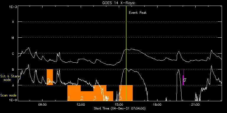 EIS Observation timeline overlay to GOES-Xray curve Code 1" 2" 40" 266" EIS Observations list for this event: STUDY ACRONYM ID DATE OBSERVED DESCRIPTION NOAA# TARGET 0 PCH_SNS_2x512 | 79984 | 2021/12/04 09:20:18 | HOP 394 (South Polar Coronal Hole Obse | | Coronal Hole TIMELINE ID DATE OBSERVED FITS FILE XCEN (+W/-E) YCEN (+N/-S) DUR ----------------------------------------------------------------------------------------------------------------- 79984 | 2021/12/04 09:20:18.000 | eis_l0_20211204_092018.fits.gz | -9900.15 | -10111.20 | 27m19s 1 HPW021VEL260x512v2 | 80005 | 2021/12/04 10:58:11 | Active Region Studies | | Active Region TIMELINE ID DATE OBSERVED FITS FILE XCEN (+W/-E) YCEN (+N/-S) DUR ----------------------------------------------------------------------------------------------------------------- 80005 | 2021/12/04 10:58:11.000 | eis_l0_20211204_105811.fits.gz | 89.68 | 254.88 | 1h0m45s 2 HPW021VEL260x512v2 | 80006 | 2021/12/04 11:59:03 | Active Region Studies | | Active Region TIMELINE ID DATE OBSERVED FITS FILE XCEN (+W/-E) YCEN (+N/-S) DUR ----------------------------------------------------------------------------------------------------------------- 80006 | 2021/12/04 11:59:03.000 | eis_l0_20211204_115903.fits.gz | 98.72 | 254.88 | 1h0m45s 3 HPW021VEL260x512v2 | 80007 | 2021/12/04 12:59:56 | Active Region Studies | | Active Region TIMELINE ID DATE OBSERVED FITS FILE XCEN (+W/-E) YCEN (+N/-S) DUR ----------------------------------------------------------------------------------------------------------------- 80007 | 2021/12/04 12:59:56.000 | eis_l0_20211204_125956.fits.gz | 107.83 | 255.03 | 1h0m44s 4 Atlas_30 | 80028 | 2021/12/04 14:00:47 | Active Region Studies | | Quiet Sun TIMELINE ID DATE OBSERVED FITS FILE XCEN (+W/-E) YCEN (+N/-S) DUR ----------------------------------------------------------------------------------------------------------------- 80028 | 2021/12/04 14:00:47.000 | eis_l0_20211204_140047.fits.gz | 117.04 | 255.03 | 31m40s 5 Atlas_60 | 80029 | 2021/12/04 15:01:44 | Active Region Studies | | Quiet Sun TIMELINE ID DATE OBSERVED FITS FILE XCEN (+W/-E) YCEN (+N/-S) DUR ----------------------------------------------------------------------------------------------------------------- 80029 | 2021/12/04 15:01:44.000 | eis_l0_20211204_150144.fits.gz | 126.16 | 255.11 | 1h1m39s 6 regcal074 | 80041 | 2021/12/04 20:00:12 | Dark exposures including overscan pixe | | Engineering TIMELINE ID DATE OBSERVED FITS FILE XCEN (+W/-E) YCEN (+N/-S) DUR ----------------------------------------------------------------------------------------------------------------- 80041 | 2021/12/04 20:00:12.000 | eis_l0_20211204_200012.fits.gz | 192.57 | 424.73 | 3m22s 7 regcal076 | 80042 | 2021/12/04 20:04:01 | Flatfield, 1 exposure, led 100ms, ccd | | Engineering TIMELINE ID DATE OBSERVED FITS FILE XCEN (+W/-E) YCEN (+N/-S) DUR ----------------------------------------------------------------------------------------------------------------- 80042 | 2021/12/04 20:04:01.000 | eis_l0_20211204_200401.fits.gz | 193.18 | 168.57 | 1s : Check study information : Download file : View thumbnails For this event, also check for: