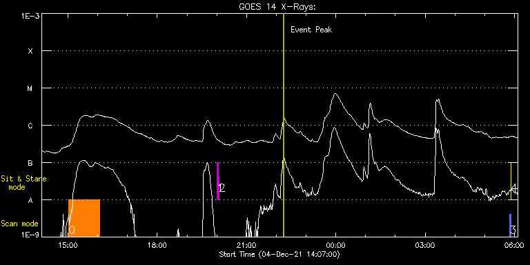 EIS Observation timeline overlay to GOES-Xray curve Code 1" 2" 40" 266" EIS Observations list for this event: STUDY ACRONYM ID DATE OBSERVED DESCRIPTION NOAA# TARGET 0 Atlas_60 | 80029 | 2021/12/04 15:01:44 | Active Region Studies | | Quiet Sun TIMELINE ID DATE OBSERVED FITS FILE XCEN (+W/-E) YCEN (+N/-S) DUR ----------------------------------------------------------------------------------------------------------------- 80029 | 2021/12/04 15:01:44.000 | eis_l0_20211204_150144.fits.gz | 126.16 | 255.11 | 1h1m39s 1 regcal074 | 80041 | 2021/12/04 20:00:12 | Dark exposures including overscan pixe | | Engineering TIMELINE ID DATE OBSERVED FITS FILE XCEN (+W/-E) YCEN (+N/-S) DUR ----------------------------------------------------------------------------------------------------------------- 80041 | 2021/12/04 20:00:12.000 | eis_l0_20211204_200012.fits.gz | 192.57 | 424.73 | 3m22s 2 regcal076 | 80042 | 2021/12/04 20:04:01 | Flatfield, 1 exposure, led 100ms, ccd | | Engineering TIMELINE ID DATE OBSERVED FITS FILE XCEN (+W/-E) YCEN (+N/-S) DUR ----------------------------------------------------------------------------------------------------------------- 80042 | 2021/12/04 20:04:01.000 | eis_l0_20211204_200401.fits.gz | 193.18 | 168.57 | 1s 3 PRY_slot_contextLITE | 79978 | 2021/12/05 05:50:20 | Pointing Monitoring | | Active Region TIMELINE ID DATE OBSERVED FITS FILE XCEN (+W/-E) YCEN (+N/-S) DUR ----------------------------------------------------------------------------------------------------------------- 79978 | 2021/12/05 05:50:20.000 | eis_l0_20211205_055020.fits.gz | -15.21 | -0.50 | 2m56s 4 XRT_synop_AIA | 79979 | 2021/12/05 05:53:34 | Pointing Monitoring | | Quiet Sun TIMELINE ID DATE OBSERVED FITS FILE XCEN (+W/-E) YCEN (+N/-S) DUR ----------------------------------------------------------------------------------------------------------------- 79979 | 2021/12/05 05:53:34.000 | eis_l0_20211205_055334.fits.gz | -132.49 | -0.50 | 10s : Check study information : Download file : View thumbnails For this event, also check for:
