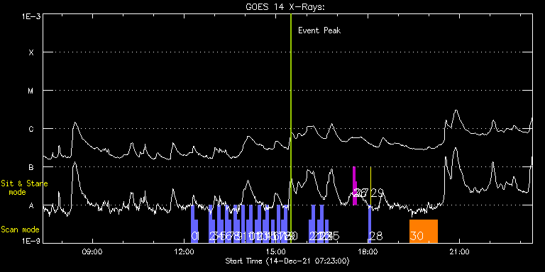 EIS Observation timeline overlay to GOES-Xray curve Code 1" 2" 40" 266" EIS Observations list for this event: STUDY ACRONYM ID DATE OBSERVED DESCRIPTION NOAA# TARGET 0 full_sun_slot_scan_2 | 80095 | 2021/12/14 12:14:20 | HOP 130 - Full Disk Slot Scan | | Quiet Sun TIMELINE ID DATE OBSERVED FITS FILE XCEN (+W/-E) YCEN (+N/-S) DUR ----------------------------------------------------------------------------------------------------------------- 80095 | 2021/12/14 12:14:20.000 | eis_l0_20211214_121420.fits.gz | 888.60 | 187.65 | 5m27s 1 full_sun_slot_scan_2 | 80097 | 2021/12/14 12:20:19 | HOP 130 - Full Disk Slot Scan | | Quiet Sun TIMELINE ID DATE OBSERVED FITS FILE XCEN (+W/-E) YCEN (+N/-S) DUR ----------------------------------------------------------------------------------------------------------------- 80097 | 2021/12/14 12:20:19.000 | eis_l0_20211214_122019.fits.gz | 888.52 | -284.35 | 5m27s 2 full_sun_slot_scan_2 | 80100 | 2021/12/14 12:48:43 | HOP 130 - Full Disk Slot Scan | | Quiet Sun TIMELINE ID DATE OBSERVED FITS FILE XCEN (+W/-E) YCEN (+N/-S) DUR ----------------------------------------------------------------------------------------------------------------- 80100 | 2021/12/14 12:48:43.000 | eis_l0_20211214_124843.fits.gz | 420.55 | 187.50 | 5m28s 3 full_sun_slot_scan_2 | 80101 | 2021/12/14 12:54:16 | HOP 130 - Full Disk Slot Scan | | Quiet Sun TIMELINE ID DATE OBSERVED FITS FILE XCEN (+W/-E) YCEN (+N/-S) DUR ----------------------------------------------------------------------------------------------------------------- 80101 | 2021/12/14 12:54:16.000 | eis_l0_20211214_125416.fits.gz | 420.48 | -284.50 | 5m26s 4 full_sun_slot_scan_2 | 80102 | 2021/12/14 13:04:43 | HOP 130 - Full Disk Slot Scan | | Quiet Sun TIMELINE ID DATE OBSERVED FITS FILE XCEN (+W/-E) YCEN (+N/-S) DUR ----------------------------------------------------------------------------------------------------------------- 80102 | 2021/12/14 13:04:43.000 | eis_l0_20211214_130443.fits.gz | -47.57 | 187.50 | 5m27s 5 full_sun_slot_scan_2 | 80103 | 2021/12/14 13:10:16 | HOP 130 - Full Disk Slot Scan | 2905 | Quiet Sun TIMELINE ID DATE OBSERVED FITS FILE XCEN (+W/-E) YCEN (+N/-S) DUR ----------------------------------------------------------------------------------------------------------------- 80103 | 2021/12/14 13:10:16.000 | eis_l0_20211214_131016.fits.gz | -47.49 | -284.42 | 5m26s 6 full_sun_slot_scan_2 | 80104 | 2021/12/14 13:20:43 | HOP 130 - Full Disk Slot Scan | | Quiet Sun TIMELINE ID DATE OBSERVED FITS FILE XCEN (+W/-E) YCEN (+N/-S) DUR ----------------------------------------------------------------------------------------------------------------- 80104 | 2021/12/14 13:20:43.000 | eis_l0_20211214_132043.fits.gz | -515.53 | 187.65 | 5m27s 7 full_sun_slot_scan_2 | 80105 | 2021/12/14 13:26:16 | HOP 130 - Full Disk Slot Scan | 2906 | Quiet Sun TIMELINE ID DATE OBSERVED FITS FILE XCEN (+W/-E) YCEN (+N/-S) DUR ----------------------------------------------------------------------------------------------------------------- 80105 | 2021/12/14 13:26:16.000 | eis_l0_20211214_132616.fits.gz | -515.45 | -284.42 | 5m26s 8 full_sun_slot_scan_2 | 80106 | 2021/12/14 13:36:43 | HOP 130 - Full Disk Slot Scan | | Quiet Sun TIMELINE ID DATE OBSERVED FITS FILE XCEN (+W/-E) YCEN (+N/-S) DUR ----------------------------------------------------------------------------------------------------------------- 80106 | 2021/12/14 13:36:43.000 | eis_l0_20211214_133643.fits.gz | -9916.89 | -9775.20 | 5m27s 9 full_sun_slot_scan_2 | 80107 | 2021/12/14 13:42:16 | HOP 130 - Full Disk Slot Scan | | Quiet Sun TIMELINE ID DATE OBSERVED FITS FILE XCEN (+W/-E) YCEN (+N/-S) DUR ----------------------------------------------------------------------------------------------------------------- 80107 | 2021/12/14 13:42:16.000 | eis_l0_20211214_134216.fits.gz | -9916.89 | -10247.20 | 5m26s 10 full_sun_slot_scan_2 | 80108 | 2021/12/14 13:52:43 | HOP 130 - Full Disk Slot Scan | | Quiet Sun TIMELINE ID DATE OBSERVED FITS FILE XCEN (+W/-E) YCEN (+N/-S) DUR ----------------------------------------------------------------------------------------------------------------- 80108 | 2021/12/14 13:52:43.000 | eis_l0_20211214_135243.fits.gz | 695.09 | 657.71 | 5m28s 11 full_sun_slot_scan_2 | 80109 | 2021/12/14 14:02:43 | HOP 130 - Full Disk Slot Scan | | Quiet Sun TIMELINE ID DATE OBSERVED FITS FILE XCEN (+W/-E) YCEN (+N/-S) DUR ----------------------------------------------------------------------------------------------------------------- 80109 | 2021/12/14 14:02:43.000 | eis_l0_20211214_140243.fits.gz | 363.62 | 1034.67 | 5m28s 12 full_sun_slot_scan_2 | 80110 | 2021/12/14 14:08:16 | HOP 130 - Full Disk Slot Scan | | Quiet Sun TIMELINE ID DATE OBSERVED FITS FILE XCEN (+W/-E) YCEN (+N/-S) DUR ----------------------------------------------------------------------------------------------------------------- 80110 | 2021/12/14 14:08:16.000 | eis_l0_20211214_140816.fits.gz | 363.62 | 562.60 | 5m27s 13 full_sun_slot_scan_2 | 80111 | 2021/12/14 14:18:44 | HOP 130 - Full Disk Slot Scan | | Quiet Sun TIMELINE ID DATE OBSERVED FITS FILE XCEN (+W/-E) YCEN (+N/-S) DUR ----------------------------------------------------------------------------------------------------------------- 80111 | 2021/12/14 14:18:44.000 | eis_l0_20211214_141844.fits.gz | -47.49 | 1128.69 | 5m27s 14 full_sun_slot_scan_2 | 80112 | 2021/12/14 14:24:16 | HOP 130 - Full Disk Slot Scan | | Quiet Sun TIMELINE ID DATE OBSERVED FITS FILE XCEN (+W/-E) YCEN (+N/-S) DUR ----------------------------------------------------------------------------------------------------------------- 80112 | 2021/12/14 14:24:16.000 | eis_l0_20211214_142416.fits.gz | -47.41 | 656.61 | 5m27s 15 full_sun_slot_scan_2 | 80113 | 2021/12/14 14:34:43 | HOP 130 - Full Disk Slot Scan | | Quiet Sun TIMELINE ID DATE OBSERVED FITS FILE XCEN (+W/-E) YCEN (+N/-S) DUR --------------------------------------------------------------------------------------