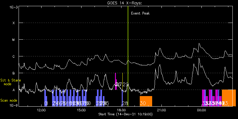 EIS Observation timeline overlay to GOES-Xray curve Code 1" 2" 40" 266" EIS Observations list for this event: STUDY ACRONYM ID DATE OBSERVED DESCRIPTION NOAA# TARGET 0 full_sun_slot_scan_2 | 80095 | 2021/12/14 12:14:20 | HOP 130 - Full Disk Slot Scan | | Quiet Sun TIMELINE ID DATE OBSERVED FITS FILE XCEN (+W/-E) YCEN (+N/-S) DUR ----------------------------------------------------------------------------------------------------------------- 80095 | 2021/12/14 12:14:20.000 | eis_l0_20211214_121420.fits.gz | 888.60 | 187.65 | 5m27s 1 full_sun_slot_scan_2 | 80097 | 2021/12/14 12:20:19 | HOP 130 - Full Disk Slot Scan | | Quiet Sun TIMELINE ID DATE OBSERVED FITS FILE XCEN (+W/-E) YCEN (+N/-S) DUR ----------------------------------------------------------------------------------------------------------------- 80097 | 2021/12/14 12:20:19.000 | eis_l0_20211214_122019.fits.gz | 888.52 | -284.35 | 5m27s 2 full_sun_slot_scan_2 | 80100 | 2021/12/14 12:48:43 | HOP 130 - Full Disk Slot Scan | | Quiet Sun TIMELINE ID DATE OBSERVED FITS FILE XCEN (+W/-E) YCEN (+N/-S) DUR ----------------------------------------------------------------------------------------------------------------- 80100 | 2021/12/14 12:48:43.000 | eis_l0_20211214_124843.fits.gz | 420.55 | 187.50 | 5m28s 3 full_sun_slot_scan_2 | 80101 | 2021/12/14 12:54:16 | HOP 130 - Full Disk Slot Scan | | Quiet Sun TIMELINE ID DATE OBSERVED FITS FILE XCEN (+W/-E) YCEN (+N/-S) DUR ----------------------------------------------------------------------------------------------------------------- 80101 | 2021/12/14 12:54:16.000 | eis_l0_20211214_125416.fits.gz | 420.48 | -284.50 | 5m26s 4 full_sun_slot_scan_2 | 80102 | 2021/12/14 13:04:43 | HOP 130 - Full Disk Slot Scan | | Quiet Sun TIMELINE ID DATE OBSERVED FITS FILE XCEN (+W/-E) YCEN (+N/-S) DUR ----------------------------------------------------------------------------------------------------------------- 80102 | 2021/12/14 13:04:43.000 | eis_l0_20211214_130443.fits.gz | -47.57 | 187.50 | 5m27s 5 full_sun_slot_scan_2 | 80103 | 2021/12/14 13:10:16 | HOP 130 - Full Disk Slot Scan | 2905 | Quiet Sun TIMELINE ID DATE OBSERVED FITS FILE XCEN (+W/-E) YCEN (+N/-S) DUR ----------------------------------------------------------------------------------------------------------------- 80103 | 2021/12/14 13:10:16.000 | eis_l0_20211214_131016.fits.gz | -47.49 | -284.42 | 5m26s 6 full_sun_slot_scan_2 | 80104 | 2021/12/14 13:20:43 | HOP 130 - Full Disk Slot Scan | | Quiet Sun TIMELINE ID DATE OBSERVED FITS FILE XCEN (+W/-E) YCEN (+N/-S) DUR ----------------------------------------------------------------------------------------------------------------- 80104 | 2021/12/14 13:20:43.000 | eis_l0_20211214_132043.fits.gz | -515.53 | 187.65 | 5m27s 7 full_sun_slot_scan_2 | 80105 | 2021/12/14 13:26:16 | HOP 130 - Full Disk Slot Scan | 2906 | Quiet Sun TIMELINE ID DATE OBSERVED FITS FILE XCEN (+W/-E) YCEN (+N/-S) DUR ----------------------------------------------------------------------------------------------------------------- 80105 | 2021/12/14 13:26:16.000 | eis_l0_20211214_132616.fits.gz | -515.45 | -284.42 | 5m26s 8 full_sun_slot_scan_2 | 80106 | 2021/12/14 13:36:43 | HOP 130 - Full Disk Slot Scan | | Quiet Sun TIMELINE ID DATE OBSERVED FITS FILE XCEN (+W/-E) YCEN (+N/-S) DUR ----------------------------------------------------------------------------------------------------------------- 80106 | 2021/12/14 13:36:43.000 | eis_l0_20211214_133643.fits.gz | -9916.89 | -9775.20 | 5m27s 9 full_sun_slot_scan_2 | 80107 | 2021/12/14 13:42:16 | HOP 130 - Full Disk Slot Scan | | Quiet Sun TIMELINE ID DATE OBSERVED FITS FILE XCEN (+W/-E) YCEN (+N/-S) DUR ----------------------------------------------------------------------------------------------------------------- 80107 | 2021/12/14 13:42:16.000 | eis_l0_20211214_134216.fits.gz | -9916.89 | -10247.20 | 5m26s 10 full_sun_slot_scan_2 | 80108 | 2021/12/14 13:52:43 | HOP 130 - Full Disk Slot Scan | | Quiet Sun TIMELINE ID DATE OBSERVED FITS FILE XCEN (+W/-E) YCEN (+N/-S) DUR ----------------------------------------------------------------------------------------------------------------- 80108 | 2021/12/14 13:52:43.000 | eis_l0_20211214_135243.fits.gz | 695.09 | 657.71 | 5m28s 11 full_sun_slot_scan_2 | 80109 | 2021/12/14 14:02:43 | HOP 130 - Full Disk Slot Scan | | Quiet Sun TIMELINE ID DATE OBSERVED FITS FILE XCEN (+W/-E) YCEN (+N/-S) DUR ----------------------------------------------------------------------------------------------------------------- 80109 | 2021/12/14 14:02:43.000 | eis_l0_20211214_140243.fits.gz | 363.62 | 1034.67 | 5m28s 12 full_sun_slot_scan_2 | 80110 | 2021/12/14 14:08:16 | HOP 130 - Full Disk Slot Scan | | Quiet Sun TIMELINE ID DATE OBSERVED FITS FILE XCEN (+W/-E) YCEN (+N/-S) DUR ----------------------------------------------------------------------------------------------------------------- 80110 | 2021/12/14 14:08:16.000 | eis_l0_20211214_140816.fits.gz | 363.62 | 562.60 | 5m27s 13 full_sun_slot_scan_2 | 80111 | 2021/12/14 14:18:44 | HOP 130 - Full Disk Slot Scan | | Quiet Sun TIMELINE ID DATE OBSERVED FITS FILE XCEN (+W/-E) YCEN (+N/-S) DUR ----------------------------------------------------------------------------------------------------------------- 80111 | 2021/12/14 14:18:44.000 | eis_l0_20211214_141844.fits.gz | -47.49 | 1128.69 | 5m27s 14 full_sun_slot_scan_2 | 80112 | 2021/12/14 14:24:16 | HOP 130 - Full Disk Slot Scan | | Quiet Sun TIMELINE ID DATE OBSERVED FITS FILE XCEN (+W/-E) YCEN (+N/-S) DUR ----------------------------------------------------------------------------------------------------------------- 80112 | 2021/12/14 14:24:16.000 | eis_l0_20211214_142416.fits.gz | -47.41 | 656.61 | 5m27s 15 full_sun_slot_scan_2 | 80113 | 2021/12/14 14:34:43 | HOP 130 - Full Disk Slot Scan | | Quiet Sun TIMELINE ID DATE OBSERVED FITS FILE XCEN (+W/-E) YCEN (+N/-S) DUR --------------------------------------------------------------------------------------