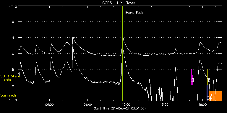 EIS Observation timeline overlay to GOES-Xray curve Code 1" 2" 40" 266" EIS Observations list for this event: STUDY ACRONYM ID DATE OBSERVED DESCRIPTION NOAA# TARGET 0 regcal071 | 80269 | 2021/12/21 17:05:12 | Dark exposures, CCD bottom rows (100s | | Engineering TIMELINE ID DATE OBSERVED FITS FILE XCEN (+W/-E) YCEN (+N/-S) DUR ----------------------------------------------------------------------------------------------------------------- 80269 | 2021/12/21 17:05:12.000 | eis_l0_20211221_170512.fits.gz | 307.98 | -622.52 | 3m22s 1 regcal072 | 80270 | 2021/12/21 17:10:12 | Dark exposures, top CCD rows (100s exp | | Engineering TIMELINE ID DATE OBSERVED FITS FILE XCEN (+W/-E) YCEN (+N/-S) DUR ----------------------------------------------------------------------------------------------------------------- 80270 | 2021/12/21 17:10:12.000 | eis_l0_20211221_171012.fits.gz | 308.52 | -111.45 | 3m22s 2 PRY_slot_contextLITE | 80238 | 2021/12/21 18:20:20 | Change of EIS pointing and alignment w | | Active Region TIMELINE ID DATE OBSERVED FITS FILE XCEN (+W/-E) YCEN (+N/-S) DUR ----------------------------------------------------------------------------------------------------------------- 80238 | 2021/12/21 18:20:20.000 | eis_l0_20211221_182020.fits.gz | -15.29 | -0.42 | 2m57s 3 XRT_synop_AIA | 80239 | 2021/12/21 18:24:27 | Change of EIS pointing and alignment w | | Quiet Sun TIMELINE ID DATE OBSERVED FITS FILE XCEN (+W/-E) YCEN (+N/-S) DUR ----------------------------------------------------------------------------------------------------------------- 80239 | 2021/12/21 18:24:27.000 | eis_l0_20211221_182427.fits.gz | -132.49 | -0.42 | 10s 4 HPW021VEL260x512v2 | 80276 | 2021/12/21 18:30:20 | Active Region Studies | 2908 | Active Region TIMELINE ID DATE OBSERVED FITS FILE XCEN (+W/-E) YCEN (+N/-S) DUR ----------------------------------------------------------------------------------------------------------------- 80276 | 2021/12/21 18:30:20.000 | eis_l0_20211221_183020.fits.gz | 294.67 | -279.45 | 1h0m44s : Check study information : Download file : View thumbnails For this event, also check for: