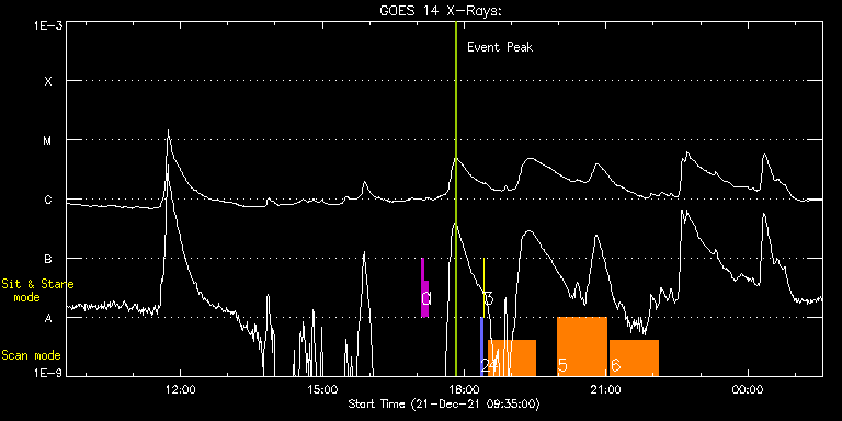 EIS Observation timeline overlay to GOES-Xray curve Code 1" 2" 40" 266" EIS Observations list for this event: STUDY ACRONYM ID DATE OBSERVED DESCRIPTION NOAA# TARGET 0 regcal071 | 80269 | 2021/12/21 17:05:12 | Dark exposures, CCD bottom rows (100s | | Engineering TIMELINE ID DATE OBSERVED FITS FILE XCEN (+W/-E) YCEN (+N/-S) DUR ----------------------------------------------------------------------------------------------------------------- 80269 | 2021/12/21 17:05:12.000 | eis_l0_20211221_170512.fits.gz | 307.98 | -622.52 | 3m22s 1 regcal072 | 80270 | 2021/12/21 17:10:12 | Dark exposures, top CCD rows (100s exp | | Engineering TIMELINE ID DATE OBSERVED FITS FILE XCEN (+W/-E) YCEN (+N/-S) DUR ----------------------------------------------------------------------------------------------------------------- 80270 | 2021/12/21 17:10:12.000 | eis_l0_20211221_171012.fits.gz | 308.52 | -111.45 | 3m22s 2 PRY_slot_contextLITE | 80238 | 2021/12/21 18:20:20 | Change of EIS pointing and alignment w | | Active Region TIMELINE ID DATE OBSERVED FITS FILE XCEN (+W/-E) YCEN (+N/-S) DUR ----------------------------------------------------------------------------------------------------------------- 80238 | 2021/12/21 18:20:20.000 | eis_l0_20211221_182020.fits.gz | -15.29 | -0.42 | 2m57s 3 XRT_synop_AIA | 80239 | 2021/12/21 18:24:27 | Change of EIS pointing and alignment w | | Quiet Sun TIMELINE ID DATE OBSERVED FITS FILE XCEN (+W/-E) YCEN (+N/-S) DUR ----------------------------------------------------------------------------------------------------------------- 80239 | 2021/12/21 18:24:27.000 | eis_l0_20211221_182427.fits.gz | -132.49 | -0.42 | 10s 4 HPW021VEL260x512v2 | 80276 | 2021/12/21 18:30:20 | Active Region Studies | 2908 | Active Region TIMELINE ID DATE OBSERVED FITS FILE XCEN (+W/-E) YCEN (+N/-S) DUR ----------------------------------------------------------------------------------------------------------------- 80276 | 2021/12/21 18:30:20.000 | eis_l0_20211221_183020.fits.gz | 294.67 | -279.45 | 1h0m44s 5 Atlas_60 | 80278 | 2021/12/21 19:58:41 | Active Region Studies | | Quiet Sun TIMELINE ID DATE OBSERVED FITS FILE XCEN (+W/-E) YCEN (+N/-S) DUR ----------------------------------------------------------------------------------------------------------------- 80278 | 2021/12/21 19:58:41.000 | eis_l0_20211221_195841.fits.gz | 307.30 | -279.60 | 1h1m39s 6 HPW021VEL260x512v2 | 80279 | 2021/12/21 21:05:40 | Active Region Studies | 2908 | Active Region TIMELINE ID DATE OBSERVED FITS FILE XCEN (+W/-E) YCEN (+N/-S) DUR ----------------------------------------------------------------------------------------------------------------- 80279 | 2021/12/21 21:05:40.000 | eis_l0_20211221_210540.fits.gz | 315.99 | -279.37 | 1h0m45s : Check study information : Download file : View thumbnails For this event, also check for: