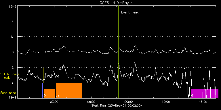 EIS Observation timeline overlay to GOES-Xray curve Code 1" 2" 40" 266" EIS Observations list for this event: STUDY ACRONYM ID DATE OBSERVED DESCRIPTION NOAA# TARGET 0 PRY_slot_contextLITE | 80262 | 2021/12/23 02:03:20 | Change of EIS pointing and alignment w | 2912 | Active Region TIMELINE ID DATE OBSERVED FITS FILE XCEN (+W/-E) YCEN (+N/-S) DUR ----------------------------------------------------------------------------------------------------------------- 80262 | 2021/12/23 02:03:20.000 | eis_l0_20211223_020320.fits.gz | -15.29 | -0.35 | 2m56s 1 XRT_synop_AIA | 80263 | 2021/12/23 02:07:26 | Change of EIS pointing and alignment w | 2912 | Quiet Sun TIMELINE ID DATE OBSERVED FITS FILE XCEN (+W/-E) YCEN (+N/-S) DUR ----------------------------------------------------------------------------------------------------------------- 80263 | 2021/12/23 02:07:26.000 | eis_l0_20211223_020726.fits.gz | -132.57 | -0.50 | 10s 2 synop008 | 80264 | 2021/12/23 02:10:19 | Test and Calibration Studies (TEST) | | Quiet Sun TIMELINE ID DATE OBSERVED FITS FILE XCEN (+W/-E) YCEN (+N/-S) DUR ----------------------------------------------------------------------------------------------------------------- 80264 | 2021/12/23 02:10:19.000 | eis_l0_20211223_021019.fits.gz | -0.97 | -0.35 | 54m29s 3 Atlas_120 | 80265 | 2021/12/23 03:10:12 | Test and Callibration Studies (TEST) | | Quiet Sun TIMELINE ID DATE OBSERVED FITS FILE XCEN (+W/-E) YCEN (+N/-S) DUR ----------------------------------------------------------------------------------------------------------------- 80265 | 2021/12/23 03:10:12.000 | eis_l0_20211223_031012.fits.gz | -0.47 | -0.50 | 2h1m40s 4 VHH_SlowAR_2h20_DPCM | 80272 | 2021/12/23 14:00:27 | AR12908 (HOP307) | 2908 | Active Region TIMELINE ID DATE OBSERVED FITS FILE XCEN (+W/-E) YCEN (+N/-S) DUR ----------------------------------------------------------------------------------------------------------------- 80272 | 2021/12/23 14:00:27.000 | eis_l0_20211223_140027.fits.gz | 617.68 | -282.69 | 2h12m36s : Check study information : Download file : View thumbnails For this event, also check for:
