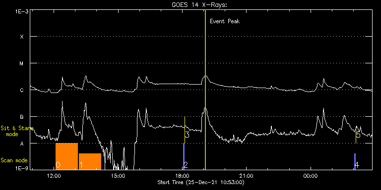 EIS Observation timeline overlay to GOES-Xray curve Code 1" 2" 40" 266" EIS Observations list for this event: STUDY ACRONYM ID DATE OBSERVED DESCRIPTION NOAA# TARGET 0 HPW021VEL260x512v2 | 80293 | 2021/12/25 12:05:13 | Active Region Studies | | Active Region TIMELINE ID DATE OBSERVED FITS FILE XCEN (+W/-E) YCEN (+N/-S) DUR ----------------------------------------------------------------------------------------------------------------- 80293 | 2021/12/25 12:05:13.000 | eis_l0_20211225_120513.fits.gz | -94.27 | -465.85 | 1h0m44s 1 Atlas_60 | 80294 | 2021/12/25 13:10:13 | Active Region Studies | | Quiet Sun TIMELINE ID DATE OBSERVED FITS FILE XCEN (+W/-E) YCEN (+N/-S) DUR ----------------------------------------------------------------------------------------------------------------- 80294 | 2021/12/25 13:10:13.000 | eis_l0_20211225_131013.fits.gz | -85.05 | -465.77 | 1h1m40s 2 PRY_slot_contextLITE | 80250 | 2021/12/25 18:03:21 | Change of EIS pointing and alignment w | | Active Region TIMELINE ID DATE OBSERVED FITS FILE XCEN (+W/-E) YCEN (+N/-S) DUR ----------------------------------------------------------------------------------------------------------------- 80250 | 2021/12/25 18:03:21.000 | eis_l0_20211225_180321.fits.gz | -15.29 | -0.42 | 2m56s 3 XRT_synop_AIA | 80251 | 2021/12/25 18:07:26 | Change of EIS pointing and alignment w | | Quiet Sun TIMELINE ID DATE OBSERVED FITS FILE XCEN (+W/-E) YCEN (+N/-S) DUR ----------------------------------------------------------------------------------------------------------------- 80251 | 2021/12/25 18:07:26.000 | eis_l0_20211225_180726.fits.gz | -132.57 | -0.35 | 10s 4 PRY_slot_contextLITE | 80252 | 2021/12/26 02:03:27 | Change of EIS pointing and alignment w | | Active Region TIMELINE ID DATE OBSERVED FITS FILE XCEN (+W/-E) YCEN (+N/-S) DUR ----------------------------------------------------------------------------------------------------------------- 80252 | 2021/12/26 02:03:27.000 | eis_l0_20211226_020327.fits.gz | -15.29 | -0.27 | 2m56s 5 XRT_synop_AIA | 80253 | 2021/12/26 02:07:26 | Change of EIS pointing and alignment w | | Quiet Sun TIMELINE ID DATE OBSERVED FITS FILE XCEN (+W/-E) YCEN (+N/-S) DUR ----------------------------------------------------------------------------------------------------------------- 80253 | 2021/12/26 02:07:26.000 | eis_l0_20211226_020726.fits.gz | -132.57 | -0.50 | 10s : Check study information : Download file : View thumbnails For this event, also check for: