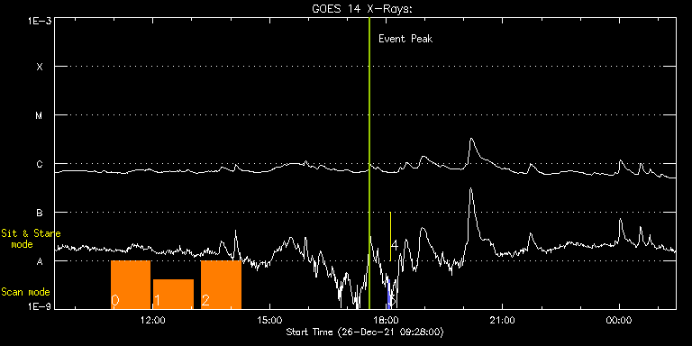 EIS Observation timeline overlay to GOES-Xray curve Code 1" 2" 40" 266" EIS Observations list for this event: STUDY ACRONYM ID DATE OBSERVED DESCRIPTION NOAA# TARGET 0 HPW021VEL260x512v2 | 80291 | 2021/12/26 10:55:19 | Active Region Studies | | Active Region TIMELINE ID DATE OBSERVED FITS FILE XCEN (+W/-E) YCEN (+N/-S) DUR ----------------------------------------------------------------------------------------------------------------- 80291 | 2021/12/26 10:55:19.000 | eis_l0_20211226_105519.fits.gz | 87.80 | -463.46 | 1h0m45s 1 Atlas_60 | 80295 | 2021/12/26 12:00:39 | Active Region Studies | | Quiet Sun TIMELINE ID DATE OBSERVED FITS FILE XCEN (+W/-E) YCEN (+N/-S) DUR ----------------------------------------------------------------------------------------------------------------- 80295 | 2021/12/26 12:00:39.000 | eis_l0_20211226_120039.fits.gz | 96.87 | -463.54 | 1h1m40s 2 HPW021VEL260x512v2 | 80292 | 2021/12/26 13:15:12 | Active Region Studies | | Active Region TIMELINE ID DATE OBSERVED FITS FILE XCEN (+W/-E) YCEN (+N/-S) DUR ----------------------------------------------------------------------------------------------------------------- 80292 | 2021/12/26 13:15:12.000 | eis_l0_20211226_131512.fits.gz | 106.11 | -463.46 | 1h0m45s 3 PRY_slot_contextLITE | 80254 | 2021/12/26 18:02:19 | Change of EIS pointing and alignment w | | Active Region TIMELINE ID DATE OBSERVED FITS FILE XCEN (+W/-E) YCEN (+N/-S) DUR ----------------------------------------------------------------------------------------------------------------- 80254 | 2021/12/26 18:02:19.000 | eis_l0_20211226_180219.fits.gz | -15.29 | -0.50 | 2m56s 4 XRT_synop_AIA | 80255 | 2021/12/26 18:06:25 | Change of EIS pointing and alignment w | | Quiet Sun TIMELINE ID DATE OBSERVED FITS FILE XCEN (+W/-E) YCEN (+N/-S) DUR ----------------------------------------------------------------------------------------------------------------- 80255 | 2021/12/26 18:06:25.000 | eis_l0_20211226_180625.fits.gz | -132.57 | -0.50 | 11s : Check study information : Download file : View thumbnails For this event, also check for:
