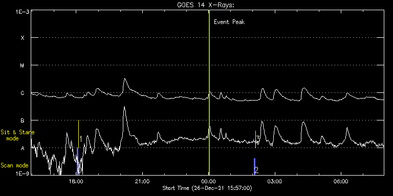 EIS Observation timeline overlay to GOES-Xray curve Code 1" 2" 40" 266" EIS Observations list for this event: STUDY ACRONYM ID DATE OBSERVED DESCRIPTION NOAA# TARGET 0 PRY_slot_contextLITE | 80254 | 2021/12/26 18:02:19 | Change of EIS pointing and alignment w | | Active Region TIMELINE ID DATE OBSERVED FITS FILE XCEN (+W/-E) YCEN (+N/-S) DUR ----------------------------------------------------------------------------------------------------------------- 80254 | 2021/12/26 18:02:19.000 | eis_l0_20211226_180219.fits.gz | -15.29 | -0.50 | 2m56s 1 XRT_synop_AIA | 80255 | 2021/12/26 18:06:25 | Change of EIS pointing and alignment w | | Quiet Sun TIMELINE ID DATE OBSERVED FITS FILE XCEN (+W/-E) YCEN (+N/-S) DUR ----------------------------------------------------------------------------------------------------------------- 80255 | 2021/12/26 18:06:25.000 | eis_l0_20211226_180625.fits.gz | -132.57 | -0.50 | 11s 2 PRY_slot_contextLITE | 80256 | 2021/12/27 02:03:26 | Change of EIS pointing and alignment w | 2916 | Active Region TIMELINE ID DATE OBSERVED FITS FILE XCEN (+W/-E) YCEN (+N/-S) DUR ----------------------------------------------------------------------------------------------------------------- 80256 | 2021/12/27 02:03:26.000 | eis_l0_20211227_020326.fits.gz | -15.37 | -0.35 | 2m57s 3 XRT_synop_AIA | 80257 | 2021/12/27 02:07:26 | Change of EIS pointing and alignment w | 2916 | Quiet Sun TIMELINE ID DATE OBSERVED FITS FILE XCEN (+W/-E) YCEN (+N/-S) DUR ----------------------------------------------------------------------------------------------------------------- 80257 | 2021/12/27 02:07:26.000 | eis_l0_20211227_020726.fits.gz | -132.57 | -0.50 | 10s : Check study information : Download file : View thumbnails For this event, also check for: