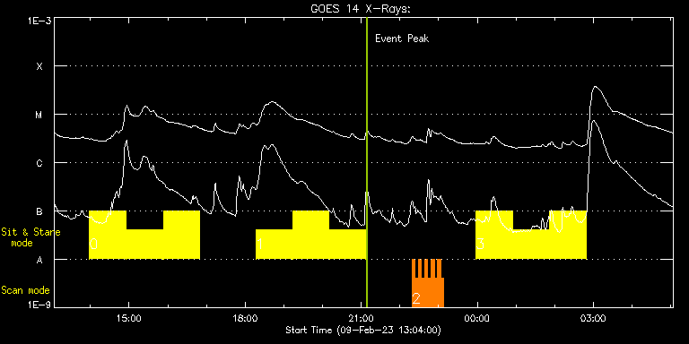 EIS Observation timeline overlay to GOES-Xray curve Code 1" 2" 40" 266" EIS Observations list for this event: STUDY ACRONYM ID DATE OBSERVED DESCRIPTION NOAA# TARGET 0 Flare266_Hunter01 | 85095 | 2023/02/09 13:58:42 | Major Flare Watch | | Flare TIMELINE ID DATE OBSERVED FITS FILE XCEN (+W/-E) YCEN (+N/-S) DUR ----------------------------------------------------------------------------------------------------------------- 85095 | 2023/02/09 13:58:42.000 | eis_l0_20230209_135842.fits.gz | 248.80 | 511.33 | 56m22s 85095 | 2023/02/09 14:55:56.000 | eis_l0_20230209_145556.fits.gz | 255.75 | 510.94 | 56m23s 85095 | 2023/02/09 15:53:11.000 | eis_l0_20230209_155311.fits.gz | 262.86 | 510.71 | 56m22s 1 Flare266_Hunter01 | 85098 | 2023/02/09 18:16:35 | Major Flare Watch | | Flare TIMELINE ID DATE OBSERVED FITS FILE XCEN (+W/-E) YCEN (+N/-S) DUR ----------------------------------------------------------------------------------------------------------------- 85098 | 2023/02/09 18:16:35.000 | eis_l0_20230209_181635.fits.gz | 280.31 | 510.02 | 56m23s 85098 | 2023/02/09 19:13:50.000 | eis_l0_20230209_191350.fits.gz | 287.19 | 509.71 | 56m22s 85098 | 2023/02/09 20:11:04.000 | eis_l0_20230209_201104.fits.gz | 294.06 | 509.48 | 56m23s 2 EL_DHB_02 | 85082 | 2023/02/09 22:19:05 | Coronal Magnetic Field Measurements in | | Flare TIMELINE ID DATE OBSERVED FITS FILE XCEN (+W/-E) YCEN (+N/-S) DUR ----------------------------------------------------------------------------------------------------------------- 85082 | 2023/02/09 22:19:05.000 | eis_l0_20230209_221905.fits.gz | 309.70 | 584.70 | 4m50s 85082 | 2023/02/09 22:23:58.000 | eis_l0_20230209_222358.fits.gz | 310.32 | 584.70 | 4m51s 85082 | 2023/02/09 22:28:51.000 | eis_l0_20230209_222851.fits.gz | 310.86 | 584.63 | 4m50s 85082 | 2023/02/09 22:33:44.000 | eis_l0_20230209_223344.fits.gz | 311.48 | 584.70 | 4m50s 85082 | 2023/02/09 22:38:37.000 | eis_l0_20230209_223837.fits.gz | 312.09 | 584.55 | 4m50s 85082 | 2023/02/09 22:43:30.000 | eis_l0_20230209_224330.fits.gz | 312.63 | 584.63 | 4m51s 85082 | 2023/02/09 22:48:24.000 | eis_l0_20230209_224824.fits.gz | 313.25 | 584.55 | 4m49s 85082 | 2023/02/09 22:53:16.000 | eis_l0_20230209_225316.fits.gz | 313.79 | 584.47 | 4m51s 85082 | 2023/02/09 22:58:09.000 | eis_l0_20230209_225809.fits.gz | 314.41 | 584.47 | 4m50s 85082 | 2023/02/09 23:03:02.000 | eis_l0_20230209_230302.fits.gz | 314.95 | 584.55 | 4m50s 3 Flare266_Hunter01 | 85099 | 2023/02/09 23:57:58 | Major Flare Watch | | Flare TIMELINE ID DATE OBSERVED FITS FILE XCEN (+W/-E) YCEN (+N/-S) DUR ----------------------------------------------------------------------------------------------------------------- 85099 | 2023/02/09 23:57:58.000 | eis_l0_20230209_235758.fits.gz | 321.26 | 508.24 | 56m23s 85099 | 2023/02/10 00:55:13.000 | eis_l0_20230210_005513.fits.gz | 327.98 | 507.78 | 56m23s 85099 | 2023/02/10 01:52:28.000 | eis_l0_20230210_015228.fits.gz | 334.77 | 507.47 | 56m22s : Check study information : Download file : View thumbnails For this event, also check for: