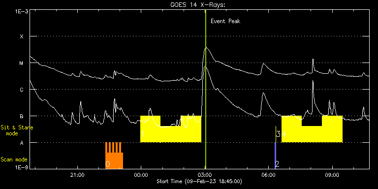 EIS Observation timeline overlay to GOES-Xray curve Code 1" 2" 40" 266" EIS Observations list for this event: STUDY ACRONYM ID DATE OBSERVED DESCRIPTION NOAA# TARGET 0 EL_DHB_02 | 85082 | 2023/02/09 22:19:05 | Coronal Magnetic Field Measurements in | | Flare TIMELINE ID DATE OBSERVED FITS FILE XCEN (+W/-E) YCEN (+N/-S) DUR ----------------------------------------------------------------------------------------------------------------- 85082 | 2023/02/09 22:19:05.000 | eis_l0_20230209_221905.fits.gz | 309.70 | 584.70 | 4m50s 85082 | 2023/02/09 22:23:58.000 | eis_l0_20230209_222358.fits.gz | 310.32 | 584.70 | 4m51s 85082 | 2023/02/09 22:28:51.000 | eis_l0_20230209_222851.fits.gz | 310.86 | 584.63 | 4m50s 85082 | 2023/02/09 22:33:44.000 | eis_l0_20230209_223344.fits.gz | 311.48 | 584.70 | 4m50s 85082 | 2023/02/09 22:38:37.000 | eis_l0_20230209_223837.fits.gz | 312.09 | 584.55 | 4m50s 85082 | 2023/02/09 22:43:30.000 | eis_l0_20230209_224330.fits.gz | 312.63 | 584.63 | 4m51s 85082 | 2023/02/09 22:48:24.000 | eis_l0_20230209_224824.fits.gz | 313.25 | 584.55 | 4m49s 85082 | 2023/02/09 22:53:16.000 | eis_l0_20230209_225316.fits.gz | 313.79 | 584.47 | 4m51s 85082 | 2023/02/09 22:58:09.000 | eis_l0_20230209_225809.fits.gz | 314.41 | 584.47 | 4m50s 85082 | 2023/02/09 23:03:02.000 | eis_l0_20230209_230302.fits.gz | 314.95 | 584.55 | 4m50s 1 Flare266_Hunter01 | 85099 | 2023/02/09 23:57:58 | Major Flare Watch | | Flare TIMELINE ID DATE OBSERVED FITS FILE XCEN (+W/-E) YCEN (+N/-S) DUR ----------------------------------------------------------------------------------------------------------------- 85099 | 2023/02/09 23:57:58.000 | eis_l0_20230209_235758.fits.gz | 321.26 | 508.24 | 56m23s 85099 | 2023/02/10 00:55:13.000 | eis_l0_20230210_005513.fits.gz | 327.98 | 507.78 | 56m23s 85099 | 2023/02/10 01:52:28.000 | eis_l0_20230210_015228.fits.gz | 334.77 | 507.47 | 56m22s 2 PRY_slot_contextLITE | 85073 | 2023/02/10 06:17:26 | pointing monitoring | | Active Region TIMELINE ID DATE OBSERVED FITS FILE XCEN (+W/-E) YCEN (+N/-S) DUR ----------------------------------------------------------------------------------------------------------------- 85073 | 2023/02/10 06:17:26.000 | eis_l0_20230210_061726.fits.gz | 0.76 | -194.85 | 2m57s 3 XRT_synop_AIA | 85074 | 2023/02/10 06:20:41 | pointing monitoring | | Quiet Sun TIMELINE ID DATE OBSERVED FITS FILE XCEN (+W/-E) YCEN (+N/-S) DUR ----------------------------------------------------------------------------------------------------------------- 85074 | 2023/02/10 06:20:41.000 | eis_l0_20230210_062041.fits.gz | 0.43 | -207.00 | 10s 4 Flare266_Hunter01 | 85100 | 2023/02/10 06:37:10 | Major Flare Watch | | Flare TIMELINE ID DATE OBSERVED FITS FILE XCEN (+W/-E) YCEN (+N/-S) DUR ----------------------------------------------------------------------------------------------------------------- 85100 | 2023/02/10 06:37:10.000 | eis_l0_20230210_063710.fits.gz | 367.91 | 505.61 | 56m22s 85100 | 2023/02/10 07:34:25.000 | eis_l0_20230210_073425.fits.gz | 374.40 | 505.30 | 56m22s 85100 | 2023/02/10 08:31:39.000 | eis_l0_20230210_083139.fits.gz | 380.97 | 504.84 | 56m22s : Check study information : Download file : View thumbnails For this event, also check for: