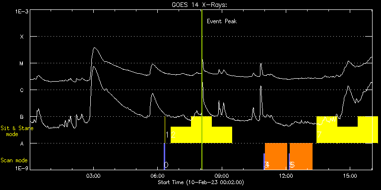 EIS Observation timeline overlay to GOES-Xray curve Code 1" 2" 40" 266" EIS Observations list for this event: STUDY ACRONYM ID DATE OBSERVED DESCRIPTION NOAA# TARGET 0 PRY_slot_contextLITE | 85073 | 2023/02/10 06:17:26 | pointing monitoring | | Active Region TIMELINE ID DATE OBSERVED FITS FILE XCEN (+W/-E) YCEN (+N/-S) DUR ----------------------------------------------------------------------------------------------------------------- 85073 | 2023/02/10 06:17:26.000 | eis_l0_20230210_061726.fits.gz | 0.76 | -194.85 | 2m57s 1 XRT_synop_AIA | 85074 | 2023/02/10 06:20:41 | pointing monitoring | | Quiet Sun TIMELINE ID DATE OBSERVED FITS FILE XCEN (+W/-E) YCEN (+N/-S) DUR ----------------------------------------------------------------------------------------------------------------- 85074 | 2023/02/10 06:20:41.000 | eis_l0_20230210_062041.fits.gz | 0.43 | -207.00 | 10s 2 Flare266_Hunter01 | 85100 | 2023/02/10 06:37:10 | Major Flare Watch | | Flare TIMELINE ID DATE OBSERVED FITS FILE XCEN (+W/-E) YCEN (+N/-S) DUR ----------------------------------------------------------------------------------------------------------------- 85100 | 2023/02/10 06:37:10.000 | eis_l0_20230210_063710.fits.gz | 367.91 | 505.61 | 56m22s 85100 | 2023/02/10 07:34:25.000 | eis_l0_20230210_073425.fits.gz | 374.40 | 505.30 | 56m22s 85100 | 2023/02/10 08:31:39.000 | eis_l0_20230210_083139.fits.gz | 380.97 | 504.84 | 56m22s 3 PRY_slot_contextLITE | 85087 | 2023/02/10 10:57:26 | Composition evolution in AR (leading p | 3209 | Active Region TIMELINE ID DATE OBSERVED FITS FILE XCEN (+W/-E) YCEN (+N/-S) DUR ----------------------------------------------------------------------------------------------------------------- 85087 | 2023/02/10 10:57:26.000 | eis_l0_20230210_105726.fits.gz | 376.21 | 409.91 | 2m57s 4 Atlas_60 | 85088 | 2023/02/10 11:00:48 | Composition evolution in AR (leading p | | Quiet Sun TIMELINE ID DATE OBSERVED FITS FILE XCEN (+W/-E) YCEN (+N/-S) DUR ----------------------------------------------------------------------------------------------------------------- 85088 | 2023/02/10 11:00:48.000 | eis_l0_20230210_110048.fits.gz | 441.83 | 547.84 | 1h1m39s 5 PRY_slot_contextLITE | 85089 | 2023/02/10 12:08:20 | Composition evolution in AR (following | 3209 | Active Region TIMELINE ID DATE OBSERVED FITS FILE XCEN (+W/-E) YCEN (+N/-S) DUR ----------------------------------------------------------------------------------------------------------------- 85089 | 2023/02/10 12:08:20.000 | eis_l0_20230210_120820.fits.gz | 385.49 | 415.30 | 2m56s 6 Atlas_60 | 85090 | 2023/02/10 12:11:41 | Composition evolution in AR (following | | Quiet Sun TIMELINE ID DATE OBSERVED FITS FILE XCEN (+W/-E) YCEN (+N/-S) DUR ----------------------------------------------------------------------------------------------------------------- 85090 | 2023/02/10 12:11:41.000 | eis_l0_20230210_121141.fits.gz | 362.92 | 613.30 | 1h1m39s 7 Flare266_Hunter01 | 85101 | 2023/02/10 13:26:46 | Major Flare Watch | 3213 | Flare TIMELINE ID DATE OBSERVED FITS FILE XCEN (+W/-E) YCEN (+N/-S) DUR ----------------------------------------------------------------------------------------------------------------- 85101 | 2023/02/10 13:26:46.000 | eis_l0_20230210_132646.fits.gz | 414.18 | 502.76 | 56m22s 85101 | 2023/02/10 14:24:00.000 | eis_l0_20230210_142400.fits.gz | 420.52 | 502.29 | 56m23s 85101 | 2023/02/10 15:21:15.000 | eis_l0_20230210_152115.fits.gz | 426.85 | 501.83 | 56m22s : Check study information : Download file : View thumbnails For this event, also check for: