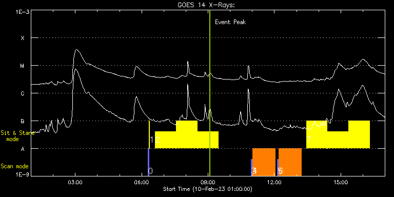 EIS Observation timeline overlay to GOES-Xray curve Code 1" 2" 40" 266" EIS Observations list for this event: STUDY ACRONYM ID DATE OBSERVED DESCRIPTION NOAA# TARGET 0 PRY_slot_contextLITE | 85073 | 2023/02/10 06:17:26 | pointing monitoring | | Active Region TIMELINE ID DATE OBSERVED FITS FILE XCEN (+W/-E) YCEN (+N/-S) DUR ----------------------------------------------------------------------------------------------------------------- 85073 | 2023/02/10 06:17:26.000 | eis_l0_20230210_061726.fits.gz | 0.76 | -194.85 | 2m57s 1 XRT_synop_AIA | 85074 | 2023/02/10 06:20:41 | pointing monitoring | | Quiet Sun TIMELINE ID DATE OBSERVED FITS FILE XCEN (+W/-E) YCEN (+N/-S) DUR ----------------------------------------------------------------------------------------------------------------- 85074 | 2023/02/10 06:20:41.000 | eis_l0_20230210_062041.fits.gz | 0.43 | -207.00 | 10s 2 Flare266_Hunter01 | 85100 | 2023/02/10 06:37:10 | Major Flare Watch | | Flare TIMELINE ID DATE OBSERVED FITS FILE XCEN (+W/-E) YCEN (+N/-S) DUR ----------------------------------------------------------------------------------------------------------------- 85100 | 2023/02/10 06:37:10.000 | eis_l0_20230210_063710.fits.gz | 367.91 | 505.61 | 56m22s 85100 | 2023/02/10 07:34:25.000 | eis_l0_20230210_073425.fits.gz | 374.40 | 505.30 | 56m22s 85100 | 2023/02/10 08:31:39.000 | eis_l0_20230210_083139.fits.gz | 380.97 | 504.84 | 56m22s 3 PRY_slot_contextLITE | 85087 | 2023/02/10 10:57:26 | Composition evolution in AR (leading p | 3209 | Active Region TIMELINE ID DATE OBSERVED FITS FILE XCEN (+W/-E) YCEN (+N/-S) DUR ----------------------------------------------------------------------------------------------------------------- 85087 | 2023/02/10 10:57:26.000 | eis_l0_20230210_105726.fits.gz | 376.21 | 409.91 | 2m57s 4 Atlas_60 | 85088 | 2023/02/10 11:00:48 | Composition evolution in AR (leading p | | Quiet Sun TIMELINE ID DATE OBSERVED FITS FILE XCEN (+W/-E) YCEN (+N/-S) DUR ----------------------------------------------------------------------------------------------------------------- 85088 | 2023/02/10 11:00:48.000 | eis_l0_20230210_110048.fits.gz | 441.83 | 547.84 | 1h1m39s 5 PRY_slot_contextLITE | 85089 | 2023/02/10 12:08:20 | Composition evolution in AR (following | 3209 | Active Region TIMELINE ID DATE OBSERVED FITS FILE XCEN (+W/-E) YCEN (+N/-S) DUR ----------------------------------------------------------------------------------------------------------------- 85089 | 2023/02/10 12:08:20.000 | eis_l0_20230210_120820.fits.gz | 385.49 | 415.30 | 2m56s 6 Atlas_60 | 85090 | 2023/02/10 12:11:41 | Composition evolution in AR (following | | Quiet Sun TIMELINE ID DATE OBSERVED FITS FILE XCEN (+W/-E) YCEN (+N/-S) DUR ----------------------------------------------------------------------------------------------------------------- 85090 | 2023/02/10 12:11:41.000 | eis_l0_20230210_121141.fits.gz | 362.92 | 613.30 | 1h1m39s 7 Flare266_Hunter01 | 85101 | 2023/02/10 13:26:46 | Major Flare Watch | 3213 | Flare TIMELINE ID DATE OBSERVED FITS FILE XCEN (+W/-E) YCEN (+N/-S) DUR ----------------------------------------------------------------------------------------------------------------- 85101 | 2023/02/10 13:26:46.000 | eis_l0_20230210_132646.fits.gz | 414.18 | 502.76 | 56m22s 85101 | 2023/02/10 14:24:00.000 | eis_l0_20230210_142400.fits.gz | 420.52 | 502.29 | 56m23s 85101 | 2023/02/10 15:21:15.000 | eis_l0_20230210_152115.fits.gz | 426.85 | 501.83 | 56m22s : Check study information : Download file : View thumbnails For this event, also check for: