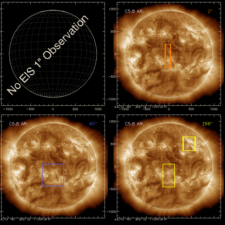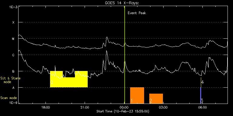 EIS Observation timeline overlay to GOES-Xray curve Code 1" 2" 40" 266" EIS Observations list for this event: STUDY ACRONYM ID DATE OBSERVED DESCRIPTION NOAA# TARGET 0 Flare266_Hunter01 | 85102 | 2023/02/10 18:21:12 | Major Flare Watch | 3209 | Flare TIMELINE ID DATE OBSERVED FITS FILE XCEN (+W/-E) YCEN (+N/-S) DUR ----------------------------------------------------------------------------------------------------------------- 85102 | 2023/02/10 18:21:12.000 | eis_l0_20230210_182112.fits.gz | 446.40 | 500.44 | 56m22s 85102 | 2023/02/10 19:18:26.000 | eis_l0_20230210_191826.fits.gz | 452.50 | 499.98 | 56m23s 85102 | 2023/02/10 20:15:41.000 | eis_l0_20230210_201541.fits.gz | 458.60 | 499.43 | 56m22s 1 Large_CH_Map | 85077 | 2023/02/11 00:28:49 | HOP 393 (Cycle 24/25 equatorial transi | | Quiet Sun TIMELINE ID DATE OBSERVED FITS FILE XCEN (+W/-E) YCEN (+N/-S) DUR ----------------------------------------------------------------------------------------------------------------- 85077 | 2023/02/11 00:28:49.000 | eis_l0_20230211_002849.fits.gz | -25.77 | -55.15 | 1h1m53s 2 Large_CH_Map | 85078 | 2023/02/11 01:55:32 | HOP 393 (Cycle 24/25 equatorial transi | | Quiet Sun TIMELINE ID DATE OBSERVED FITS FILE XCEN (+W/-E) YCEN (+N/-S) DUR ----------------------------------------------------------------------------------------------------------------- 85078 | 2023/02/11 01:55:32.000 | eis_l0_20230211_015532.fits.gz | -12.10 | -55.00 | 1h1m53s 3 PRY_slot_contextLITE | 85075 | 2023/02/11 05:49:21 | pointing monitoring | | Active Region TIMELINE ID DATE OBSERVED FITS FILE XCEN (+W/-E) YCEN (+N/-S) DUR ----------------------------------------------------------------------------------------------------------------- 85075 | 2023/02/11 05:49:21.000 | eis_l0_20230211_054921.fits.gz | 0.76 | -195.00 | 2m56s 4 XRT_synop_AIA | 85076 | 2023/02/11 05:52:35 | pointing monitoring | | Quiet Sun TIMELINE ID DATE OBSERVED FITS FILE XCEN (+W/-E) YCEN (+N/-S) DUR ----------------------------------------------------------------------------------------------------------------- 85076 | 2023/02/11 05:52:35.000 | eis_l0_20230211_055235.fits.gz | 0.43 | -206.92 | 10s : Check study information : Download file : View thumbnails For this event, also check for: