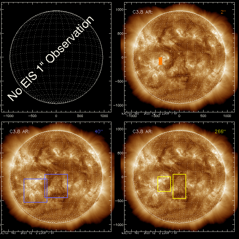 EIS Observation timeline overlay to GOES-Xray curve Code 1" 2" 40" 266" EIS Observations list for this event: STUDY ACRONYM ID DATE OBSERVED DESCRIPTION NOAA# TARGET 0 PRY_slot_contextLITE | 85118 | 2023/02/12 18:16:19 | Context for flare sit-and-stare observ | | Active Region TIMELINE ID DATE OBSERVED FITS FILE XCEN (+W/-E) YCEN (+N/-S) DUR ----------------------------------------------------------------------------------------------------------------- 85118 | 2023/02/12 18:16:19.000 | eis_l0_20230212_181619.fits.gz | -430.94 | -291.11 | 2m56s 1 Flare_SNS_v3 | 85119 | 2023/02/12 18:19:41 | Major Flare Watch | | Flare TIMELINE ID DATE OBSERVED FITS FILE XCEN (+W/-E) YCEN (+N/-S) DUR ----------------------------------------------------------------------------------------------------------------- 85119 | 2023/02/12 18:19:41.000 | eis_l0_20230212_181941.fits.gz | -419.41 | -85.03 | 1h19m5s 85119 | 2023/02/12 19:38:52.000 | eis_l0_20230212_193852.fits.gz | -408.36 | -84.34 | 1h19m6s 85119 | 2023/02/12 20:58:04.000 | eis_l0_20230212_205804.fits.gz | -397.16 | -83.80 | 1h19m5s 85119 | 2023/02/12 22:17:15.000 | eis_l0_20230212_221715.fits.gz | -385.96 | -83.02 | 1h19m6s 85119 | 2023/02/12 23:36:27.000 | eis_l0_20230212_233627.fits.gz | -374.68 | -82.56 | 1h19m6s 85119 | 2023/02/13 00:55:39.000 | eis_l0_20230213_005539.fits.gz | -363.32 | -82.17 | 1h19m6s 2 PRY_slot_contextLITE | 85105 | 2023/02/13 06:23:49 | Pointing monitoring. | | Active Region TIMELINE ID DATE OBSERVED FITS FILE XCEN (+W/-E) YCEN (+N/-S) DUR ----------------------------------------------------------------------------------------------------------------- 85105 | 2023/02/13 06:23:49.000 | eis_l0_20230213_062349.fits.gz | 0.76 | -194.92 | 2m56s 3 XRT_synop_AIA | 85106 | 2023/02/13 06:27:03 | | | Quiet Sun TIMELINE ID DATE OBSERVED FITS FILE XCEN (+W/-E) YCEN (+N/-S) DUR ----------------------------------------------------------------------------------------------------------------- 85106 | 2023/02/13 06:27:03.000 | eis_l0_20230213_062703.fits.gz | 0.51 | -207.00 | 11s 4 Flare266_Hunter01 | 85120 | 2023/02/13 06:34:09 | Major Flare Watch - EIS flare trigger | | Flare TIMELINE ID DATE OBSERVED FITS FILE XCEN (+W/-E) YCEN (+N/-S) DUR ----------------------------------------------------------------------------------------------------------------- 85120 | 2023/02/13 06:34:09.000 | eis_l0_20230213_063409.fits.gz | -314.36 | -157.93 | 56m23s 85120 | 2023/02/13 07:31:24.000 | eis_l0_20230213_073124.fits.gz | -305.94 | -157.55 | 56m22s 85120 | 2023/02/13 08:28:39.000 | eis_l0_20230213_082839.fits.gz | -297.52 | -157.24 | 56m22s 85120 | 2023/02/13 09:25:53.000 | eis_l0_20230213_092553.fits.gz | -289.10 | -156.85 | 56m22s 85120 | 2023/02/13 10:23:08.000 | eis_l0_20230213_102308.fits.gz | -280.68 | -156.62 | 56m22s : Check study information : Download file : View thumbnails For this event, also check for: