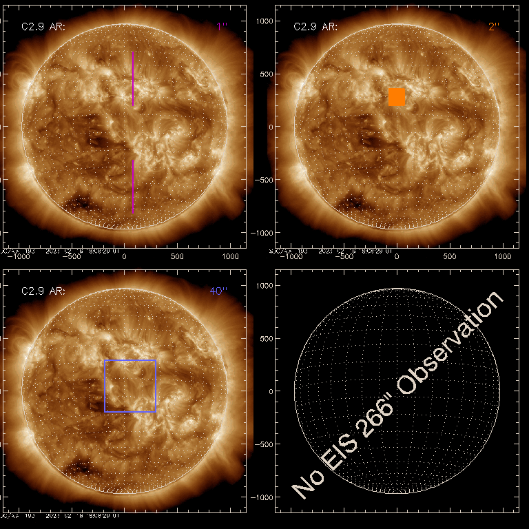 EIS Observation timeline overlay to GOES-Xray curve Code 1" 2" 40" 266" EIS Observations list for this event: STUDY ACRONYM ID DATE OBSERVED DESCRIPTION NOAA# TARGET 0 EL_DHB_01v2 | 85132 | 2023/02/16 10:37:20 | Flare Watch. | | Quiet Sun TIMELINE ID DATE OBSERVED FITS FILE XCEN (+W/-E) YCEN (+N/-S) DUR ----------------------------------------------------------------------------------------------------------------- 85132 | 2023/02/16 10:37:20.000 | eis_l0_20230216_103720.fits.gz | -47.46 | 276.49 | 4m50s 85132 | 2023/02/16 10:42:13.000 | eis_l0_20230216_104213.fits.gz | -46.69 | 276.26 | 4m50s 85132 | 2023/02/16 10:47:06.000 | eis_l0_20230216_104706.fits.gz | -45.99 | 276.34 | 4m50s 85132 | 2023/02/16 10:51:59.000 | eis_l0_20230216_105159.fits.gz | -45.14 | 276.34 | 4m50s 85132 | 2023/02/16 10:56:52.000 | eis_l0_20230216_105652.fits.gz | -44.45 | 276.34 | 4m50s 85132 | 2023/02/16 11:01:45.000 | eis_l0_20230216_110145.fits.gz | -43.67 | 276.34 | 4m51s 85132 | 2023/02/16 11:06:39.000 | eis_l0_20230216_110639.fits.gz | -42.90 | 276.34 | 4m50s 85132 | 2023/02/16 11:11:32.000 | eis_l0_20230216_111132.fits.gz | -42.21 | 276.42 | 4m49s 85132 | 2023/02/16 11:16:24.000 | eis_l0_20230216_111624.fits.gz | -41.43 | 276.34 | 4m50s 85132 | 2023/02/16 11:21:17.000 | eis_l0_20230216_112117.fits.gz | -40.66 | 276.34 | 4m50s 85132 | 2023/02/16 11:26:10.000 | eis_l0_20230216_112610.fits.gz | -39.89 | 276.42 | 4m50s 85132 | 2023/02/16 11:31:03.000 | eis_l0_20230216_113103.fits.gz | -39.19 | 276.42 | 4m50s 85132 | 2023/02/16 11:35:56.000 | eis_l0_20230216_113556.fits.gz | -38.42 | 276.42 | 4m50s 85132 | 2023/02/16 11:40:49.000 | eis_l0_20230216_114049.fits.gz | -37.65 | 276.42 | 4m50s 85132 | 2023/02/16 11:45:42.000 | eis_l0_20230216_114542.fits.gz | -36.95 | 276.34 | 4m50s 85132 | 2023/02/16 11:50:34.000 | eis_l0_20230216_115034.fits.gz | -36.18 | 276.42 | 4m51s 85132 | 2023/02/16 11:55:27.000 | eis_l0_20230216_115527.fits.gz | -35.41 | 276.34 | 4m51s 85132 | 2023/02/16 12:00:21.000 | eis_l0_20230216_120021.fits.gz | -34.64 | 276.34 | 4m50s 85132 | 2023/02/16 12:05:14.000 | eis_l0_20230216_120514.fits.gz | -33.86 | 276.34 | 4m50s 85132 | 2023/02/16 12:10:06.000 | eis_l0_20230216_121006.fits.gz | -33.09 | 276.34 | 4m50s 85132 | 2023/02/16 12:14:59.000 | eis_l0_20230216_121459.fits.gz | -32.32 | 276.26 | 4m50s 85132 | 2023/02/16 12:19:52.000 | eis_l0_20230216_121952.fits.gz | -31.55 | 276.26 | 4m50s 85132 | 2023/02/16 12:24:45.000 | eis_l0_20230216_122445.fits.gz | -30.85 | 276.34 | 4m50s 85132 | 2023/02/16 12:29:38.000 | eis_l0_20230216_122938.fits.gz | -30.08 | 276.26 | 4m50s 85132 | 2023/02/16 12:34:31.000 | eis_l0_20230216_123431.fits.gz | -29.38 | 276.34 | 4m50s 85132 | 2023/02/16 12:39:24.000 | eis_l0_20230216_123924.fits.gz | -28.53 | 276.26 | 4m50s 85132 | 2023/02/16 12:44:17.000 | eis_l0_20230216_124417.fits.gz | -27.84 | 276.34 | 4m49s 85132 | 2023/02/16 12:49:09.000 | eis_l0_20230216_124909.fits.gz | -27.14 | 276.34 | 4m51s 85132 | 2023/02/16 12:54:02.000 | eis_l0_20230216_125402.fits.gz | -26.29 | 276.34 | 4m50s 85132 | 2023/02/16 12:58:55.000 | eis_l0_20230216_125855.fits.gz | -25.67 | 276.42 | 4m50s 85132 | 2023/02/16 13:03:48.000 | eis_l0_20230216_130348.fits.gz | -24.90 | 276.49 | 4m50s 85132 | 2023/02/16 13:08:41.000 | eis_l0_20230216_130841.fits.gz | -24.05 | 276.42 | 4m50s 85132 | 2023/02/16 13:13:34.000 | eis_l0_20230216_131334.fits.gz | -23.36 | 276.34 | 4m50s 85132 | 2023/02/16 13:18:27.000 | eis_l0_20230216_131827.fits.gz | -22.51 | 276.34 | 4m50s 85132 | 2023/02/16 13:23:20.000 | eis_l0_20230216_132320.fits.gz | -21.89 | 276.34 | 4m50s 85132 | 2023/02/16 13:28:13.000 | eis_l0_20230216_132813.fits.gz | -21.04 | 276.26 | 4m50s 85132 | 2023/02/16 13:33:06.000 | eis_l0_20230216_133306.fits.gz | -20.27 | 276.26 | 4m50s 85132 | 2023/02/16 13:37:59.000 | eis_l0_20230216_133759.fits.gz | -19.57 | 276.26 | 4m50s 85132 | 2023/02/16 13:42:52.000 | eis_l0_20230216_134252.fits.gz | -18.80 | 276.26 | 4m50s 85132 | 2023/02/16 13:47:45.000 | eis_l0_20230216_134745.fits.gz | -18.03 | 276.26 | 4m50s 85132 | 2023/02/16 13:52:37.000 | eis_l0_20230216_135237.fits.gz | -17.33 | 276.26 | 4m51s 85132 | 2023/02/16 13:57:30.000 | eis_l0_20230216_135730.fits.gz | -16.56 | 276.18 | 4m50s 85132 | 2023/02/16 14:02:23.000 | eis_l0_20230216_140223.fits.gz | -15.79 | 276.26 | 4m50s 85132 | 2023/02/16 14:07:16.000 | eis_l0_20230216_140716.fits.gz | -15.01 | 276.26 | 4m50s 85132 | 2023/02/16 14:12:09.000 | eis_l0_20230216_141209.fits.gz | -14.32 | 276.26 | 4m50s 85132 | 2023/02/16 14:17:02.000 | eis_l0_20230216_141702.fits.gz | -13.55 | 276.26 | 4m50s 85132 | 2023/02/16 14:21:55.000 | eis_l0_20230216_142155.fits.gz | -12.77 | 276.34 | 4m50s 85132 | 2023/02/16 14:26:48.000 | eis_l0_20230216_142648.fits.gz | -12.00 | 276.26 | 4m50s 85132 | 2023/02/16 14:31:41.000 | eis_l0_20230216_143141.fits.gz | -11.31 | 276.26 | 4m50s 85132 | 2023/02/16 14:36:34.000 | eis_l0_20230216_143634.fits.gz | -10.46 | 276.26 | 4m50s 85132 | 2023/02/16 14:41:27.000 | eis_l0_20230216_144127.fits.gz | -9.76 | 276.34 | 4m50s 85132 | 2023/02/16 14:46:20.000 | eis_l0_20230216_144620.fits.gz | -8.99 | 276.34 | 4m50s 85132 | 2023/02/16 14:51:12.000 | eis_l0_20230216_145112.fits.gz | -8.22 | 276.18 | 4m50s 85132 | 2023/02/16 14:56:05.000 | eis_l0_20230216_145605.fits.gz | -7.52 | 276.34 | 4m51s 85132 | 2023/02/16 15:00:58.000 | eis_l0_20230216_150058.fits.gz | -6.75 | 276.18 | 4m51s 85132 | 2023/02/16 15:05:52.000 | eis_l0_20230216_150552.fits.gz | -5.98 | 276.18 | 4m50s 85132 | 2023/02/16 15:10:45.000 | eis_l0_20230216_151045.fits.gz | -5.28 | 276.26 | 4m50s 85132 | 2023/02/16 15:15:38.000 | eis_l0_20230216_151538.fits.gz | -4.51 | 276.26 | 4m50s 85132 | 2023/02/16 15:20:31.000 | eis_l0_20230216_152031.fits.gz | -3.74 | 276.18 | 4m50s 85132 | 2023/02/16 15:25:24.000 | eis_l0_20230216_152524.fits.gz | -3.04 | 276.26 | 4m50s 85132 | 2023/02/16 15:30:17.000 | eis_l0_20230216_153017.fits.gz | -2.27 | 276.18 | 4m50s 85132 | 2023/02/16 15:35:09.000 | eis_l0_