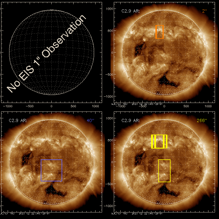 EIS Observation timeline overlay to GOES-Xray curve Code 1" 2" 40" 266" EIS Observations list for this event: STUDY ACRONYM ID DATE OBSERVED DESCRIPTION NOAA# TARGET 0 Flare266_Hunter01 | 85244 | 2023/02/21 22:14:40 | Major Flare Watch | 3234 | Flare TIMELINE ID DATE OBSERVED FITS FILE XCEN (+W/-E) YCEN (+N/-S) DUR ----------------------------------------------------------------------------------------------------------------- 85244 | 2023/02/21 22:14:40.000 | eis_l0_20230221_221440.fits.gz | -157.02 | 462.91 | 56m23s 85244 | 2023/02/21 23:11:55.000 | eis_l0_20230221_231155.fits.gz | -149.29 | 462.99 | 56m22s 85244 | 2023/02/22 00:09:10.000 | eis_l0_20230222_000910.fits.gz | -141.49 | 463.30 | 56m22s 85244 | 2023/02/22 01:06:24.000 | eis_l0_20230222_010624.fits.gz | -133.77 | 463.30 | 56m23s 1 FlareResponse01 | 85241 | 2023/02/22 03:23:50 | Major Flare Watch | | Flare TIMELINE ID DATE OBSERVED FITS FILE XCEN (+W/-E) YCEN (+N/-S) DUR ----------------------------------------------------------------------------------------------------------------- 85241 | 2023/02/22 03:23:50.000 | eis_l0_20230222_032350.fits.gz | -114.89 | 463.76 | 8m52s 85241 | 2023/02/22 03:32:45.000 | eis_l0_20230222_033245.fits.gz | -113.65 | 463.68 | 8m52s 85241 | 2023/02/22 03:41:40.000 | eis_l0_20230222_034140.fits.gz | -112.42 | 463.68 | 8m52s 85241 | 2023/02/22 03:50:35.000 | eis_l0_20230222_035035.fits.gz | -111.26 | 463.68 | 8m52s 85241 | 2023/02/22 03:59:30.000 | eis_l0_20230222_035930.fits.gz | -110.02 | 463.68 | 8m52s 85241 | 2023/02/22 04:08:25.000 | eis_l0_20230222_040825.fits.gz | -108.79 | 463.61 | 8m52s 2 FlareResponse01 | 85242 | 2023/02/22 05:00:13 | Major Flare Watch | | Flare TIMELINE ID DATE OBSERVED FITS FILE XCEN (+W/-E) YCEN (+N/-S) DUR ----------------------------------------------------------------------------------------------------------------- 85242 | 2023/02/22 05:00:13.000 | eis_l0_20230222_050013.fits.gz | -101.83 | 463.92 | 8m52s 85242 | 2023/02/22 05:09:08.000 | eis_l0_20230222_050908.fits.gz | -100.60 | 463.84 | 8m52s 85242 | 2023/02/22 05:18:04.000 | eis_l0_20230222_051804.fits.gz | -99.36 | 463.92 | 8m51s 85242 | 2023/02/22 05:26:59.000 | eis_l0_20230222_052659.fits.gz | -98.13 | 463.84 | 8m52s 3 PRY_slot_contextLITE | 85226 | 2023/02/22 05:42:20 | Pointing Monitoring | 3230 | Active Region TIMELINE ID DATE OBSERVED FITS FILE XCEN (+W/-E) YCEN (+N/-S) DUR ----------------------------------------------------------------------------------------------------------------- 85226 | 2023/02/22 05:42:20.000 | eis_l0_20230222_054220.fits.gz | 0.84 | -195.08 | 2m57s 4 XRT_synop_AIA | 85227 | 2023/02/22 05:45:36 | Pointing Monitoring | 3230 | Quiet Sun TIMELINE ID DATE OBSERVED FITS FILE XCEN (+W/-E) YCEN (+N/-S) DUR ----------------------------------------------------------------------------------------------------------------- 85227 | 2023/02/22 05:45:36.000 | eis_l0_20230222_054536.fits.gz | 0.59 | -207.08 | 10s 5 Flare266_Hunter01 | 85245 | 2023/02/22 06:38:40 | Major Flare Watch | | Flare TIMELINE ID DATE OBSERVED FITS FILE XCEN (+W/-E) YCEN (+N/-S) DUR ----------------------------------------------------------------------------------------------------------------- 85245 | 2023/02/22 06:38:40.000 | eis_l0_20230222_063840.fits.gz | -88.66 | 463.99 | 56m22s 85245 | 2023/02/22 07:35:54.000 | eis_l0_20230222_073554.fits.gz | -80.85 | 464.07 | 56m23s 85245 | 2023/02/22 08:33:09.000 | eis_l0_20230222_083309.fits.gz | -73.05 | 464.23 | 56m22s 85245 | 2023/02/22 09:30:24.000 | eis_l0_20230222_093024.fits.gz | -65.33 | 464.23 | 56m22s : Check study information : Download file : View thumbnails For this event, also check for: