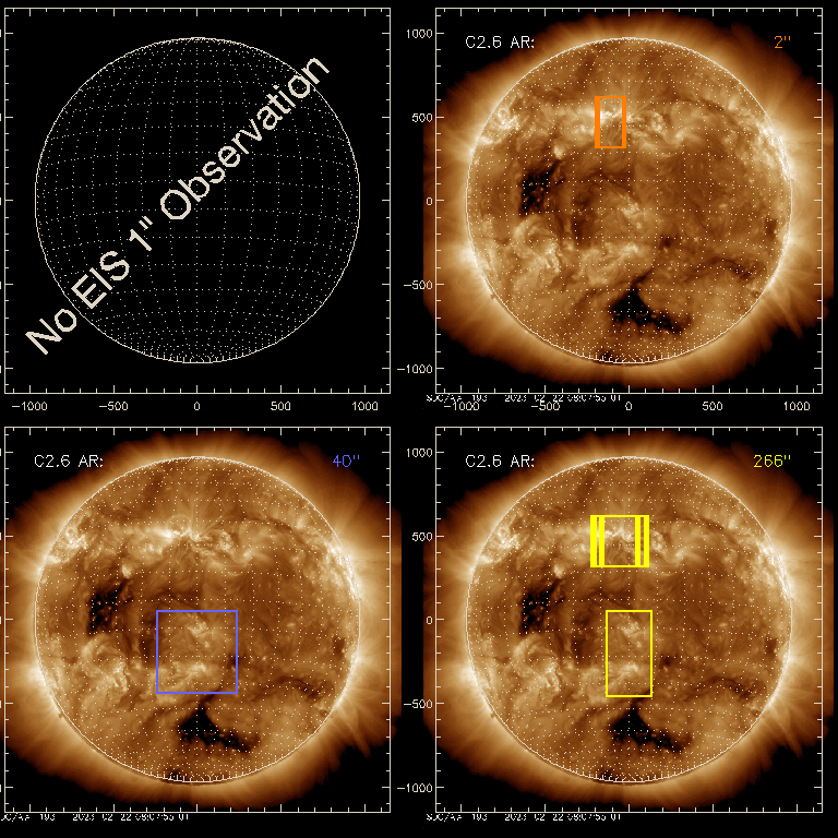 EIS Observation timeline overlay to GOES-Xray curve Code 1" 2" 40" 266" EIS Observations list for this event: STUDY ACRONYM ID DATE OBSERVED DESCRIPTION NOAA# TARGET 0 FlareResponse01 | 85241 | 2023/02/22 03:23:50 | Major Flare Watch | | Flare TIMELINE ID DATE OBSERVED FITS FILE XCEN (+W/-E) YCEN (+N/-S) DUR ----------------------------------------------------------------------------------------------------------------- 85241 | 2023/02/22 03:23:50.000 | eis_l0_20230222_032350.fits.gz | -114.89 | 463.76 | 8m52s 85241 | 2023/02/22 03:32:45.000 | eis_l0_20230222_033245.fits.gz | -113.65 | 463.68 | 8m52s 85241 | 2023/02/22 03:41:40.000 | eis_l0_20230222_034140.fits.gz | -112.42 | 463.68 | 8m52s 85241 | 2023/02/22 03:50:35.000 | eis_l0_20230222_035035.fits.gz | -111.26 | 463.68 | 8m52s 85241 | 2023/02/22 03:59:30.000 | eis_l0_20230222_035930.fits.gz | -110.02 | 463.68 | 8m52s 85241 | 2023/02/22 04:08:25.000 | eis_l0_20230222_040825.fits.gz | -108.79 | 463.61 | 8m52s 1 FlareResponse01 | 85242 | 2023/02/22 05:00:13 | Major Flare Watch | | Flare TIMELINE ID DATE OBSERVED FITS FILE XCEN (+W/-E) YCEN (+N/-S) DUR ----------------------------------------------------------------------------------------------------------------- 85242 | 2023/02/22 05:00:13.000 | eis_l0_20230222_050013.fits.gz | -101.83 | 463.92 | 8m52s 85242 | 2023/02/22 05:09:08.000 | eis_l0_20230222_050908.fits.gz | -100.60 | 463.84 | 8m52s 85242 | 2023/02/22 05:18:04.000 | eis_l0_20230222_051804.fits.gz | -99.36 | 463.92 | 8m51s 85242 | 2023/02/22 05:26:59.000 | eis_l0_20230222_052659.fits.gz | -98.13 | 463.84 | 8m52s 2 PRY_slot_contextLITE | 85226 | 2023/02/22 05:42:20 | Pointing Monitoring | 3230 | Active Region TIMELINE ID DATE OBSERVED FITS FILE XCEN (+W/-E) YCEN (+N/-S) DUR ----------------------------------------------------------------------------------------------------------------- 85226 | 2023/02/22 05:42:20.000 | eis_l0_20230222_054220.fits.gz | 0.84 | -195.08 | 2m57s 3 XRT_synop_AIA | 85227 | 2023/02/22 05:45:36 | Pointing Monitoring | 3230 | Quiet Sun TIMELINE ID DATE OBSERVED FITS FILE XCEN (+W/-E) YCEN (+N/-S) DUR ----------------------------------------------------------------------------------------------------------------- 85227 | 2023/02/22 05:45:36.000 | eis_l0_20230222_054536.fits.gz | 0.59 | -207.08 | 10s 4 Flare266_Hunter01 | 85245 | 2023/02/22 06:38:40 | Major Flare Watch | | Flare TIMELINE ID DATE OBSERVED FITS FILE XCEN (+W/-E) YCEN (+N/-S) DUR ----------------------------------------------------------------------------------------------------------------- 85245 | 2023/02/22 06:38:40.000 | eis_l0_20230222_063840.fits.gz | -88.66 | 463.99 | 56m22s 85245 | 2023/02/22 07:35:54.000 | eis_l0_20230222_073554.fits.gz | -80.85 | 464.07 | 56m23s 85245 | 2023/02/22 08:33:09.000 | eis_l0_20230222_083309.fits.gz | -73.05 | 464.23 | 56m22s 85245 | 2023/02/22 09:30:24.000 | eis_l0_20230222_093024.fits.gz | -65.33 | 464.23 | 56m22s 5 Flare266_Hunter01 | 85246 | 2023/02/22 12:53:14 | Major Flare Watch | 3235 | Flare TIMELINE ID DATE OBSERVED FITS FILE XCEN (+W/-E) YCEN (+N/-S) DUR ----------------------------------------------------------------------------------------------------------------- 85246 | 2023/02/22 12:53:14.000 | eis_l0_20230222_125314.fits.gz | -37.67 | 464.38 | 56m23s 85246 | 2023/02/22 13:50:29.000 | eis_l0_20230222_135029.fits.gz | -29.72 | 464.30 | 56m22s 85246 | 2023/02/22 14:47:43.000 | eis_l0_20230222_144743.fits.gz | -21.99 | 464.46 | 56m22s 85246 | 2023/02/22 15:44:58.000 | eis_l0_20230222_154458.fits.gz | -14.19 | 464.38 | 56m22s : Check study information : Download file : View thumbnails For this event, also check for: