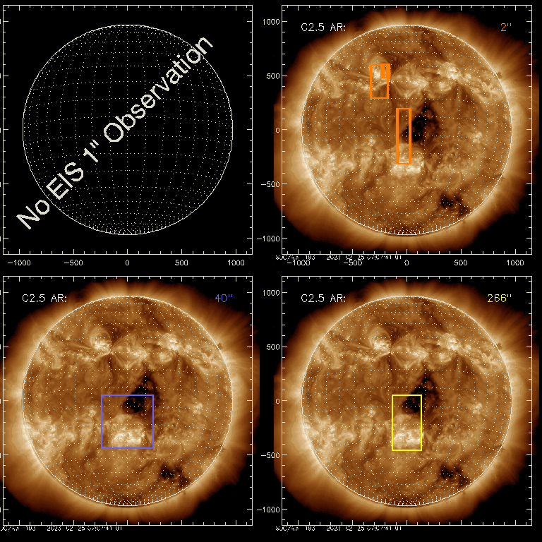 EIS Observation timeline overlay to GOES-Xray curve Code 1" 2" 40" 266" EIS Observations list for this event: STUDY ACRONYM ID DATE OBSERVED DESCRIPTION NOAA# TARGET 0 Large_CH_Map | 85249 | 2023/02/25 00:28:48 | HOP 393 (Cycle 24/25 equatorial transi | | Quiet Sun TIMELINE ID DATE OBSERVED FITS FILE XCEN (+W/-E) YCEN (+N/-S) DUR ----------------------------------------------------------------------------------------------------------------- 85249 | 2023/02/25 00:28:48.000 | eis_l0_20230225_002848.fits.gz | -33.38 | -62.23 | 1h1m53s 1 Large_CH_Map | 85250 | 2023/02/25 01:54:41 | HOP 393 (Cycle 24/25 equatorial transi | | Quiet Sun TIMELINE ID DATE OBSERVED FITS FILE XCEN (+W/-E) YCEN (+N/-S) DUR ----------------------------------------------------------------------------------------------------------------- 85250 | 2023/02/25 01:54:41.000 | eis_l0_20230225_015441.fits.gz | -19.53 | -62.16 | 1h1m53s 2 PRY_slot_contextLITE | 85264 | 2023/02/25 05:50:18 | Pointing Monitoring | 3230 | Active Region TIMELINE ID DATE OBSERVED FITS FILE XCEN (+W/-E) YCEN (+N/-S) DUR ----------------------------------------------------------------------------------------------------------------- 85264 | 2023/02/25 05:50:18.000 | eis_l0_20230225_055018.fits.gz | 0.68 | -195.08 | 2m56s 3 XRT_synop_AIA | 85265 | 2023/02/25 05:53:33 | Pointing Monitoring | 3230 | Quiet Sun TIMELINE ID DATE OBSERVED FITS FILE XCEN (+W/-E) YCEN (+N/-S) DUR ----------------------------------------------------------------------------------------------------------------- 85265 | 2023/02/25 05:53:33.000 | eis_l0_20230225_055333.fits.gz | 0.51 | -206.92 | 10s 4 FlareResponse01 | 85259 | 2023/02/25 06:45:18 | Major Flare Watch | 3234 | Flare TIMELINE ID DATE OBSERVED FITS FILE XCEN (+W/-E) YCEN (+N/-S) DUR ----------------------------------------------------------------------------------------------------------------- 85259 | 2023/02/25 06:45:18.000 | eis_l0_20230225_064518.fits.gz | -254.21 | 443.53 | 8m52s 85259 | 2023/02/25 06:54:13.000 | eis_l0_20230225_065413.fits.gz | -253.05 | 443.61 | 8m52s 85259 | 2023/02/25 07:03:08.000 | eis_l0_20230225_070308.fits.gz | -251.81 | 443.61 | 8m52s 85259 | 2023/02/25 07:12:03.000 | eis_l0_20230225_071203.fits.gz | -250.65 | 443.69 | 8m52s 85259 | 2023/02/25 07:20:58.000 | eis_l0_20230225_072058.fits.gz | -249.42 | 443.61 | 8m52s 85259 | 2023/02/25 07:29:53.000 | eis_l0_20230225_072953.fits.gz | -248.26 | 443.69 | 8m52s 5 cam_flare_hot1_study | 85269 | 2023/02/25 11:29:40 | Microflares in AR13234, test of HOP396 | | Flare TIMELINE ID DATE OBSERVED FITS FILE XCEN (+W/-E) YCEN (+N/-S) DUR ----------------------------------------------------------------------------------------------------------------- 85269 | 2023/02/25 11:29:40.000 | eis_l0_20230225_112940.fits.gz | -209.61 | 538.34 | 4m51s 85269 | 2023/02/25 11:34:33.000 | eis_l0_20230225_113433.fits.gz | -208.91 | 538.34 | 4m50s 85269 | 2023/02/25 11:39:26.000 | eis_l0_20230225_113926.fits.gz | -208.22 | 538.34 | 4m50s 85269 | 2023/02/25 11:44:19.000 | eis_l0_20230225_114419.fits.gz | -207.60 | 538.42 | 4m50s 85269 | 2023/02/25 11:49:11.000 | eis_l0_20230225_114911.fits.gz | -206.90 | 538.49 | 4m51s 85269 | 2023/02/25 11:54:04.000 | eis_l0_20230225_115404.fits.gz | -206.29 | 538.49 | 4m50s 85269 | 2023/02/25 11:58:57.000 | eis_l0_20230225_115857.fits.gz | -205.59 | 538.49 | 4m50s 85269 | 2023/02/25 12:03:50.000 | eis_l0_20230225_120350.fits.gz | -204.90 | 538.49 | 4m50s 85269 | 2023/02/25 12:08:43.000 | eis_l0_20230225_120843.fits.gz | -204.20 | 538.42 | 4m50s 85269 | 2023/02/25 12:13:36.000 | eis_l0_20230225_121336.fits.gz | -203.58 | 538.49 | 4m50s 85269 | 2023/02/25 12:18:29.000 | eis_l0_20230225_121829.fits.gz | -202.89 | 538.49 | 4m50s 85269 | 2023/02/25 12:23:22.000 | eis_l0_20230225_122322.fits.gz | -202.27 | 538.49 | 4m50s 85269 | 2023/02/25 12:28:14.000 | eis_l0_20230225_122814.fits.gz | -201.57 | 538.49 | 4m51s 85269 | 2023/02/25 12:33:07.000 | eis_l0_20230225_123307.fits.gz | -200.96 | 538.49 | 4m50s 85269 | 2023/02/25 12:38:00.000 | eis_l0_20230225_123800.fits.gz | -200.26 | 538.57 | 4m50s 85269 | 2023/02/25 12:42:53.000 | eis_l0_20230225_124253.fits.gz | -199.57 | 538.57 | 4m50s 85269 | 2023/02/25 12:47:46.000 | eis_l0_20230225_124746.fits.gz | -198.95 | 538.57 | 4m50s 85269 | 2023/02/25 12:52:39.000 | eis_l0_20230225_125239.fits.gz | -198.25 | 538.65 | 4m50s 85269 | 2023/02/25 12:57:31.000 | eis_l0_20230225_125731.fits.gz | -197.56 | 538.65 | 4m50s 85269 | 2023/02/25 13:02:24.000 | eis_l0_20230225_130224.fits.gz | -196.86 | 538.65 | 4m50s 85269 | 2023/02/25 13:07:17.000 | eis_l0_20230225_130717.fits.gz | -196.24 | 538.73 | 4m50s 85269 | 2023/02/25 13:12:10.000 | eis_l0_20230225_131210.fits.gz | -195.62 | 538.65 | 4m50s 85269 | 2023/02/25 13:17:03.000 | eis_l0_20230225_131703.fits.gz | -194.93 | 538.73 | 4m50s 85269 | 2023/02/25 13:21:55.000 | eis_l0_20230225_132155.fits.gz | -194.31 | 538.80 | 4m51s 85269 | 2023/02/25 13:26:48.000 | eis_l0_20230225_132648.fits.gz | -193.54 | 538.80 | 4m51s 85269 | 2023/02/25 13:31:41.000 | eis_l0_20230225_133141.fits.gz | -192.92 | 538.80 | 4m50s 85269 | 2023/02/25 13:36:34.000 | eis_l0_20230225_133634.fits.gz | -192.23 | 538.80 | 4m50s 85269 | 2023/02/25 13:41:27.000 | eis_l0_20230225_134127.fits.gz | -191.61 | 538.80 | 4m50s 85269 | 2023/02/25 13:46:20.000 | eis_l0_20230225_134620.fits.gz | -190.91 | 538.80 | 4m38s 85269 | 2023/02/25 13:51:12.000 | eis_l0_20230225_135112.fits.gz | -190.29 | 538.80 | 4m50s 85269 | 2023/02/25 13:56:05.000 | eis_l0_20230225_135605.fits.gz | -189.60 | 538.88 | 4m50s 85269 | 2023/02/25 14:00:58.000 | eis_l0_20230225_140058.fits.gz | -188.90 | 538.88 | 4m50s 85269 | 2023/02/25 14:05:51.000 | eis_l0_20230225_140551.fits.gz | -188.29 | 538.88 | 4m50s 85269 | 2023/02/25 14:10:44.000 | eis_l0_20230225_141044.fits.gz | -187.59 | 538.88 | 4m50s 85269 | 2023/02/25 14:15:36.000 | eis_l0_20230225_141536.fits.gz | -186.90 | 538.88 | 4m51s 85269 | 2023/02/25 14:20:29.000 | eis_l0_20230