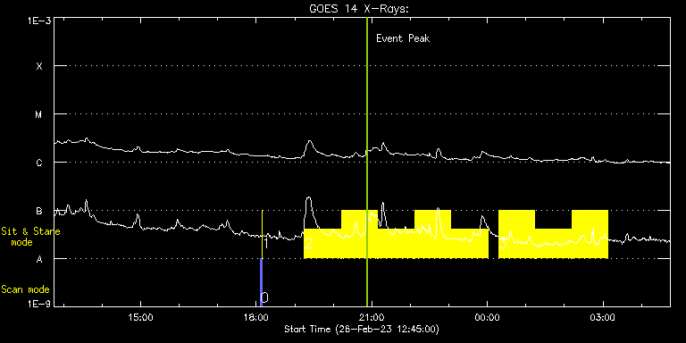 EIS Observation timeline overlay to GOES-Xray curve Code 1" 2" 40" 266" EIS Observations list for this event: STUDY ACRONYM ID DATE OBSERVED DESCRIPTION NOAA# TARGET 0 PRY_slot_contextLITE | 85273 | 2023/02/26 18:06:19 | EIS pointing monitoring | 3230 | Active Region TIMELINE ID DATE OBSERVED FITS FILE XCEN (+W/-E) YCEN (+N/-S) DUR ----------------------------------------------------------------------------------------------------------------- 85273 | 2023/02/26 18:06:19.000 | eis_l0_20230226_180619.fits.gz | -26.94 | -200.85 | 2m57s 1 XRT_synop_AIA | 85274 | 2023/02/26 18:09:34 | EIS pointing monitoring | 3230 | Quiet Sun TIMELINE ID DATE OBSERVED FITS FILE XCEN (+W/-E) YCEN (+N/-S) DUR ----------------------------------------------------------------------------------------------------------------- 85274 | 2023/02/26 18:09:34.000 | eis_l0_20230226_180934.fits.gz | 0.43 | -206.92 | 10s 2 Flare266_Hunter01 | 85283 | 2023/02/26 19:15:12 | Flare hunting: AR13234 | 3235 | Flare TIMELINE ID DATE OBSERVED FITS FILE XCEN (+W/-E) YCEN (+N/-S) DUR ----------------------------------------------------------------------------------------------------------------- 85283 | 2023/02/26 19:15:12.000 | eis_l0_20230226_191512.fits.gz | 50.86 | 436.58 | 56m22s 85283 | 2023/02/26 20:12:27.000 | eis_l0_20230226_201227.fits.gz | 58.82 | 436.50 | 56m22s 85283 | 2023/02/26 21:09:41.000 | eis_l0_20230226_210941.fits.gz | 66.77 | 436.35 | 56m22s 85283 | 2023/02/26 22:06:56.000 | eis_l0_20230226_220656.fits.gz | 74.65 | 436.42 | 56m22s 85283 | 2023/02/26 23:04:10.000 | eis_l0_20230226_230410.fits.gz | 82.53 | 436.19 | 56m22s 3 Flare266_Hunter01 | 85284 | 2023/02/27 00:17:12 | Flare hunting: AR13234 | 3235 | Flare TIMELINE ID DATE OBSERVED FITS FILE XCEN (+W/-E) YCEN (+N/-S) DUR ----------------------------------------------------------------------------------------------------------------- 85284 | 2023/02/27 00:17:12.000 | eis_l0_20230227_001712.fits.gz | 92.65 | 436.04 | 56m22s 85284 | 2023/02/27 01:14:27.000 | eis_l0_20230227_011427.fits.gz | 100.45 | 435.96 | 56m22s 85284 | 2023/02/27 02:11:41.000 | eis_l0_20230227_021141.fits.gz | 108.41 | 435.73 | 56m22s : Check study information : Download file : View thumbnails For this event, also check for: