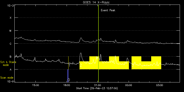 EIS Observation timeline overlay to GOES-Xray curve Code 1" 2" 40" 266" EIS Observations list for this event: STUDY ACRONYM ID DATE OBSERVED DESCRIPTION NOAA# TARGET 0 PRY_slot_contextLITE | 85273 | 2023/02/26 18:06:19 | EIS pointing monitoring | 3230 | Active Region TIMELINE ID DATE OBSERVED FITS FILE XCEN (+W/-E) YCEN (+N/-S) DUR ----------------------------------------------------------------------------------------------------------------- 85273 | 2023/02/26 18:06:19.000 | eis_l0_20230226_180619.fits.gz | -26.94 | -200.85 | 2m57s 1 XRT_synop_AIA | 85274 | 2023/02/26 18:09:34 | EIS pointing monitoring | 3230 | Quiet Sun TIMELINE ID DATE OBSERVED FITS FILE XCEN (+W/-E) YCEN (+N/-S) DUR ----------------------------------------------------------------------------------------------------------------- 85274 | 2023/02/26 18:09:34.000 | eis_l0_20230226_180934.fits.gz | 0.43 | -206.92 | 10s 2 Flare266_Hunter01 | 85283 | 2023/02/26 19:15:12 | Flare hunting: AR13234 | 3235 | Flare TIMELINE ID DATE OBSERVED FITS FILE XCEN (+W/-E) YCEN (+N/-S) DUR ----------------------------------------------------------------------------------------------------------------- 85283 | 2023/02/26 19:15:12.000 | eis_l0_20230226_191512.fits.gz | 50.86 | 436.58 | 56m22s 85283 | 2023/02/26 20:12:27.000 | eis_l0_20230226_201227.fits.gz | 58.82 | 436.50 | 56m22s 85283 | 2023/02/26 21:09:41.000 | eis_l0_20230226_210941.fits.gz | 66.77 | 436.35 | 56m22s 85283 | 2023/02/26 22:06:56.000 | eis_l0_20230226_220656.fits.gz | 74.65 | 436.42 | 56m22s 85283 | 2023/02/26 23:04:10.000 | eis_l0_20230226_230410.fits.gz | 82.53 | 436.19 | 56m22s 3 Flare266_Hunter01 | 85284 | 2023/02/27 00:17:12 | Flare hunting: AR13234 | 3235 | Flare TIMELINE ID DATE OBSERVED FITS FILE XCEN (+W/-E) YCEN (+N/-S) DUR ----------------------------------------------------------------------------------------------------------------- 85284 | 2023/02/27 00:17:12.000 | eis_l0_20230227_001712.fits.gz | 92.65 | 436.04 | 56m22s 85284 | 2023/02/27 01:14:27.000 | eis_l0_20230227_011427.fits.gz | 100.45 | 435.96 | 56m22s 85284 | 2023/02/27 02:11:41.000 | eis_l0_20230227_021141.fits.gz | 108.41 | 435.73 | 56m22s : Check study information : Download file : View thumbnails For this event, also check for: