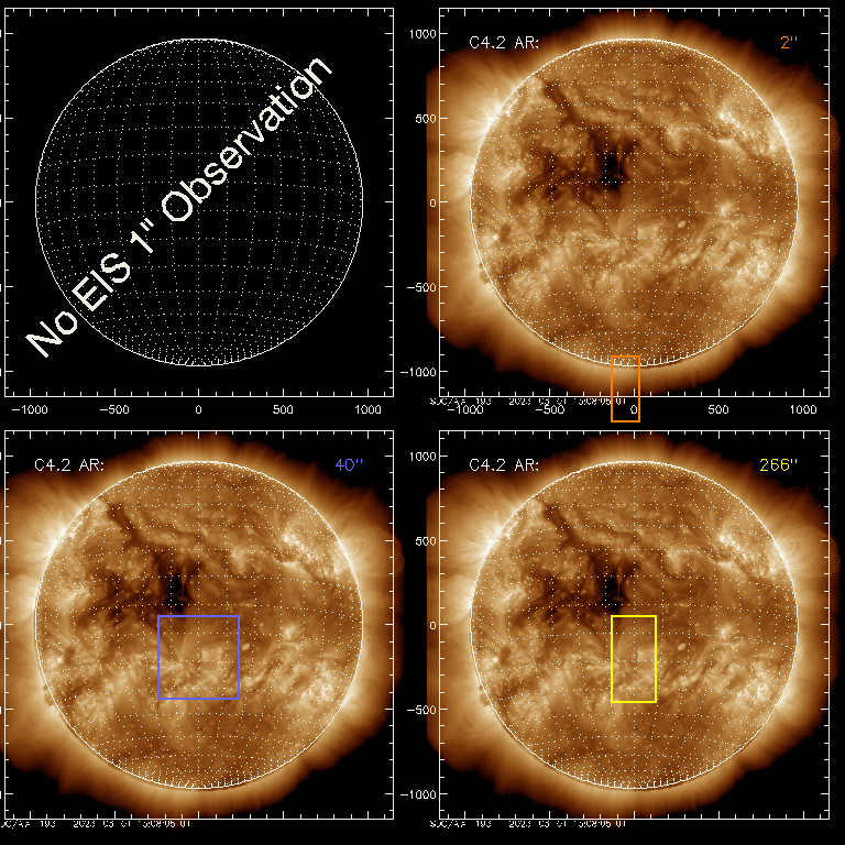 EIS Observation timeline overlay to GOES-Xray curve Code 1" 2" 40" 266" EIS Observations list for this event: STUDY ACRONYM ID DATE OBSERVED DESCRIPTION NOAA# TARGET 0 HOP81_new_study | 85318 | 2023/03/01 10:39:40 | HOP206 (South pole) | | Coronal Hole TIMELINE ID DATE OBSERVED FITS FILE XCEN (+W/-E) YCEN (+N/-S) DUR ----------------------------------------------------------------------------------------------------------------- 85318 | 2023/03/01 10:39:40.000 | eis_l0_20230301_103940.fits.gz | -47.29 | -1108.11 | 1h9m45s 85318 | 2023/03/01 11:49:29.000 | eis_l0_20230301_114929.fits.gz | -47.37 | -1108.03 | 1h9m45s 1 PRY_slot_contextLITE | 85319 | 2023/03/01 17:59:20 | Pointing monitoring | | Active Region TIMELINE ID DATE OBSERVED FITS FILE XCEN (+W/-E) YCEN (+N/-S) DUR ----------------------------------------------------------------------------------------------------------------- 85319 | 2023/03/01 17:59:20.000 | eis_l0_20230301_175920.fits.gz | 0.68 | -195.08 | 2m56s 2 XRT_synop_AIA | 85320 | 2023/03/01 18:02:35 | Pointing monitoring | | Quiet Sun TIMELINE ID DATE OBSERVED FITS FILE XCEN (+W/-E) YCEN (+N/-S) DUR ----------------------------------------------------------------------------------------------------------------- 85320 | 2023/03/01 18:02:35.000 | eis_l0_20230301_180235.fits.gz | 0.43 | -207.08 | 10s : Check study information : Download file : View thumbnails For this event, also check for: