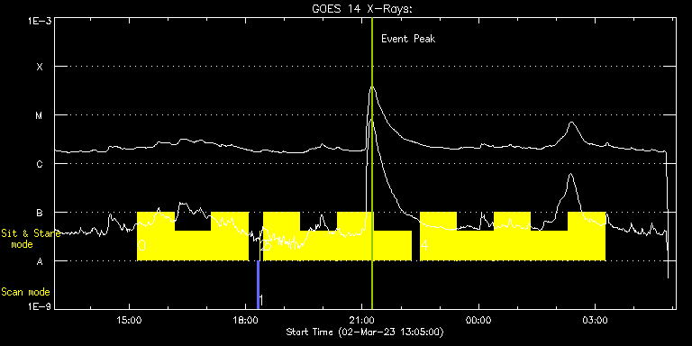 EIS Observation timeline overlay to GOES-Xray curve Code 1" 2" 40" 266" EIS Observations list for this event: STUDY ACRONYM ID DATE OBSERVED DESCRIPTION NOAA# TARGET 0 Flare266_Hunter01 | 85328 | 2023/03/02 15:13:13 | Flare hunt on AR13234 | 3234 | Flare TIMELINE ID DATE OBSERVED FITS FILE XCEN (+W/-E) YCEN (+N/-S) DUR ----------------------------------------------------------------------------------------------------------------- 85328 | 2023/03/02 15:13:13.000 | eis_l0_20230302_151313.fits.gz | 704.14 | 433.46 | 56m22s 85328 | 2023/03/02 16:10:27.000 | eis_l0_20230302_161027.fits.gz | 708.70 | 432.61 | 56m23s 85328 | 2023/03/02 17:07:42.000 | eis_l0_20230302_170742.fits.gz | 713.18 | 431.76 | 56m22s 1 PRY_slot_contextLITE | 85329 | 2023/03/02 18:18:27 | Pointing monitoring | | Active Region TIMELINE ID DATE OBSERVED FITS FILE XCEN (+W/-E) YCEN (+N/-S) DUR ----------------------------------------------------------------------------------------------------------------- 85329 | 2023/03/02 18:18:27.000 | eis_l0_20230302_181827.fits.gz | 0.68 | -195.00 | 2m56s 2 XRT_synop_AIA | 85330 | 2023/03/02 18:21:42 | Pointing monitoring | | Quiet Sun TIMELINE ID DATE OBSERVED FITS FILE XCEN (+W/-E) YCEN (+N/-S) DUR ----------------------------------------------------------------------------------------------------------------- 85330 | 2023/03/02 18:21:42.000 | eis_l0_20230302_182142.fits.gz | 0.43 | -207.00 | 10s 3 Flare266_Hunter01 | 85331 | 2023/03/02 18:27:13 | Flare hunt on AR13234 | 3234 | Flare TIMELINE ID DATE OBSERVED FITS FILE XCEN (+W/-E) YCEN (+N/-S) DUR ----------------------------------------------------------------------------------------------------------------- 85331 | 2023/03/02 18:27:13.000 | eis_l0_20230302_182713.fits.gz | 719.44 | 430.60 | 56m22s 85331 | 2023/03/02 19:24:27.000 | eis_l0_20230302_192427.fits.gz | 723.69 | 429.75 | 56m22s 85331 | 2023/03/02 20:21:42.000 | eis_l0_20230302_202142.fits.gz | 727.93 | 428.90 | 56m22s 85331 | 2023/03/02 21:18:56.000 | eis_l0_20230302_211856.fits.gz | 732.18 | 428.05 | 56m22s 4 Flare266_Hunter01 | 85332 | 2023/03/02 22:29:13 | Flare hunt on AR13234 | 3234 | Flare TIMELINE ID DATE OBSERVED FITS FILE XCEN (+W/-E) YCEN (+N/-S) DUR ----------------------------------------------------------------------------------------------------------------- 85332 | 2023/03/02 22:29:13.000 | eis_l0_20230302_222913.fits.gz | 737.28 | 426.97 | 56m22s 85332 | 2023/03/02 23:26:27.000 | eis_l0_20230302_232627.fits.gz | 741.38 | 426.12 | 56m23s 85332 | 2023/03/03 00:23:42.000 | eis_l0_20230303_002342.fits.gz | 745.39 | 425.19 | 56m22s 85332 | 2023/03/03 01:20:56.000 | eis_l0_20230303_012056.fits.gz | 749.33 | 424.27 | 56m23s 85332 | 2023/03/03 02:18:11.000 | eis_l0_20230303_021811.fits.gz | 753.20 | 423.42 | 56m22s : Check study information : Download file : View thumbnails For this event, also check for: