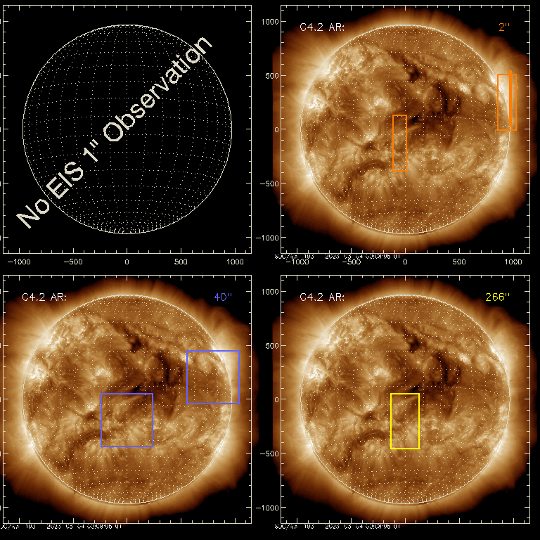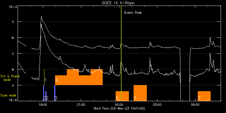 EIS Observation timeline overlay to GOES-Xray curve Code 1" 2" 40" 266" EIS Observations list for this event: STUDY ACRONYM ID DATE OBSERVED DESCRIPTION NOAA# TARGET 0 PRY_slot_contextLITE | 85333 | 2023/03/03 18:02:26 | Pointing monitoring | | Active Region TIMELINE ID DATE OBSERVED FITS FILE XCEN (+W/-E) YCEN (+N/-S) DUR ----------------------------------------------------------------------------------------------------------------- 85333 | 2023/03/03 18:02:26.000 | eis_l0_20230303_180226.fits.gz | 0.61 | -194.92 | 2m57s 1 XRT_synop_AIA | 85334 | 2023/03/03 18:05:41 | Pointing monitoring | | Quiet Sun TIMELINE ID DATE OBSERVED FITS FILE XCEN (+W/-E) YCEN (+N/-S) DUR ----------------------------------------------------------------------------------------------------------------- 85334 | 2023/03/03 18:05:41.000 | eis_l0_20230303_180541.fits.gz | 0.43 | -207.00 | 10s 2 PRY_slot_context_v3 | 85340 | 2023/03/03 18:12:26 | AR13234: slot raster | 3234 | Active Region TIMELINE ID DATE OBSERVED FITS FILE XCEN (+W/-E) YCEN (+N/-S) DUR ----------------------------------------------------------------------------------------------------------------- 85340 | 2023/03/03 18:12:26.000 | eis_l0_20230303_181226.fits.gz | 797.16 | 202.12 | 2m56s 3 PRY_slot_context_v3 | 85341 | 2023/03/03 18:54:12 | AR13234: slot raster | 3234 | Active Region TIMELINE ID DATE OBSERVED FITS FILE XCEN (+W/-E) YCEN (+N/-S) DUR ----------------------------------------------------------------------------------------------------------------- 85341 | 2023/03/03 18:54:12.000 | eis_l0_20230303_185412.fits.gz | 799.09 | 201.27 | 2m57s 4 HPW021VEL001x512v2 | 85342 | 2023/03/03 18:57:34 | AR13234: sit-n-stare off-limb | | Active Region TIMELINE ID DATE OBSERVED FITS FILE XCEN (+W/-E) YCEN (+N/-S) DUR ----------------------------------------------------------------------------------------------------------------- 85342 | 2023/03/03 18:57:34.000 | eis_l0_20230303_185734.fits.gz | 972.23 | 283.27 | 55m49s 85342 | 2023/03/03 19:53:31.000 | eis_l0_20230303_195331.fits.gz | 974.78 | 282.35 | 55m50s 85342 | 2023/03/03 20:49:28.000 | eis_l0_20230303_204928.fits.gz | 977.48 | 281.34 | 55m50s 85342 | 2023/03/03 21:45:26.000 | eis_l0_20230303_214526.fits.gz | 979.96 | 280.41 | 55m50s 5 Large_CH_Map | 85335 | 2023/03/03 23:43:42 | HOP393: cycle 24/25 equatorial transit | | Quiet Sun TIMELINE ID DATE OBSERVED FITS FILE XCEN (+W/-E) YCEN (+N/-S) DUR ----------------------------------------------------------------------------------------------------------------- 85335 | 2023/03/03 23:43:42.000 | eis_l0_20230303_234342.fits.gz | -47.95 | -129.80 | 1h1m52s 6 Large_CH_Map | 85336 | 2023/03/04 01:08:42 | HOP393: cycle 24/25 equatorial transit | | Quiet Sun TIMELINE ID DATE OBSERVED FITS FILE XCEN (+W/-E) YCEN (+N/-S) DUR ----------------------------------------------------------------------------------------------------------------- 85336 | 2023/03/04 01:08:42.000 | eis_l0_20230304_010842.fits.gz | -47.95 | -129.80 | 1h1m53s 7 HPW021VEL260x512v2 | 85343 | 2023/03/04 06:12:12 | AR13234: raster off-limb | | Active Region TIMELINE ID DATE OBSERVED FITS FILE XCEN (+W/-E) YCEN (+N/-S) DUR ----------------------------------------------------------------------------------------------------------------- 85343 | 2023/03/04 06:12:12.000 | eis_l0_20230304_061212.fits.gz | 943.90 | 247.84 | 1h0m45s : Check study information : Download file : View thumbnails For this event, also check for: