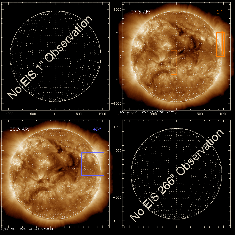 EIS Observation timeline overlay to GOES-Xray curve Code 1" 2" 40" 266" EIS Observations list for this event: STUDY ACRONYM ID DATE OBSERVED DESCRIPTION NOAA# TARGET 0 PRY_slot_context_v3 | 85341 | 2023/03/03 18:54:12 | AR13234: slot raster | 3234 | Active Region TIMELINE ID DATE OBSERVED FITS FILE XCEN (+W/-E) YCEN (+N/-S) DUR ----------------------------------------------------------------------------------------------------------------- 85341 | 2023/03/03 18:54:12.000 | eis_l0_20230303_185412.fits.gz | 799.09 | 201.27 | 2m57s 1 HPW021VEL001x512v2 | 85342 | 2023/03/03 18:57:34 | AR13234: sit-n-stare off-limb | | Active Region TIMELINE ID DATE OBSERVED FITS FILE XCEN (+W/-E) YCEN (+N/-S) DUR ----------------------------------------------------------------------------------------------------------------- 85342 | 2023/03/03 18:57:34.000 | eis_l0_20230303_185734.fits.gz | 972.23 | 283.27 | 55m49s 85342 | 2023/03/03 19:53:31.000 | eis_l0_20230303_195331.fits.gz | 974.78 | 282.35 | 55m50s 85342 | 2023/03/03 20:49:28.000 | eis_l0_20230303_204928.fits.gz | 977.48 | 281.34 | 55m50s 85342 | 2023/03/03 21:45:26.000 | eis_l0_20230303_214526.fits.gz | 979.96 | 280.41 | 55m50s 2 Large_CH_Map | 85335 | 2023/03/03 23:43:42 | HOP393: cycle 24/25 equatorial transit | | Quiet Sun TIMELINE ID DATE OBSERVED FITS FILE XCEN (+W/-E) YCEN (+N/-S) DUR ----------------------------------------------------------------------------------------------------------------- 85335 | 2023/03/03 23:43:42.000 | eis_l0_20230303_234342.fits.gz | -47.95 | -129.80 | 1h1m52s 3 Large_CH_Map | 85336 | 2023/03/04 01:08:42 | HOP393: cycle 24/25 equatorial transit | | Quiet Sun TIMELINE ID DATE OBSERVED FITS FILE XCEN (+W/-E) YCEN (+N/-S) DUR ----------------------------------------------------------------------------------------------------------------- 85336 | 2023/03/04 01:08:42.000 | eis_l0_20230304_010842.fits.gz | -47.95 | -129.80 | 1h1m53s 4 HPW021VEL260x512v2 | 85343 | 2023/03/04 06:12:12 | AR13234: raster off-limb | | Active Region TIMELINE ID DATE OBSERVED FITS FILE XCEN (+W/-E) YCEN (+N/-S) DUR ----------------------------------------------------------------------------------------------------------------- 85343 | 2023/03/04 06:12:12.000 | eis_l0_20230304_061212.fits.gz | 943.90 | 247.84 | 1h0m45s : Check study information : Download file : View thumbnails For this event, also check for: