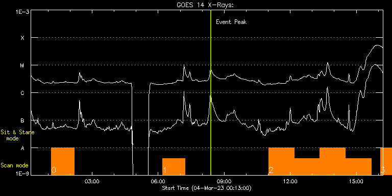 EIS Observation timeline overlay to GOES-Xray curve Code 1" 2" 40" 266" EIS Observations list for this event: STUDY ACRONYM ID DATE OBSERVED DESCRIPTION NOAA# TARGET 0 Large_CH_Map | 85336 | 2023/03/04 01:08:42 | HOP393: cycle 24/25 equatorial transit | | Quiet Sun TIMELINE ID DATE OBSERVED FITS FILE XCEN (+W/-E) YCEN (+N/-S) DUR ----------------------------------------------------------------------------------------------------------------- 85336 | 2023/03/04 01:08:42.000 | eis_l0_20230304_010842.fits.gz | -47.95 | -129.80 | 1h1m53s 1 HPW021VEL260x512v2 | 85343 | 2023/03/04 06:12:12 | AR13234: raster off-limb | | Active Region TIMELINE ID DATE OBSERVED FITS FILE XCEN (+W/-E) YCEN (+N/-S) DUR ----------------------------------------------------------------------------------------------------------------- 85343 | 2023/03/04 06:12:12.000 | eis_l0_20230304_061212.fits.gz | 943.90 | 247.84 | 1h0m45s 2 HOP81_new_study | 85344 | 2023/03/04 11:01:15 | HOP 206 (Polar Panorama Map) S. Pole | | Coronal Hole TIMELINE ID DATE OBSERVED FITS FILE XCEN (+W/-E) YCEN (+N/-S) DUR ----------------------------------------------------------------------------------------------------------------- 85344 | 2023/03/04 11:01:15.000 | eis_l0_20230304_110115.fits.gz | -20.99 | -1030.03 | 1h9m44s 85344 | 2023/03/04 12:11:04.000 | eis_l0_20230304_121104.fits.gz | -20.91 | -1029.95 | 1h9m45s 85344 | 2023/03/04 13:20:53.000 | eis_l0_20230304_132053.fits.gz | -20.91 | -1029.95 | 1h9m45s 85344 | 2023/03/04 14:30:43.000 | eis_l0_20230304_143043.fits.gz | -20.91 | -1030.03 | 1h9m45s 3 HOP81_new_study | 85345 | 2023/03/04 16:05:44 | HOP 206 (Polar Panorama Map) S. Pole | | Coronal Hole TIMELINE ID DATE OBSERVED FITS FILE XCEN (+W/-E) YCEN (+N/-S) DUR ----------------------------------------------------------------------------------------------------------------- 85345 | 2023/03/04 16:05:44.000 | eis_l0_20230304_160544.fits.gz | -20.08 | -1102.03 | 1h9m44s : Check study information : Download file : View thumbnails For this event, also check for:
