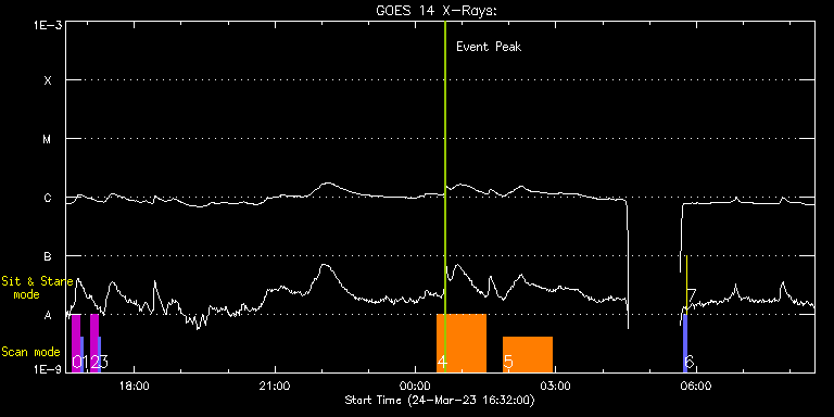 EIS Observation timeline overlay to GOES-Xray curve Code 1" 2" 40" 266" EIS Observations list for this event: STUDY ACRONYM ID DATE OBSERVED DESCRIPTION NOAA# TARGET 0 SK_DEEP_5x512_SLIT1 | 85586 | 2023/03/24 16:40:19 | HOP412 18/20 | | Quiet Sun TIMELINE ID DATE OBSERVED FITS FILE XCEN (+W/-E) YCEN (+N/-S) DUR ----------------------------------------------------------------------------------------------------------------- 85586 | 2023/03/24 16:40:19.000 | eis_l0_20230324_164019.fits.gz | -19.67 | 565.04 | 10m8s 1 PRY_slot_contextLITE | 85587 | 2023/03/24 16:50:53 | HOP412 18/20 | 3260 | Active Region TIMELINE ID DATE OBSERVED FITS FILE XCEN (+W/-E) YCEN (+N/-S) DUR ----------------------------------------------------------------------------------------------------------------- 85587 | 2023/03/24 16:50:53.000 | eis_l0_20230324_165053.fits.gz | -19.42 | 576.97 | 2m56s 2 SK_DEEP_5x512_SLIT1 | 85588 | 2023/03/24 17:03:19 | HOP412 19/20 | | Quiet Sun TIMELINE ID DATE OBSERVED FITS FILE XCEN (+W/-E) YCEN (+N/-S) DUR ----------------------------------------------------------------------------------------------------------------- 85588 | 2023/03/24 17:03:19.000 | eis_l0_20230324_170319.fits.gz | -19.67 | 665.08 | 10m8s 3 PRY_slot_contextLITE | 85589 | 2023/03/24 17:13:52 | HOP412 19/20 | 3260 | Active Region TIMELINE ID DATE OBSERVED FITS FILE XCEN (+W/-E) YCEN (+N/-S) DUR ----------------------------------------------------------------------------------------------------------------- 85589 | 2023/03/24 17:13:52.000 | eis_l0_20230324_171352.fits.gz | -19.35 | 677.00 | 2m57s 4 Large_CH_Map | 85594 | 2023/03/25 00:28:02 | HOP393 Cycle 24/25 equatorial transiti | 3256 | Quiet Sun TIMELINE ID DATE OBSERVED FITS FILE XCEN (+W/-E) YCEN (+N/-S) DUR ----------------------------------------------------------------------------------------------------------------- 85594 | 2023/03/25 00:28:02.000 | eis_l0_20230325_002802.fits.gz | -16.57 | -63.91 | 1h1m53s 5 Large_CH_Map | 85595 | 2023/03/25 01:53:12 | HOP393 Cycle 24/25 equatorial transiti | 3256 | Quiet Sun TIMELINE ID DATE OBSERVED FITS FILE XCEN (+W/-E) YCEN (+N/-S) DUR ----------------------------------------------------------------------------------------------------------------- 85595 | 2023/03/25 01:53:12.000 | eis_l0_20230325_015312.fits.gz | -3.21 | -64.06 | 1h1m52s 6 PRY_slot_contextLITE | 85596 | 2023/03/25 05:44:18 | Pointing Moniter | 3256 | Active Region TIMELINE ID DATE OBSERVED FITS FILE XCEN (+W/-E) YCEN (+N/-S) DUR ----------------------------------------------------------------------------------------------------------------- 85596 | 2023/03/25 05:44:18.000 | eis_l0_20230325_054418.fits.gz | 0.68 | -194.92 | 2m57s 7 XRT_synop_AIA | 85597 | 2023/03/25 05:47:33 | Pointing Moniter | 3256 | Quiet Sun TIMELINE ID DATE OBSERVED FITS FILE XCEN (+W/-E) YCEN (+N/-S) DUR ----------------------------------------------------------------------------------------------------------------- 85597 | 2023/03/25 05:47:33.000 | eis_l0_20230325_054733.fits.gz | 0.43 | -206.92 | 10s : Check study information : Download file : View thumbnails For this event, also check for: