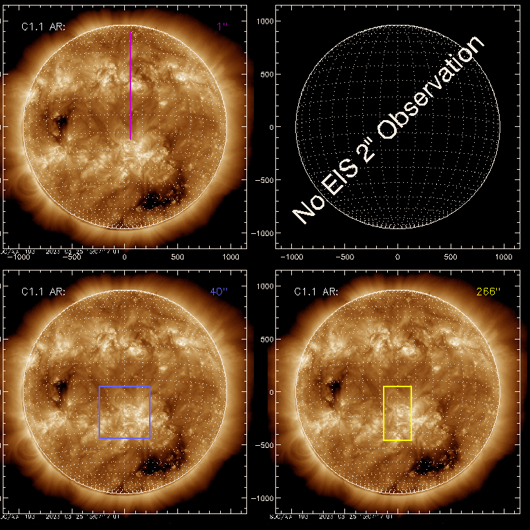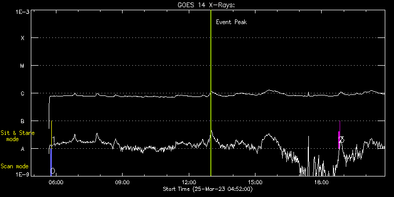 EIS Observation timeline overlay to GOES-Xray curve Code 1" 2" 40" 266" EIS Observations list for this event: STUDY ACRONYM ID DATE OBSERVED DESCRIPTION NOAA# TARGET 0 PRY_slot_contextLITE | 85596 | 2023/03/25 05:44:18 | Pointing Moniter | 3256 | Active Region TIMELINE ID DATE OBSERVED FITS FILE XCEN (+W/-E) YCEN (+N/-S) DUR ----------------------------------------------------------------------------------------------------------------- 85596 | 2023/03/25 05:44:18.000 | eis_l0_20230325_054418.fits.gz | 0.68 | -194.92 | 2m57s 1 XRT_synop_AIA | 85597 | 2023/03/25 05:47:33 | Pointing Moniter | 3256 | Quiet Sun TIMELINE ID DATE OBSERVED FITS FILE XCEN (+W/-E) YCEN (+N/-S) DUR ----------------------------------------------------------------------------------------------------------------- 85597 | 2023/03/25 05:47:33.000 | eis_l0_20230325_054733.fits.gz | 0.43 | -206.92 | 10s 2 regcal074 | 85644 | 2023/03/25 18:45:11 | Dark exposures including overscan pixe | | Engineering TIMELINE ID DATE OBSERVED FITS FILE XCEN (+W/-E) YCEN (+N/-S) DUR ----------------------------------------------------------------------------------------------------------------- 85644 | 2023/03/25 18:45:11.000 | eis_l0_20230325_184511.fits.gz | 56.26 | 646.93 | 3m22s 3 regcal076 | 85645 | 2023/03/25 18:49:00 | Flatfield, 1 exposure, led 100ms, ccd | | Engineering TIMELINE ID DATE OBSERVED FITS FILE XCEN (+W/-E) YCEN (+N/-S) DUR ----------------------------------------------------------------------------------------------------------------- 85645 | 2023/03/25 18:49:00.000 | eis_l0_20230325_184900.fits.gz | 56.72 | 135.01 | 1s : Check study information : Download file : View thumbnails For this event, also check for: