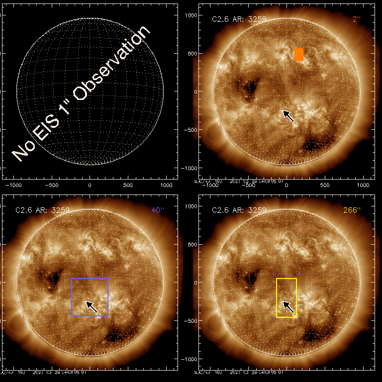 EIS Observation timeline overlay to GOES-Xray curve Code 1" 2" 40" 266" EIS Observations list for this event: STUDY ACRONYM ID DATE OBSERVED DESCRIPTION NOAA# TARGET 0 PRY_slot_contextLITE | 85638 | 2023/03/26 06:00:26 | Pointing Monitoring | 3256 | Active Region TIMELINE ID DATE OBSERVED FITS FILE XCEN (+W/-E) YCEN (+N/-S) DUR ----------------------------------------------------------------------------------------------------------------- 85638 | 2023/03/26 06:00:26.000 | eis_l0_20230326_060026.fits.gz | 0.76 | -195.00 | 2m56s 1 XRT_synop_AIA | 85639 | 2023/03/26 06:03:41 | Pointing Monitoring | 3256 | Quiet Sun TIMELINE ID DATE OBSERVED FITS FILE XCEN (+W/-E) YCEN (+N/-S) DUR ----------------------------------------------------------------------------------------------------------------- 85639 | 2023/03/26 06:03:41.000 | eis_l0_20230326_060341.fits.gz | 0.43 | -206.92 | 10s 2 HH_Flare+AR_180x152 | 85624 | 2023/03/26 06:13:20 | HOP449 Hot onset flare precursor event | | Flare TIMELINE ID DATE OBSERVED FITS FILE XCEN (+W/-E) YCEN (+N/-S) DUR ----------------------------------------------------------------------------------------------------------------- 85624 | 2023/03/26 06:13:20.000 | eis_l0_20230326_061320.fits.gz | 137.93 | 479.23 | 5m17s 85624 | 2023/03/26 06:18:40.000 | eis_l0_20230326_061840.fits.gz | 138.62 | 479.08 | 5m18s 85624 | 2023/03/26 06:24:00.000 | eis_l0_20230326_062400.fits.gz | 139.39 | 479.16 | 5m18s 85624 | 2023/03/26 06:29:21.000 | eis_l0_20230326_062921.fits.gz | 140.09 | 479.08 | 5m18s 85624 | 2023/03/26 06:34:42.000 | eis_l0_20230326_063442.fits.gz | 140.86 | 479.00 | 5m18s 85624 | 2023/03/26 06:40:03.000 | eis_l0_20230326_064003.fits.gz | 141.55 | 479.08 | 5m18s 3 HH_Flare+AR_180x152 | 85625 | 2023/03/26 07:18:39 | HOP449 Hot onset flare precursor event | | Flare TIMELINE ID DATE OBSERVED FITS FILE XCEN (+W/-E) YCEN (+N/-S) DUR ----------------------------------------------------------------------------------------------------------------- 85625 | 2023/03/26 07:18:39.000 | eis_l0_20230326_071839.fits.gz | 146.89 | 478.92 | 5m18s 85625 | 2023/03/26 07:24:00.000 | eis_l0_20230326_072400.fits.gz | 147.58 | 479.00 | 5m19s 85625 | 2023/03/26 07:29:22.000 | eis_l0_20230326_072922.fits.gz | 148.35 | 479.00 | 5m18s 85625 | 2023/03/26 07:34:42.000 | eis_l0_20230326_073442.fits.gz | 149.13 | 478.92 | 5m18s 85625 | 2023/03/26 07:40:03.000 | eis_l0_20230326_074003.fits.gz | 149.82 | 478.92 | 5m19s 85625 | 2023/03/26 07:45:25.000 | eis_l0_20230326_074525.fits.gz | 150.59 | 478.85 | 5m17s 85625 | 2023/03/26 07:50:45.000 | eis_l0_20230326_075045.fits.gz | 151.29 | 478.85 | 5m17s 85625 | 2023/03/26 07:56:05.000 | eis_l0_20230326_075605.fits.gz | 152.06 | 478.77 | 5m18s 85625 | 2023/03/26 08:01:26.000 | eis_l0_20230326_080126.fits.gz | 152.68 | 478.77 | 5m18s 85625 | 2023/03/26 08:06:47.000 | eis_l0_20230326_080647.fits.gz | 153.45 | 478.77 | 5m18s 85625 | 2023/03/26 08:12:08.000 | eis_l0_20230326_081208.fits.gz | 154.22 | 478.69 | 5m18s 85625 | 2023/03/26 08:17:29.000 | eis_l0_20230326_081729.fits.gz | 155.00 | 478.69 | 5m17s 4 HH_Flare+AR_180x152 | 85626 | 2023/03/26 08:55:39 | HOP449 Hot onset flare precursor event | | Flare TIMELINE ID DATE OBSERVED FITS FILE XCEN (+W/-E) YCEN (+N/-S) DUR ----------------------------------------------------------------------------------------------------------------- 85626 | 2023/03/26 08:55:39.000 | eis_l0_20230326_085539.fits.gz | 160.17 | 478.62 | 5m19s 85626 | 2023/03/26 09:01:01.000 | eis_l0_20230326_090101.fits.gz | 160.87 | 478.54 | 5m18s 85626 | 2023/03/26 09:06:22.000 | eis_l0_20230326_090622.fits.gz | 161.64 | 478.62 | 5m18s 85626 | 2023/03/26 09:11:43.000 | eis_l0_20230326_091143.fits.gz | 162.41 | 478.62 | 5m18s 85626 | 2023/03/26 09:17:04.000 | eis_l0_20230326_091704.fits.gz | 163.11 | 478.54 | 5m18s 85626 | 2023/03/26 09:22:25.000 | eis_l0_20230326_092225.fits.gz | 163.88 | 478.46 | 5m18s 85626 | 2023/03/26 09:27:46.000 | eis_l0_20230326_092746.fits.gz | 164.57 | 478.46 | 5m18s 85626 | 2023/03/26 09:33:07.000 | eis_l0_20230326_093307.fits.gz | 165.35 | 478.38 | 5m18s 85626 | 2023/03/26 09:38:28.000 | eis_l0_20230326_093828.fits.gz | 166.04 | 478.38 | 5m18s 85626 | 2023/03/26 09:43:49.000 | eis_l0_20230326_094349.fits.gz | 166.74 | 478.31 | 5m18s 85626 | 2023/03/26 09:49:10.000 | eis_l0_20230326_094910.fits.gz | 167.43 | 478.38 | 5m18s 85626 | 2023/03/26 09:54:31.000 | eis_l0_20230326_095431.fits.gz | 168.21 | 478.31 | 5m18s 85626 | 2023/03/26 09:59:51.000 | eis_l0_20230326_095951.fits.gz | 168.98 | 478.23 | 5m18s 5 HH_Flare+AR_180x152 | 85627 | 2023/03/26 10:31:09 | HOP449 Hot onset flare precursor event | | Flare TIMELINE ID DATE OBSERVED FITS FILE XCEN (+W/-E) YCEN (+N/-S) DUR ----------------------------------------------------------------------------------------------------------------- 85627 | 2023/03/26 10:31:09.000 | eis_l0_20230326_103109.fits.gz | 173.23 | 478.15 | 5m19s 85627 | 2023/03/26 10:36:31.000 | eis_l0_20230326_103631.fits.gz | 173.92 | 478.15 | 5m17s 85627 | 2023/03/26 10:41:51.000 | eis_l0_20230326_104151.fits.gz | 174.70 | 478.15 | 5m18s 85627 | 2023/03/26 10:47:11.000 | eis_l0_20230326_104711.fits.gz | 175.39 | 478.15 | 5m19s 85627 | 2023/03/26 10:52:33.000 | eis_l0_20230326_105233.fits.gz | 176.16 | 478.15 | 5m18s 85627 | 2023/03/26 10:57:54.000 | eis_l0_20230326_105754.fits.gz | 176.86 | 478.08 | 5m18s 85627 | 2023/03/26 11:03:15.000 | eis_l0_20230326_110315.fits.gz | 177.63 | 478.08 | 5m17s 85627 | 2023/03/26 11:08:35.000 | eis_l0_20230326_110835.fits.gz | 178.32 | 478.00 | 5m18s 85627 | 2023/03/26 11:13:56.000 | eis_l0_20230326_111356.fits.gz | 179.02 | 477.92 | 5m18s 85627 | 2023/03/26 11:19:17.000 | eis_l0_20230326_111917.fits.gz | 179.79 | 477.92 | 5m18s 85627 | 2023/03/26 11:24:38.000 | eis_l0_20230326_112438.fits.gz | 180.49 | 477.92 | 5m18s 85627 | 2023/03/26 11:29:58.000 | eis_l0_20230326_112958.fits.gz | 181.26 | 477.92 | 5m19s 85627 | 2023/03/26 11:35:20.000 | eis_l0_20230326_113520.fits.gz |