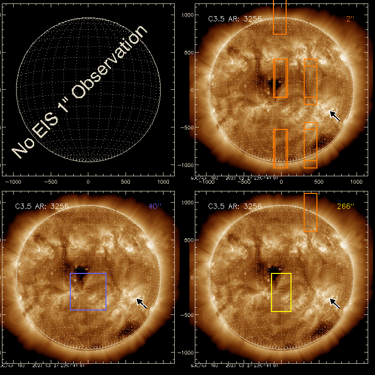 EIS Observation timeline overlay to GOES-Xray curve Code 1" 2" 40" 266" EIS Observations list for this event: STUDY ACRONYM ID DATE OBSERVED DESCRIPTION NOAA# TARGET 0 DHB_007_v3 | 85611 | 2023/03/27 13:16:42 | HOP453 04B/15 (EIS & SPICE Composition | | Active Region TIMELINE ID DATE OBSERVED FITS FILE XCEN (+W/-E) YCEN (+N/-S) DUR ----------------------------------------------------------------------------------------------------------------- 85611 | 2023/03/27 13:16:42.000 | eis_l0_20230327_131642.fits.gz | 391.42 | 56.10 | 1h4m51s 1 DHB_007_v3 | 85612 | 2023/03/27 14:33:41 | HOP453 05T/15 (EIS & SPICE Composition | 3264 | Active Region TIMELINE ID DATE OBSERVED FITS FILE XCEN (+W/-E) YCEN (+N/-S) DUR ----------------------------------------------------------------------------------------------------------------- 85612 | 2023/03/27 14:33:41.000 | eis_l0_20230327_143341.fits.gz | 391.34 | 152.92 | 1h4m54s 2 DHB_007_v3 | 85613 | 2023/03/27 16:31:41 | HOP453 05B/15 (EIS & SPICE Composition | | Active Region TIMELINE ID DATE OBSERVED FITS FILE XCEN (+W/-E) YCEN (+N/-S) DUR ----------------------------------------------------------------------------------------------------------------- 85613 | 2023/03/27 16:31:41.000 | eis_l0_20230327_163141.fits.gz | 391.42 | -791.00 | 1h4m51s 3 DHB_007_v3 | 85614 | 2023/03/27 18:08:11 | HOP453 06T/15 (EIS & SPICE Composition | | Active Region TIMELINE ID DATE OBSERVED FITS FILE XCEN (+W/-E) YCEN (+N/-S) DUR ----------------------------------------------------------------------------------------------------------------- 85614 | 2023/03/27 18:08:11.000 | eis_l0_20230327_180811.fits.gz | 391.34 | -694.17 | 1h4m54s 4 DHB_007_v3 | 85615 | 2023/03/27 19:44:41 | HOP453 06B/15 (EIS & SPICE Composition | | Active Region TIMELINE ID DATE OBSERVED FITS FILE XCEN (+W/-E) YCEN (+N/-S) DUR ----------------------------------------------------------------------------------------------------------------- 85615 | 2023/03/27 19:44:41.000 | eis_l0_20230327_194441.fits.gz | 391.50 | -1638.10 | 1h4m51s 5 DHB_007_v3 | 85616 | 2023/03/27 21:21:41 | HOP453 07T/15 (EIS & SPICE Composition | | Active Region TIMELINE ID DATE OBSERVED FITS FILE XCEN (+W/-E) YCEN (+N/-S) DUR ----------------------------------------------------------------------------------------------------------------- 85616 | 2023/03/27 21:21:41.000 | eis_l0_20230327_212141.fits.gz | -19.62 | 992.37 | 1h4m54s 6 DHB_007_v3 | 85617 | 2023/03/27 22:58:11 | HOP453 07B/15 (EIS & SPICE Composition | 3266 | Active Region TIMELINE ID DATE OBSERVED FITS FILE XCEN (+W/-E) YCEN (+N/-S) DUR ----------------------------------------------------------------------------------------------------------------- 85617 | 2023/03/27 22:58:11.000 | eis_l0_20230327_225811.fits.gz | -19.77 | 150.03 | 1h4m50s 7 DHB_007_v3 | 85618 | 2023/03/28 00:29:12 | HOP453 08T/15 (EIS & SPICE Composition | 3266 | Active Region TIMELINE ID DATE OBSERVED FITS FILE XCEN (+W/-E) YCEN (+N/-S) DUR ----------------------------------------------------------------------------------------------------------------- 85618 | 2023/03/28 00:29:12.000 | eis_l0_20230328_002912.fits.gz | 0.55 | 152.92 | 1h4m53s 8 DHB_007_v3 | 85619 | 2023/03/28 01:55:42 | HOP453 08B/15 (EIS & SPICE Composition | | Active Region TIMELINE ID DATE OBSERVED FITS FILE XCEN (+W/-E) YCEN (+N/-S) DUR ----------------------------------------------------------------------------------------------------------------- 85619 | 2023/03/28 01:55:42.000 | eis_l0_20230328_015542.fits.gz | 0.14 | -790.92 | 1h4m50s 9 PRY_slot_contextLITE | 85642 | 2023/03/28 03:04:18 | Pointing Monitoring | | Active Region TIMELINE ID DATE OBSERVED FITS FILE XCEN (+W/-E) YCEN (+N/-S) DUR ----------------------------------------------------------------------------------------------------------------- 85642 | 2023/03/28 03:04:18.000 | eis_l0_20230328_030418.fits.gz | 0.88 | -194.92 | 2m56s 10 XRT_synop_AIA | 85643 | 2023/03/28 03:07:33 | Pointing Monitoring | | Quiet Sun TIMELINE ID DATE OBSERVED FITS FILE XCEN (+W/-E) YCEN (+N/-S) DUR ----------------------------------------------------------------------------------------------------------------- 85643 | 2023/03/28 03:07:33.000 | eis_l0_20230328_030733.fits.gz | 0.38 | -207.00 | 10s 11 DHB_007_v3 | 85620 | 2023/03/28 03:32:48 | HOP453 09T/15 (EIS & SPICE Composition | | Active Region TIMELINE ID DATE OBSERVED FITS FILE XCEN (+W/-E) YCEN (+N/-S) DUR ----------------------------------------------------------------------------------------------------------------- 85620 | 2023/03/28 03:32:48.000 | eis_l0_20230328_033248.fits.gz | -19.92 | -788.11 | 1h4m53s : Check study information : Download file : View thumbnails For this event, also check for:
