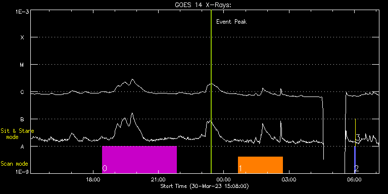 EIS Observation timeline overlay to GOES-Xray curve Code 1" 2" 40" 266" EIS Observations list for this event: STUDY ACRONYM ID DATE OBSERVED DESCRIPTION NOAA# TARGET 0 HPW021VEL240x512v2_b | 85676 | 2023/03/30 18:25:56 | HOP455 Slow Wind Connection coordinati | 3262 | Quiet Sun TIMELINE ID DATE OBSERVED FITS FILE XCEN (+W/-E) YCEN (+N/-S) DUR ----------------------------------------------------------------------------------------------------------------- 85676 | 2023/03/30 18:25:56.000 | eis_l0_20230330_182556.fits.gz | 397.11 | -365.14 | 3h23m48s 1 Atlas_120 | 85691 | 2023/03/31 00:40:26 | HOP455 Slow Wind Connection coordinati | | Quiet Sun TIMELINE ID DATE OBSERVED FITS FILE XCEN (+W/-E) YCEN (+N/-S) DUR ----------------------------------------------------------------------------------------------------------------- 85691 | 2023/03/31 00:40:26.000 | eis_l0_20230331_004026.fits.gz | 446.25 | -192.23 | 2h1m39s 2 PRY_slot_contextLITE | 85679 | 2023/03/31 05:59:19 | Pointing Monitoring | | Active Region TIMELINE ID DATE OBSERVED FITS FILE XCEN (+W/-E) YCEN (+N/-S) DUR ----------------------------------------------------------------------------------------------------------------- 85679 | 2023/03/31 05:59:19.000 | eis_l0_20230331_055919.fits.gz | 0.68 | -194.85 | 2m56s 3 XRT_synop_AIA | 85680 | 2023/03/31 06:02:33 | Pointing Monitoring | | Quiet Sun TIMELINE ID DATE OBSERVED FITS FILE XCEN (+W/-E) YCEN (+N/-S) DUR ----------------------------------------------------------------------------------------------------------------- 85680 | 2023/03/31 06:02:33.000 | eis_l0_20230331_060233.fits.gz | 0.36 | -206.85 | 10s : Check study information : Download file : View thumbnails For this event, also check for: