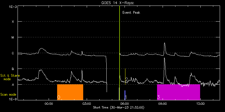 EIS Observation timeline overlay to GOES-Xray curve Code 1" 2" 40" 266" EIS Observations list for this event: STUDY ACRONYM ID DATE OBSERVED DESCRIPTION NOAA# TARGET 0 Atlas_120 | 85691 | 2023/03/31 00:40:26 | HOP455 Slow Wind Connection coordinati | | Quiet Sun TIMELINE ID DATE OBSERVED FITS FILE XCEN (+W/-E) YCEN (+N/-S) DUR ----------------------------------------------------------------------------------------------------------------- 85691 | 2023/03/31 00:40:26.000 | eis_l0_20230331_004026.fits.gz | 446.25 | -192.23 | 2h1m39s 1 PRY_slot_contextLITE | 85679 | 2023/03/31 05:59:19 | Pointing Monitoring | | Active Region TIMELINE ID DATE OBSERVED FITS FILE XCEN (+W/-E) YCEN (+N/-S) DUR ----------------------------------------------------------------------------------------------------------------- 85679 | 2023/03/31 05:59:19.000 | eis_l0_20230331_055919.fits.gz | 0.68 | -194.85 | 2m56s 2 XRT_synop_AIA | 85680 | 2023/03/31 06:02:33 | Pointing Monitoring | | Quiet Sun TIMELINE ID DATE OBSERVED FITS FILE XCEN (+W/-E) YCEN (+N/-S) DUR ----------------------------------------------------------------------------------------------------------------- 85680 | 2023/03/31 06:02:33.000 | eis_l0_20230331_060233.fits.gz | 0.36 | -206.85 | 10s 3 HPW021VEL240x512v2_b | 85681 | 2023/03/31 08:34:02 | HOP455 Slow Wind Connection coordinati | | Quiet Sun TIMELINE ID DATE OBSERVED FITS FILE XCEN (+W/-E) YCEN (+N/-S) DUR ----------------------------------------------------------------------------------------------------------------- 85681 | 2023/03/31 08:34:02.000 | eis_l0_20230331_083402.fits.gz | 505.95 | -372.87 | 3h23m48s : Check study information : Download file : View thumbnails For this event, also check for: