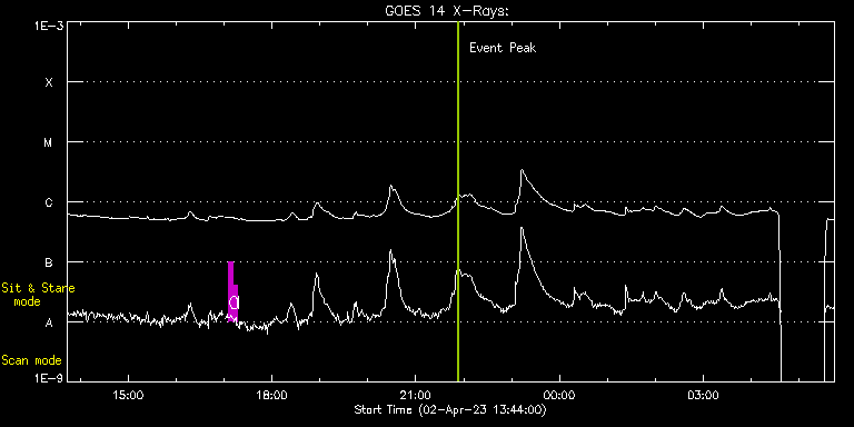 EIS Observation timeline overlay to GOES-Xray curve Code 1" 2" 40" 266" EIS Observations list for this event: STUDY ACRONYM ID DATE OBSERVED DESCRIPTION NOAA# TARGET 0 regcal081 | 85709 | 2023/04/02 17:06:11 | Dark exposures, CCD bottom rows (150s | | Engineering TIMELINE ID DATE OBSERVED FITS FILE XCEN (+W/-E) YCEN (+N/-S) DUR ----------------------------------------------------------------------------------------------------------------- 85709 | 2023/04/02 17:06:11.000 | eis_l0_20230402_170611.fits.gz | -5.85 | 44.16 | 5m2s 1 regcal082 | 85710 | 2023/04/02 17:11:40 | Dark exposures, top CCD rows (150s exp | | Engineering TIMELINE ID DATE OBSERVED FITS FILE XCEN (+W/-E) YCEN (+N/-S) DUR ----------------------------------------------------------------------------------------------------------------- 85710 | 2023/04/02 17:11:40.000 | eis_l0_20230402_171140.fits.gz | -5.85 | 1066.16 | 5m2s : Check study information : Download file : View thumbnails For this event, also check for: