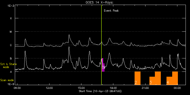 EIS Observation timeline overlay to GOES-Xray curve Code 1" 2" 40" 266" EIS Observations list for this event: STUDY ACRONYM ID DATE OBSERVED DESCRIPTION NOAA# TARGET 0 regcal081 | 85758 | 2023/04/10 16:56:39 | Dark exposures, CCD bottom rows (150s | | Engineering TIMELINE ID DATE OBSERVED FITS FILE XCEN (+W/-E) YCEN (+N/-S) DUR ----------------------------------------------------------------------------------------------------------------- 85758 | 2023/04/10 16:56:39.000 | eis_l0_20230410_165639.fits.gz | -442.60 | -1142.29 | 5m2s 1 regcal082 | 85759 | 2023/04/10 17:04:39 | Dark exposures, top CCD rows (150s exp | | Engineering TIMELINE ID DATE OBSERVED FITS FILE XCEN (+W/-E) YCEN (+N/-S) DUR ----------------------------------------------------------------------------------------------------------------- 85759 | 2023/04/10 17:04:39.000 | eis_l0_20230410_170439.fits.gz | -441.52 | -120.21 | 5m2s 2 Atlas_30 | 85773 | 2023/04/10 20:00:11 | Dynamics of coronal loops related to f | | Quiet Sun TIMELINE ID DATE OBSERVED FITS FILE XCEN (+W/-E) YCEN (+N/-S) DUR ----------------------------------------------------------------------------------------------------------------- 85773 | 2023/04/10 20:00:11.000 | eis_l0_20230410_200011.fits.gz | 238.07 | -314.52 | 31m39s 3 Atlas_30 | 85774 | 2023/04/10 21:23:11 | Dynamics of coronal loops related to f | | Quiet Sun TIMELINE ID DATE OBSERVED FITS FILE XCEN (+W/-E) YCEN (+N/-S) DUR ----------------------------------------------------------------------------------------------------------------- 85774 | 2023/04/10 21:23:11.000 | eis_l0_20230410_212311.fits.gz | 248.88 | -315.06 | 31m39s 85774 | 2023/04/10 21:54:59.000 | eis_l0_20230410_215459.fits.gz | 253.05 | -315.21 | 31m38s 4 Atlas_30 | 85775 | 2023/04/10 22:59:41 | Dynamics of coronal loops related to f | | Quiet Sun TIMELINE ID DATE OBSERVED FITS FILE XCEN (+W/-E) YCEN (+N/-S) DUR ----------------------------------------------------------------------------------------------------------------- 85775 | 2023/04/10 22:59:41.000 | eis_l0_20230410_225941.fits.gz | 261.39 | -315.45 | 31m39s 85775 | 2023/04/10 23:31:29.000 | eis_l0_20230410_233129.fits.gz | 265.57 | -315.76 | 31m40s : Check study information : Download file : View thumbnails For this event, also check for: