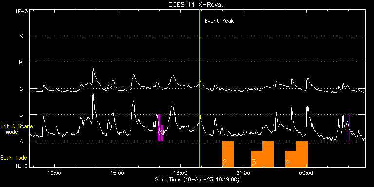 EIS Observation timeline overlay to GOES-Xray curve Code 1" 2" 40" 266" EIS Observations list for this event: STUDY ACRONYM ID DATE OBSERVED DESCRIPTION NOAA# TARGET 0 regcal081 | 85758 | 2023/04/10 16:56:39 | Dark exposures, CCD bottom rows (150s | | Engineering TIMELINE ID DATE OBSERVED FITS FILE XCEN (+W/-E) YCEN (+N/-S) DUR ----------------------------------------------------------------------------------------------------------------- 85758 | 2023/04/10 16:56:39.000 | eis_l0_20230410_165639.fits.gz | -442.60 | -1142.29 | 5m2s 1 regcal082 | 85759 | 2023/04/10 17:04:39 | Dark exposures, top CCD rows (150s exp | | Engineering TIMELINE ID DATE OBSERVED FITS FILE XCEN (+W/-E) YCEN (+N/-S) DUR ----------------------------------------------------------------------------------------------------------------- 85759 | 2023/04/10 17:04:39.000 | eis_l0_20230410_170439.fits.gz | -441.52 | -120.21 | 5m2s 2 Atlas_30 | 85773 | 2023/04/10 20:00:11 | Dynamics of coronal loops related to f | | Quiet Sun TIMELINE ID DATE OBSERVED FITS FILE XCEN (+W/-E) YCEN (+N/-S) DUR ----------------------------------------------------------------------------------------------------------------- 85773 | 2023/04/10 20:00:11.000 | eis_l0_20230410_200011.fits.gz | 238.07 | -314.52 | 31m39s 3 Atlas_30 | 85774 | 2023/04/10 21:23:11 | Dynamics of coronal loops related to f | | Quiet Sun TIMELINE ID DATE OBSERVED FITS FILE XCEN (+W/-E) YCEN (+N/-S) DUR ----------------------------------------------------------------------------------------------------------------- 85774 | 2023/04/10 21:23:11.000 | eis_l0_20230410_212311.fits.gz | 248.88 | -315.06 | 31m39s 85774 | 2023/04/10 21:54:59.000 | eis_l0_20230410_215459.fits.gz | 253.05 | -315.21 | 31m38s 4 Atlas_30 | 85775 | 2023/04/10 22:59:41 | Dynamics of coronal loops related to f | | Quiet Sun TIMELINE ID DATE OBSERVED FITS FILE XCEN (+W/-E) YCEN (+N/-S) DUR ----------------------------------------------------------------------------------------------------------------- 85775 | 2023/04/10 22:59:41.000 | eis_l0_20230410_225941.fits.gz | 261.39 | -315.45 | 31m39s 85775 | 2023/04/10 23:31:29.000 | eis_l0_20230410_233129.fits.gz | 265.57 | -315.76 | 31m40s 5 regcal070 | 85760 | 2023/04/11 02:02:09 | Flat field with overscan pixels (50*8) | | Engineering TIMELINE ID DATE OBSERVED FITS FILE XCEN (+W/-E) YCEN (+N/-S) DUR ----------------------------------------------------------------------------------------------------------------- 85760 | 2023/04/11 02:02:09.000 | eis_l0_20230411_020209.fits.gz | 14.93 | 205.15 | 3s : Check study information : Download file : View thumbnails For this event, also check for: