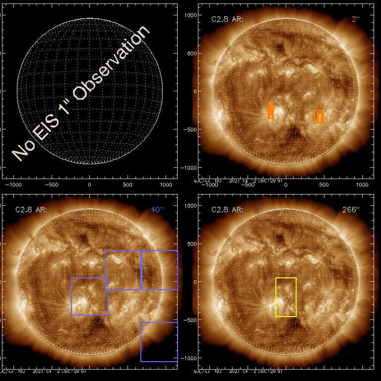 EIS Observation timeline overlay to GOES-Xray curve Code 1" 2" 40" 266" EIS Observations list for this event: STUDY ACRONYM ID DATE OBSERVED DESCRIPTION NOAA# TARGET 0 Atlas_60 | 85797 | 2023/04/11 21:02:13 | Nanoflares context. | | Quiet Sun TIMELINE ID DATE OBSERVED FITS FILE XCEN (+W/-E) YCEN (+N/-S) DUR ----------------------------------------------------------------------------------------------------------------- 85797 | 2023/04/11 21:02:13.000 | eis_l0_20230411_210213.fits.gz | 435.77 | -338.78 | 1h1m39s 1 EL_DHB_01 | 85798 | 2023/04/11 22:04:01 | Nanoflares. | | Flare TIMELINE ID DATE OBSERVED FITS FILE XCEN (+W/-E) YCEN (+N/-S) DUR ----------------------------------------------------------------------------------------------------------------- 85798 | 2023/04/11 22:04:01.000 | eis_l0_20230411_220401.fits.gz | 442.80 | -335.16 | 4m50s 85798 | 2023/04/11 22:08:54.000 | eis_l0_20230411_220854.fits.gz | 443.42 | -335.16 | 4m50s 85798 | 2023/04/11 22:13:47.000 | eis_l0_20230411_221347.fits.gz | 443.96 | -335.24 | 4m50s 85798 | 2023/04/11 22:18:40.000 | eis_l0_20230411_221840.fits.gz | 444.58 | -335.24 | 4m51s 85798 | 2023/04/11 22:23:33.000 | eis_l0_20230411_222333.fits.gz | 445.12 | -335.39 | 4m51s 85798 | 2023/04/11 22:28:27.000 | eis_l0_20230411_222827.fits.gz | 445.66 | -335.47 | 4m50s 85798 | 2023/04/11 22:33:20.000 | eis_l0_20230411_223320.fits.gz | 446.20 | -335.39 | 4m50s 85798 | 2023/04/11 22:38:13.000 | eis_l0_20230411_223813.fits.gz | 446.82 | -335.47 | 4m51s 85798 | 2023/04/11 22:43:07.000 | eis_l0_20230411_224307.fits.gz | 447.36 | -335.47 | 4m50s 85798 | 2023/04/11 22:47:59.000 | eis_l0_20230411_224759.fits.gz | 447.90 | -335.47 | 4m51s 85798 | 2023/04/11 22:52:52.000 | eis_l0_20230411_225252.fits.gz | 448.44 | -335.63 | 4m50s 85798 | 2023/04/11 22:57:45.000 | eis_l0_20230411_225745.fits.gz | 449.06 | -335.63 | 4m50s 85798 | 2023/04/11 23:02:38.000 | eis_l0_20230411_230238.fits.gz | 449.52 | -335.63 | 4m50s 85798 | 2023/04/11 23:07:31.000 | eis_l0_20230411_230731.fits.gz | 450.14 | -335.63 | 4m51s 85798 | 2023/04/11 23:12:24.000 | eis_l0_20230411_231224.fits.gz | 450.68 | -335.63 | 4m51s 85798 | 2023/04/11 23:17:17.000 | eis_l0_20230411_231717.fits.gz | 451.30 | -335.78 | 4m51s 85798 | 2023/04/11 23:22:11.000 | eis_l0_20230411_232211.fits.gz | 451.84 | -335.78 | 4m50s 85798 | 2023/04/11 23:27:03.000 | eis_l0_20230411_232703.fits.gz | 452.38 | -335.78 | 4m51s 85798 | 2023/04/11 23:31:57.000 | eis_l0_20230411_233157.fits.gz | 453.00 | -335.86 | 4m50s 85798 | 2023/04/11 23:36:49.000 | eis_l0_20230411_233649.fits.gz | 453.46 | -335.93 | 4m50s 85798 | 2023/04/11 23:41:42.000 | eis_l0_20230411_234142.fits.gz | 454.00 | -336.01 | 4m50s 2 EL_DHB_01v2 | 85828 | 2023/04/12 01:00:13 | Coronal magnetic field measurements in | | Quiet Sun TIMELINE ID DATE OBSERVED FITS FILE XCEN (+W/-E) YCEN (+N/-S) DUR ----------------------------------------------------------------------------------------------------------------- 85828 | 2023/04/12 01:00:13.000 | eis_l0_20230412_010013.fits.gz | -206.48 | -283.79 | 4m50s 85828 | 2023/04/12 01:05:05.000 | eis_l0_20230412_010505.fits.gz | -205.86 | -283.71 | 4m51s 85828 | 2023/04/12 01:09:58.000 | eis_l0_20230412_010958.fits.gz | -205.17 | -283.71 | 4m51s 85828 | 2023/04/12 01:14:52.000 | eis_l0_20230412_011452.fits.gz | -204.47 | -283.71 | 2m53s 85828 | 2023/04/12 01:36:44.000 | eis_l0_20230412_013644.fits.gz | -201.54 | -283.79 | 2m30s 85828 | 2023/04/12 01:39:17.000 | eis_l0_20230412_013917.fits.gz | -201.15 | -283.79 | 4m50s 85828 | 2023/04/12 01:44:09.000 | eis_l0_20230412_014409.fits.gz | -200.53 | -283.79 | 4m51s 85828 | 2023/04/12 01:49:03.000 | eis_l0_20230412_014903.fits.gz | -199.84 | -283.71 | 4m50s 85828 | 2023/04/12 01:53:56.000 | eis_l0_20230412_015356.fits.gz | -199.14 | -283.71 | 4m50s 3 EL_DHB_01v2 | 85829 | 2023/04/12 02:38:43 | Coronal magnetic field measurements in | | Quiet Sun TIMELINE ID DATE OBSERVED FITS FILE XCEN (+W/-E) YCEN (+N/-S) DUR ----------------------------------------------------------------------------------------------------------------- 85829 | 2023/04/12 02:38:43.000 | eis_l0_20230412_023843.fits.gz | -193.04 | -283.56 | 4m50s 85829 | 2023/04/12 02:43:35.000 | eis_l0_20230412_024335.fits.gz | -192.34 | -283.56 | 4m50s 85829 | 2023/04/12 02:48:28.000 | eis_l0_20230412_024828.fits.gz | -191.73 | -283.56 | 4m51s 85829 | 2023/04/12 02:53:22.000 | eis_l0_20230412_025322.fits.gz | -191.03 | -283.56 | 4m50s 85829 | 2023/04/12 02:58:14.000 | eis_l0_20230412_025814.fits.gz | -190.34 | -283.56 | 4m51s 85829 | 2023/04/12 03:03:07.000 | eis_l0_20230412_030307.fits.gz | -189.64 | -283.56 | 4m51s 85829 | 2023/04/12 03:08:01.000 | eis_l0_20230412_030801.fits.gz | -189.02 | -283.56 | 4m50s 85829 | 2023/04/12 03:12:54.000 | eis_l0_20230412_031254.fits.gz | -188.33 | -283.64 | 4m50s 85829 | 2023/04/12 03:17:46.000 | eis_l0_20230412_031746.fits.gz | -187.71 | -283.56 | 4m51s 85829 | 2023/04/12 03:22:39.000 | eis_l0_20230412_032239.fits.gz | -187.01 | -283.64 | 4m50s 85829 | 2023/04/12 03:27:32.000 | eis_l0_20230412_032732.fits.gz | -186.32 | -283.56 | 4m50s 85829 | 2023/04/12 03:32:25.000 | eis_l0_20230412_033225.fits.gz | -185.62 | -283.56 | 4m50s 4 PRY_slot_contextLITE | 85786 | 2023/04/12 06:02:19 | Pointing Monitoring | 3272 | Active Region TIMELINE ID DATE OBSERVED FITS FILE XCEN (+W/-E) YCEN (+N/-S) DUR ----------------------------------------------------------------------------------------------------------------- 85786 | 2023/04/12 06:02:19.000 | eis_l0_20230412_060219.fits.gz | 0.76 | -195.00 | 2m57s 5 XRT_synop_AIA | 85787 | 2023/04/12 06:05:34 | Pointing Monitoring | 3272 | Quiet Sun TIMELINE ID DATE OBSERVED FITS FILE XCEN (+W/-E) YCEN (+N/-S) DUR ----------------------------------------------------------------------------------------------------------------- 85787 | 2023/04/12 06:05:34.000 | eis_l0_20230412_060534.fits.gz | 0.51 | -207.00 | 10s 6 DRW_Alf_01 | 85791 | 2023/04/12 08:02:19 | Detection of the magnetic 