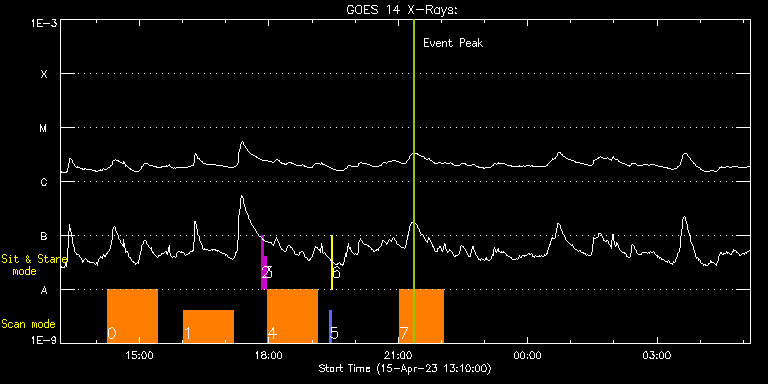 EIS Observation timeline overlay to GOES-Xray curve Code 1" 2" 40" 266" EIS Observations list for this event: STUDY ACRONYM ID DATE OBSERVED DESCRIPTION NOAA# TARGET 0 HOP81_new_study | 85849 | 2023/04/15 14:15:13 | Prominence and/or AR at the limb (as s | 3275 | Coronal Hole TIMELINE ID DATE OBSERVED FITS FILE XCEN (+W/-E) YCEN (+N/-S) DUR ----------------------------------------------------------------------------------------------------------------- 85849 | 2023/04/15 14:15:13.000 | eis_l0_20230415_141513.fits.gz | 104.04 | 411.64 | 1h9m45s 1 HOP81_new_study | 85850 | 2023/04/15 16:00:43 | Prominence and/or AR at the limb (as s | 3275 | Coronal Hole TIMELINE ID DATE OBSERVED FITS FILE XCEN (+W/-E) YCEN (+N/-S) DUR ----------------------------------------------------------------------------------------------------------------- 85850 | 2023/04/15 16:00:43.000 | eis_l0_20230415_160043.fits.gz | 117.17 | 411.33 | 1h9m45s 2 regcal071 | 85865 | 2023/04/15 17:49:12 | Dark exposures, CCD bottom rows (100s | | Engineering TIMELINE ID DATE OBSERVED FITS FILE XCEN (+W/-E) YCEN (+N/-S) DUR ----------------------------------------------------------------------------------------------------------------- 85865 | 2023/04/15 17:49:12.000 | eis_l0_20230415_174912.fits.gz | 165.72 | -245.06 | 3m21s 3 regcal072 | 85866 | 2023/04/15 17:53:00 | Dark exposures, top CCD rows (100s exp | | Engineering TIMELINE ID DATE OBSERVED FITS FILE XCEN (+W/-E) YCEN (+N/-S) DUR ----------------------------------------------------------------------------------------------------------------- 85866 | 2023/04/15 17:53:00.000 | eis_l0_20230415_175300.fits.gz | 166.11 | 776.94 | 3m22s 4 HOP81_new_study | 85851 | 2023/04/15 17:58:13 | Prominence and/or AR at the limb (as s | 3275 | Coronal Hole TIMELINE ID DATE OBSERVED FITS FILE XCEN (+W/-E) YCEN (+N/-S) DUR ----------------------------------------------------------------------------------------------------------------- 85851 | 2023/04/15 17:58:13.000 | eis_l0_20230415_175813.fits.gz | 131.77 | 410.86 | 1h9m45s 5 PRY_slot_contextLITE | 85859 | 2023/04/15 19:24:21 | Pointing Monitoring | 3276 | Active Region TIMELINE ID DATE OBSERVED FITS FILE XCEN (+W/-E) YCEN (+N/-S) DUR ----------------------------------------------------------------------------------------------------------------- 85859 | 2023/04/15 19:24:21.000 | eis_l0_20230415_192421.fits.gz | 0.68 | -195.00 | 2m56s 6 XRT_synop_AIA | 85860 | 2023/04/15 19:27:36 | Pointing Monitoring | 3276 | Quiet Sun TIMELINE ID DATE OBSERVED FITS FILE XCEN (+W/-E) YCEN (+N/-S) DUR ----------------------------------------------------------------------------------------------------------------- 85860 | 2023/04/15 19:27:36.000 | eis_l0_20230415_192736.fits.gz | 0.43 | -206.92 | 10s 7 Atlas_60 | 85872 | 2023/04/15 21:01:20 | Active region study - spectral atlas | | Quiet Sun TIMELINE ID DATE OBSERVED FITS FILE XCEN (+W/-E) YCEN (+N/-S) DUR ----------------------------------------------------------------------------------------------------------------- 85872 | 2023/04/15 21:01:20.000 | eis_l0_20230415_210120.fits.gz | -654.01 | 170.69 | 1h1m39s : Check study information : Download file : View thumbnails For this event, also check for: