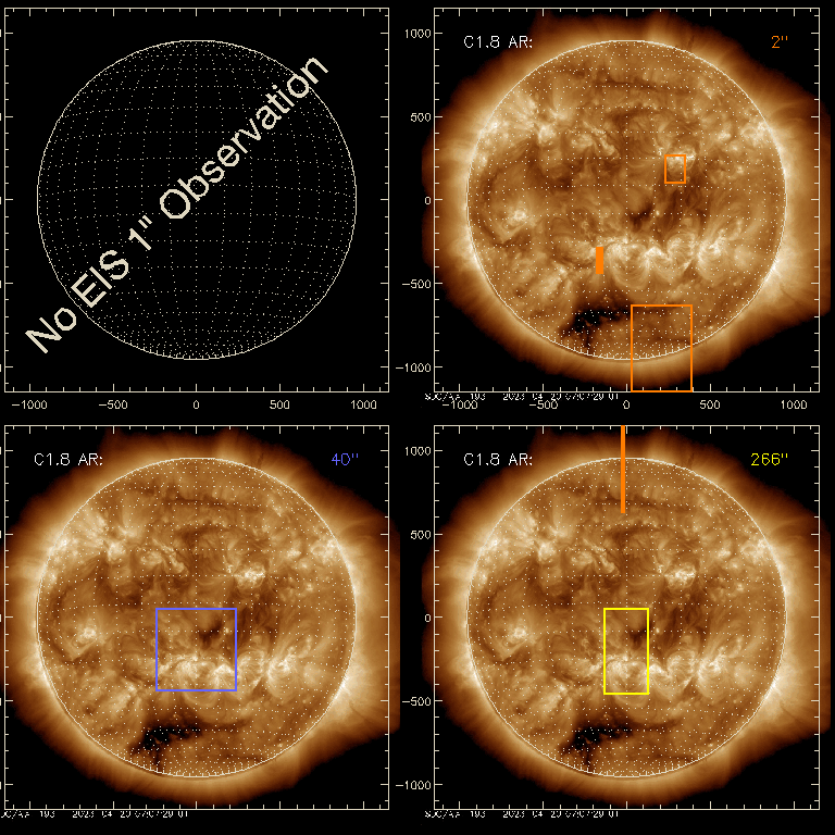 EIS Observation timeline overlay to GOES-Xray curve Code 1" 2" 40" 266" EIS Observations list for this event: STUDY ACRONYM ID DATE OBSERVED DESCRIPTION NOAA# TARGET 0 EL_FULL_CCD_RASTER | 85889 | 2023/04/19 23:18:49 | EIS observations in support of total e | | Active Region TIMELINE ID DATE OBSERVED FITS FILE XCEN (+W/-E) YCEN (+N/-S) DUR ----------------------------------------------------------------------------------------------------------------- 85889 | 2023/04/19 23:18:49.000 | eis_l0_20230419_231849.fits.gz | -20.27 | -1616.90 | 35m12s 1 EL_FULL_CCD_RASTER | 85890 | 2023/04/19 23:56:13 | EIS observations in support of total e | | Active Region TIMELINE ID DATE OBSERVED FITS FILE XCEN (+W/-E) YCEN (+N/-S) DUR ----------------------------------------------------------------------------------------------------------------- 85890 | 2023/04/19 23:56:13.000 | eis_l0_20230419_235613.fits.gz | -20.27 | -1616.74 | 35m11s 2 EL_FULL_CCD_RASTER | 85891 | 2023/04/20 00:47:40 | EIS observations in support of total e | | Active Region TIMELINE ID DATE OBSERVED FITS FILE XCEN (+W/-E) YCEN (+N/-S) DUR ----------------------------------------------------------------------------------------------------------------- 85891 | 2023/04/20 00:47:40.000 | eis_l0_20230420_004740.fits.gz | -20.19 | -1616.90 | 35m11s 3 EL_FULL_CCD_RASTER | 85892 | 2023/04/20 01:25:13 | EIS observations in support of total e | | Active Region TIMELINE ID DATE OBSERVED FITS FILE XCEN (+W/-E) YCEN (+N/-S) DUR ----------------------------------------------------------------------------------------------------------------- 85892 | 2023/04/20 01:25:13.000 | eis_l0_20230420_012513.fits.gz | -20.27 | -1616.90 | 35m11s 4 dhb_polar_scan | 85886 | 2023/04/20 02:32:13 | EIS observations in support of total e | | Quiet Sun TIMELINE ID DATE OBSERVED FITS FILE XCEN (+W/-E) YCEN (+N/-S) DUR ----------------------------------------------------------------------------------------------------------------- 85886 | 2023/04/20 02:32:13.000 | eis_l0_20230420_023213.fits.gz | 212.78 | -891.72 | 3h35m42s 5 PRY_slot_contextLITE | 85879 | 2023/04/20 07:23:20 | Pointing Monitoring | 3283 | Active Region TIMELINE ID DATE OBSERVED FITS FILE XCEN (+W/-E) YCEN (+N/-S) DUR ----------------------------------------------------------------------------------------------------------------- 85879 | 2023/04/20 07:23:20.000 | eis_l0_20230420_072320.fits.gz | 0.68 | -194.92 | 2m56s 6 XRT_synop_AIA | 85880 | 2023/04/20 07:26:34 | Pointing Monitoring | 3283 | Quiet Sun TIMELINE ID DATE OBSERVED FITS FILE XCEN (+W/-E) YCEN (+N/-S) DUR ----------------------------------------------------------------------------------------------------------------- 85880 | 2023/04/20 07:26:34.000 | eis_l0_20230420_072634.fits.gz | 0.43 | -207.00 | 10s 7 DRW_Alf_01 | 85884 | 2023/04/20 08:59:19 | Detection of the magnetic and velocity | | Active Region TIMELINE ID DATE OBSERVED FITS FILE XCEN (+W/-E) YCEN (+N/-S) DUR ----------------------------------------------------------------------------------------------------------------- 85884 | 2023/04/20 08:59:19.000 | eis_l0_20230420_085919.fits.gz | -171.52 | -365.73 | 1m9s 85884 | 2023/04/20 09:00:31.000 | eis_l0_20230420_090031.fits.gz | -171.37 | -365.73 | 1m8s 85884 | 2023/04/20 09:01:42.000 | eis_l0_20230420_090142.fits.gz | -171.21 | -365.65 | 1m8s 85884 | 2023/04/20 09:02:53.000 | eis_l0_20230420_090253.fits.gz | -170.98 | -365.73 | 1m8s 85884 | 2023/04/20 09:04:04.000 | eis_l0_20230420_090404.fits.gz | -170.82 | -365.73 | 1m9s 85884 | 2023/04/20 09:05:15.000 | eis_l0_20230420_090515.fits.gz | -170.67 | -365.73 | 1m9s 85884 | 2023/04/20 09:06:27.000 | eis_l0_20230420_090627.fits.gz | -170.52 | -365.73 | 1m8s 85884 | 2023/04/20 09:07:38.000 | eis_l0_20230420_090738.fits.gz | -170.36 | -365.73 | 1m8s 85884 | 2023/04/20 09:08:49.000 | eis_l0_20230420_090849.fits.gz | -170.21 | -365.73 | 1m8s 85884 | 2023/04/20 09:10:00.000 | eis_l0_20230420_091000.fits.gz | -170.05 | -365.73 | 22s 8 DRW_Alf_01 | 85893 | 2023/04/20 10:37:13 | Detection of the magnetic and velocity | | Active Region TIMELINE ID DATE OBSERVED FITS FILE XCEN (+W/-E) YCEN (+N/-S) DUR ----------------------------------------------------------------------------------------------------------------- 85893 | 2023/04/20 10:37:13.000 | eis_l0_20230420_103713.fits.gz | -157.92 | -365.58 | 1m8s 85893 | 2023/04/20 10:38:24.000 | eis_l0_20230420_103824.fits.gz | -157.77 | -365.65 | 1m9s 85893 | 2023/04/20 10:39:36.000 | eis_l0_20230420_103936.fits.gz | -157.62 | -365.58 | 1m8s 85893 | 2023/04/20 10:40:47.000 | eis_l0_20230420_104047.fits.gz | -157.38 | -365.65 | 1m8s 85893 | 2023/04/20 10:41:58.000 | eis_l0_20230420_104158.fits.gz | -157.23 | -365.65 | 1m8s 85893 | 2023/04/20 10:43:09.000 | eis_l0_20230420_104309.fits.gz | -157.07 | -365.65 | 1m9s 85893 | 2023/04/20 10:44:20.000 | eis_l0_20230420_104420.fits.gz | -156.92 | -365.65 | 1m9s 85893 | 2023/04/20 10:45:32.000 | eis_l0_20230420_104532.fits.gz | -156.77 | -365.73 | 1m8s 85893 | 2023/04/20 10:46:43.000 | eis_l0_20230420_104643.fits.gz | -156.61 | -365.65 | 1m9s 85893 | 2023/04/20 10:47:54.000 | eis_l0_20230420_104754.fits.gz | -156.53 | -365.65 | 1m9s 85893 | 2023/04/20 10:49:05.000 | eis_l0_20230420_104905.fits.gz | -156.30 | -365.73 | 1m9s 85893 | 2023/04/20 10:50:17.000 | eis_l0_20230420_105017.fits.gz | -156.07 | -365.65 | 1m8s 85893 | 2023/04/20 10:51:28.000 | eis_l0_20230420_105128.fits.gz | -155.99 | -365.65 | 1m8s 85893 | 2023/04/20 10:52:39.000 | eis_l0_20230420_105239.fits.gz | -155.84 | -365.58 | 1m9s 85893 | 2023/04/20 10:53:50.000 | eis_l0_20230420_105350.fits.gz | -155.61 | -365.65 | 1m9s 85893 | 2023/04/20 10:55:02.000 | eis_l0_20230420_105502.fits.gz | -155.53 | -365.65 | 1m8s 85893 | 2023/04/20 10:56:13.000 | eis_l0_20230420_105613.fits.gz | -155.30 | -365.73 | 1m9s 85893 | 2023/04/20 10:57:24.000 | eis_l0_20230420_105724.fits.gz | -155.07 | -365.73 | 1m9s 85893 | 2023/04/20 10:58:36.000 | eis_l0_20230420_105836.fi