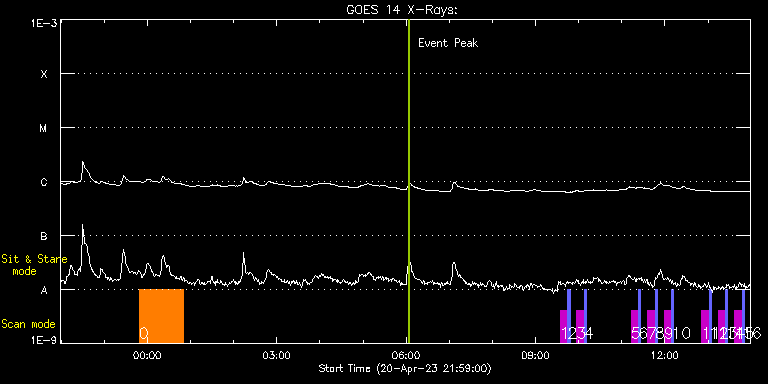 EIS Observation timeline overlay to GOES-Xray curve Code 1" 2" 40" 266" EIS Observations list for this event: STUDY ACRONYM ID DATE OBSERVED DESCRIPTION NOAA# TARGET 0 Atlas_60 | 85944 | 2023/04/20 23:48:13 | Active region study | | Quiet Sun TIMELINE ID DATE OBSERVED FITS FILE XCEN (+W/-E) YCEN (+N/-S) DUR ----------------------------------------------------------------------------------------------------------------- 85944 | 2023/04/20 23:48:13.000 | eis_l0_20230420_234813.fits.gz | 388.06 | 176.64 | 1h1m39s 1 SK_DEEP_5x512_SLIT1 | 85899 | 2023/04/21 09:34:26 | HOP 412 01/20 | | Quiet Sun TIMELINE ID DATE OBSERVED FITS FILE XCEN (+W/-E) YCEN (+N/-S) DUR ----------------------------------------------------------------------------------------------------------------- 85899 | 2023/04/21 09:34:26.000 | eis_l0_20230421_093426.fits.gz | 146.03 | -322.33 | 10m7s 2 PRY_slot_contextLITE | 85900 | 2023/04/21 09:44:59 | HOP 412 01/20 | | Active Region TIMELINE ID DATE OBSERVED FITS FILE XCEN (+W/-E) YCEN (+N/-S) DUR ----------------------------------------------------------------------------------------------------------------- 85900 | 2023/04/21 09:44:59.000 | eis_l0_20230421_094459.fits.gz | -9889.43 | -10175.70 | 2m56s 3 SK_DEEP_5x512_SLIT1 | 85901 | 2023/04/21 09:57:19 | HOP 412 02/20 | | Quiet Sun TIMELINE ID DATE OBSERVED FITS FILE XCEN (+W/-E) YCEN (+N/-S) DUR ----------------------------------------------------------------------------------------------------------------- 85901 | 2023/04/21 09:57:19.000 | eis_l0_20230421_095719.fits.gz | -41.14 | -1109.72 | 10m8s 4 PRY_slot_contextLITE | 85902 | 2023/04/21 10:07:52 | HOP 412 02/20 | | Active Region TIMELINE ID DATE OBSERVED FITS FILE XCEN (+W/-E) YCEN (+N/-S) DUR ----------------------------------------------------------------------------------------------------------------- 85902 | 2023/04/21 10:07:52.000 | eis_l0_20230421_100752.fits.gz | -40.89 | -1097.10 | 2m56s 5 SK_DEEP_5x512_SLIT1 | 85903 | 2023/04/21 11:12:49 | HOP 412 03/20 | | Quiet Sun TIMELINE ID DATE OBSERVED FITS FILE XCEN (+W/-E) YCEN (+N/-S) DUR ----------------------------------------------------------------------------------------------------------------- 85903 | 2023/04/21 11:12:49.000 | eis_l0_20230421_111249.fits.gz | -41.14 | -1008.60 | 10m7s 6 PRY_slot_contextLITE | 85904 | 2023/04/21 11:23:22 | HOP 412 03/20 | | Active Region TIMELINE ID DATE OBSERVED FITS FILE XCEN (+W/-E) YCEN (+N/-S) DUR ----------------------------------------------------------------------------------------------------------------- 85904 | 2023/04/21 11:23:22.000 | eis_l0_20230421_112322.fits.gz | -40.89 | -997.06 | 2m56s 7 SK_DEEP_5x512_SLIT1 | 85905 | 2023/04/21 11:35:49 | HOP 412 04/20 | | Quiet Sun TIMELINE ID DATE OBSERVED FITS FILE XCEN (+W/-E) YCEN (+N/-S) DUR ----------------------------------------------------------------------------------------------------------------- 85905 | 2023/04/21 11:35:49.000 | eis_l0_20230421_113549.fits.gz | -41.06 | -909.34 | 10m7s 8 PRY_slot_contextLITE | 85906 | 2023/04/21 11:46:22 | HOP 412 04/20 | | Active Region TIMELINE ID DATE OBSERVED FITS FILE XCEN (+W/-E) YCEN (+N/-S) DUR ----------------------------------------------------------------------------------------------------------------- 85906 | 2023/04/21 11:46:22.000 | eis_l0_20230421_114622.fits.gz | -40.89 | -896.87 | 2m56s 9 SK_DEEP_5x512_SLIT1 | 85907 | 2023/04/21 11:58:49 | HOP 412 05/20 | | Quiet Sun TIMELINE ID DATE OBSERVED FITS FILE XCEN (+W/-E) YCEN (+N/-S) DUR ----------------------------------------------------------------------------------------------------------------- 85907 | 2023/04/21 11:58:49.000 | eis_l0_20230421_115849.fits.gz | -41.06 | -808.45 | 10m8s 10 PRY_slot_contextLITE | 85908 | 2023/04/21 12:09:22 | HOP 412 05/20 | | Active Region TIMELINE ID DATE OBSERVED FITS FILE XCEN (+W/-E) YCEN (+N/-S) DUR ----------------------------------------------------------------------------------------------------------------- 85908 | 2023/04/21 12:09:22.000 | eis_l0_20230421_120922.fits.gz | -40.81 | -796.91 | 2m57s 11 SK_DEEP_5x512_SLIT1 | 85909 | 2023/04/21 12:50:49 | HOP 412 06/20 | | Quiet Sun TIMELINE ID DATE OBSERVED FITS FILE XCEN (+W/-E) YCEN (+N/-S) DUR ----------------------------------------------------------------------------------------------------------------- 85909 | 2023/04/21 12:50:49.000 | eis_l0_20230421_125049.fits.gz | -41.14 | -709.11 | 10m7s 12 PRY_slot_contextLITE | 85910 | 2023/04/21 13:01:22 | HOP 412 06/20 | | Active Region TIMELINE ID DATE OBSERVED FITS FILE XCEN (+W/-E) YCEN (+N/-S) DUR ----------------------------------------------------------------------------------------------------------------- 85910 | 2023/04/21 13:01:22.000 | eis_l0_20230421_130122.fits.gz | -40.97 | -696.72 | 2m56s 13 SK_DEEP_5x512_SLIT1 | 85911 | 2023/04/21 13:13:49 | HOP 412 07/20 | | Quiet Sun TIMELINE ID DATE OBSERVED FITS FILE XCEN (+W/-E) YCEN (+N/-S) DUR ----------------------------------------------------------------------------------------------------------------- 85911 | 2023/04/21 13:13:49.000 | eis_l0_20230421_131349.fits.gz | -41.06 | -609.62 | 10m7s 14 PRY_slot_contextLITE | 85912 | 2023/04/21 13:24:22 | HOP 412 07/20 | | Active Region TIMELINE ID DATE OBSERVED FITS FILE XCEN (+W/-E) YCEN (+N/-S) DUR ----------------------------------------------------------------------------------------------------------------- 85912 | 2023/04/21 13:24:22.000 | eis_l0_20230421_132422.fits.gz | -40.89 | -597.08 | 2m56s 15 SK_DEEP_5x512_SLIT1 | 85913 | 2023/04/21 13:36:49 | HOP 412 08/20 | | Quiet Sun TIMELINE ID DATE OBSERVED FITS FILE XCEN (+W/-E) YCEN (+N/-S) DUR ----------------------------------------------------------------------------------------------------------------- 85913 | 2023/04/21 13:36:49.000 | eis_l0_20230421_133649.fits.gz | -41.06 | -509.19 | 10m8s 16 PRY_slot_contextLITE | 85914 | 2023/04/21 13:47:22 | HOP 412 08/20 | | Active Region TIMELINE ID DATE OBSERVED FITS FILE XC