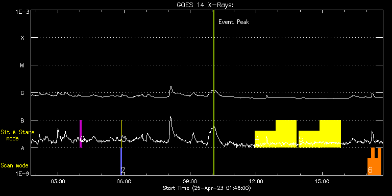 EIS Observation timeline overlay to GOES-Xray curve Code 1" 2" 40" 266" EIS Observations list for this event: STUDY ACRONYM ID DATE OBSERVED DESCRIPTION NOAA# TARGET 0 regcal074 | 85981 | 2023/04/25 04:00:09 | Dark exposures including overscan pixe | | Engineering TIMELINE ID DATE OBSERVED FITS FILE XCEN (+W/-E) YCEN (+N/-S) DUR ----------------------------------------------------------------------------------------------------------------- 85981 | 2023/04/25 04:00:09.000 | eis_l0_20230425_040009.fits.gz | 743.07 | -124.85 | 3m22s 1 regcal076 | 85982 | 2023/04/25 04:03:58 | Flatfield, 1 exposure, led 100ms, ccd | | Engineering TIMELINE ID DATE OBSERVED FITS FILE XCEN (+W/-E) YCEN (+N/-S) DUR ----------------------------------------------------------------------------------------------------------------- 85982 | 2023/04/25 04:03:58.000 | eis_l0_20230425_040358.fits.gz | 743.38 | -636.92 | 1s 2 PRY_slot_contextLITE | 85979 | 2023/04/25 05:50:18 | Pointing Monitoring | | Active Region TIMELINE ID DATE OBSERVED FITS FILE XCEN (+W/-E) YCEN (+N/-S) DUR ----------------------------------------------------------------------------------------------------------------- 85979 | 2023/04/25 05:50:18.000 | eis_l0_20230425_055018.fits.gz | 0.68 | -195.00 | 2m56s 3 XRT_synop_AIA | 85980 | 2023/04/25 05:53:32 | Pointing Monitoring | | Quiet Sun TIMELINE ID DATE OBSERVED FITS FILE XCEN (+W/-E) YCEN (+N/-S) DUR ----------------------------------------------------------------------------------------------------------------- 85980 | 2023/04/25 05:53:32.000 | eis_l0_20230425_055332.fits.gz | 0.43 | -207.00 | 11s 4 Flare266_Hunter01 | 86005 | 2023/04/25 11:56:10 | Flare_Hunter01 | | Flare TIMELINE ID DATE OBSERVED FITS FILE XCEN (+W/-E) YCEN (+N/-S) DUR ----------------------------------------------------------------------------------------------------------------- 86005 | 2023/04/25 11:56:10.000 | eis_l0_20230425_115610.fits.gz | 762.35 | -379.79 | 56m22s 86005 | 2023/04/25 12:53:25.000 | eis_l0_20230425_125325.fits.gz | 766.29 | -380.56 | 56m22s 5 Flare266_Hunter01 | 86006 | 2023/04/25 13:56:13 | Flare_Hunter | | Flare TIMELINE ID DATE OBSERVED FITS FILE XCEN (+W/-E) YCEN (+N/-S) DUR ----------------------------------------------------------------------------------------------------------------- 86006 | 2023/04/25 13:56:13.000 | eis_l0_20230425_135613.fits.gz | 770.39 | -381.18 | 56m22s 86006 | 2023/04/25 14:53:28.000 | eis_l0_20230425_145328.fits.gz | 774.09 | -381.72 | 56m22s 6 FlareResponse01 | 86009 | 2023/04/25 17:04:49 | Flare Watch | | Flare TIMELINE ID DATE OBSERVED FITS FILE XCEN (+W/-E) YCEN (+N/-S) DUR ----------------------------------------------------------------------------------------------------------------- 86009 | 2023/04/25 17:04:49.000 | eis_l0_20230425_170449.fits.gz | 782.70 | -383.19 | 8m52s 86009 | 2023/04/25 17:13:44.000 | eis_l0_20230425_171344.fits.gz | 783.24 | -383.27 | 8m52s 86009 | 2023/04/25 17:22:39.000 | eis_l0_20230425_172239.fits.gz | 783.86 | -383.42 | 8m52s 86009 | 2023/04/25 17:31:34.000 | eis_l0_20230425_173134.fits.gz | 784.40 | -383.50 | 8m52s : Check study information : Download file : View thumbnails For this event, also check for: