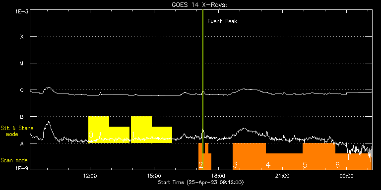 EIS Observation timeline overlay to GOES-Xray curve Code 1" 2" 40" 266" EIS Observations list for this event: STUDY ACRONYM ID DATE OBSERVED DESCRIPTION NOAA# TARGET 0 Flare266_Hunter01 | 86005 | 2023/04/25 11:56:10 | Flare_Hunter01 | | Flare TIMELINE ID DATE OBSERVED FITS FILE XCEN (+W/-E) YCEN (+N/-S) DUR ----------------------------------------------------------------------------------------------------------------- 86005 | 2023/04/25 11:56:10.000 | eis_l0_20230425_115610.fits.gz | 762.35 | -379.79 | 56m22s 86005 | 2023/04/25 12:53:25.000 | eis_l0_20230425_125325.fits.gz | 766.29 | -380.56 | 56m22s 1 Flare266_Hunter01 | 86006 | 2023/04/25 13:56:13 | Flare_Hunter | | Flare TIMELINE ID DATE OBSERVED FITS FILE XCEN (+W/-E) YCEN (+N/-S) DUR ----------------------------------------------------------------------------------------------------------------- 86006 | 2023/04/25 13:56:13.000 | eis_l0_20230425_135613.fits.gz | 770.39 | -381.18 | 56m22s 86006 | 2023/04/25 14:53:28.000 | eis_l0_20230425_145328.fits.gz | 774.09 | -381.72 | 56m22s 2 FlareResponse01 | 86009 | 2023/04/25 17:04:49 | Flare Watch | | Flare TIMELINE ID DATE OBSERVED FITS FILE XCEN (+W/-E) YCEN (+N/-S) DUR ----------------------------------------------------------------------------------------------------------------- 86009 | 2023/04/25 17:04:49.000 | eis_l0_20230425_170449.fits.gz | 782.70 | -383.19 | 8m52s 86009 | 2023/04/25 17:13:44.000 | eis_l0_20230425_171344.fits.gz | 783.24 | -383.27 | 8m52s 86009 | 2023/04/25 17:22:39.000 | eis_l0_20230425_172239.fits.gz | 783.86 | -383.42 | 8m52s 86009 | 2023/04/25 17:31:34.000 | eis_l0_20230425_173134.fits.gz | 784.40 | -383.50 | 8m52s 3 Large_CH_Map_v2 | 85985 | 2023/04/25 18:41:13 | Test new studies with longer exposure | | Quiet Sun TIMELINE ID DATE OBSERVED FITS FILE XCEN (+W/-E) YCEN (+N/-S) DUR ----------------------------------------------------------------------------------------------------------------- 85985 | 2023/04/25 18:41:13.000 | eis_l0_20230425_184113.fits.gz | 223.89 | -182.60 | 1h31m53s 4 HOP81_new_study_v2 | 85986 | 2023/04/25 20:13:11 | Test new studies with longer exposure | | Coronal Hole TIMELINE ID DATE OBSERVED FITS FILE XCEN (+W/-E) YCEN (+N/-S) DUR ----------------------------------------------------------------------------------------------------------------- 85986 | 2023/04/25 20:13:11.000 | eis_l0_20230425_201311.fits.gz | 237.64 | -118.99 | 1h43m30s 5 dhb_atlas_180m_30" | 85987 | 2023/04/25 21:56:46 | Test new studies with longer exposure | | Quiet Sun TIMELINE ID DATE OBSERVED FITS FILE XCEN (+W/-E) YCEN (+N/-S) DUR ----------------------------------------------------------------------------------------------------------------- 85987 | 2023/04/25 21:56:46.000 | eis_l0_20230425_215646.fits.gz | 252.68 | -7.53 | 1h30m49s 6 CH_funnels_FIPv3 | 85988 | 2023/04/25 23:27:44 | Test new studies with longer exposure | | Coronal Hole TIMELINE ID DATE OBSERVED FITS FILE XCEN (+W/-E) YCEN (+N/-S) DUR ----------------------------------------------------------------------------------------------------------------- 85988 | 2023/04/25 23:27:44.000 | eis_l0_20230425_232744.fits.gz | 266.05 | -183.84 | 1h41m4s : Check study information : Download file : View thumbnails For this event, also check for: