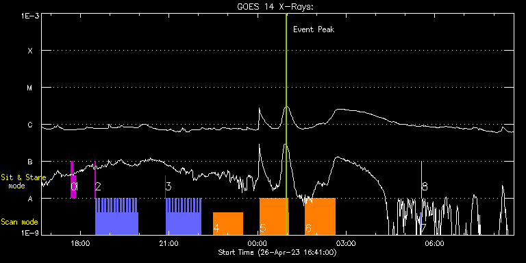 EIS Observation timeline overlay to GOES-Xray curve Code 1" 2" 40" 266" EIS Observations list for this event: STUDY ACRONYM ID DATE OBSERVED DESCRIPTION NOAA# TARGET 0 regcal081 | 85994 | 2023/04/26 17:40:11 | Dark exposures, CCD bottom rows (150s | | Engineering TIMELINE ID DATE OBSERVED FITS FILE XCEN (+W/-E) YCEN (+N/-S) DUR ----------------------------------------------------------------------------------------------------------------- 85994 | 2023/04/26 17:40:11.000 | eis_l0_20230426_174011.fits.gz | -124.88 | -1065.20 | 5m1s 1 regcal082 | 85995 | 2023/04/26 17:45:39 | Dark exposures, top CCD rows (150s exp | | Engineering TIMELINE ID DATE OBSERVED FITS FILE XCEN (+W/-E) YCEN (+N/-S) DUR ----------------------------------------------------------------------------------------------------------------- 85995 | 2023/04/26 17:45:39.000 | eis_l0_20230426_174539.fits.gz | -124.03 | -43.27 | 5m2s 2 Alignment_modify_v2 | 85983 | 2023/04/26 18:29:26 | Co-alignment N. Pole | | Quiet Sun TIMELINE ID DATE OBSERVED FITS FILE XCEN (+W/-E) YCEN (+N/-S) DUR ----------------------------------------------------------------------------------------------------------------- 85983 | 2023/04/26 18:29:26.000 | eis_l0_20230426_182926.fits.gz | 0.51 | 752.83 | 1m1s 85983 | 2023/04/26 18:30:52.000 | eis_l0_20230426_183052.fits.gz | 0.51 | 752.91 | 2m34s 85983 | 2023/04/26 18:33:59.000 | eis_l0_20230426_183359.fits.gz | 0.43 | 752.91 | 2m34s 85983 | 2023/04/26 18:37:07.000 | eis_l0_20230426_183707.fits.gz | 0.43 | 752.83 | 2m34s 85983 | 2023/04/26 18:40:14.000 | eis_l0_20230426_184014.fits.gz | 0.43 | 752.91 | 2m34s 85983 | 2023/04/26 18:43:22.000 | eis_l0_20230426_184322.fits.gz | 0.51 | 752.91 | 2m34s 85983 | 2023/04/26 18:46:29.000 | eis_l0_20230426_184629.fits.gz | 0.43 | 752.98 | 2m34s 85983 | 2023/04/26 18:49:37.000 | eis_l0_20230426_184937.fits.gz | 0.43 | 752.98 | 2m34s 85983 | 2023/04/26 18:52:45.000 | eis_l0_20230426_185245.fits.gz | 0.51 | 752.91 | 2m34s 85983 | 2023/04/26 18:55:52.000 | eis_l0_20230426_185552.fits.gz | 0.51 | 752.91 | 2m34s 85983 | 2023/04/26 18:59:00.000 | eis_l0_20230426_185900.fits.gz | 0.43 | 752.83 | 2m34s 85983 | 2023/04/26 19:02:07.000 | eis_l0_20230426_190207.fits.gz | 0.43 | 752.83 | 2m34s 85983 | 2023/04/26 19:05:15.000 | eis_l0_20230426_190515.fits.gz | 0.51 | 752.98 | 2m34s 85983 | 2023/04/26 19:08:22.000 | eis_l0_20230426_190822.fits.gz | 0.51 | 752.91 | 2m34s 85983 | 2023/04/26 19:11:30.000 | eis_l0_20230426_191130.fits.gz | 0.51 | 752.83 | 2m34s 85983 | 2023/04/26 19:14:38.000 | eis_l0_20230426_191438.fits.gz | 0.43 | 752.83 | 2m34s 85983 | 2023/04/26 19:17:45.000 | eis_l0_20230426_191745.fits.gz | 0.43 | 752.91 | 2m34s 85983 | 2023/04/26 19:20:53.000 | eis_l0_20230426_192053.fits.gz | 0.43 | 752.91 | 2m34s 85983 | 2023/04/26 19:24:00.000 | eis_l0_20230426_192400.fits.gz | 0.51 | 752.91 | 2m34s 85983 | 2023/04/26 19:27:08.000 | eis_l0_20230426_192708.fits.gz | 0.43 | 752.91 | 2m34s 85983 | 2023/04/26 19:30:15.000 | eis_l0_20230426_193015.fits.gz | 0.51 | 752.83 | 2m34s 85983 | 2023/04/26 19:33:23.000 | eis_l0_20230426_193323.fits.gz | 0.43 | 752.91 | 2m34s 85983 | 2023/04/26 19:36:30.000 | eis_l0_20230426_193630.fits.gz | 0.43 | 752.91 | 2m34s 85983 | 2023/04/26 19:39:38.000 | eis_l0_20230426_193938.fits.gz | 0.51 | 752.91 | 2m34s 85983 | 2023/04/26 19:42:45.000 | eis_l0_20230426_194245.fits.gz | 0.43 | 752.91 | 2m34s 85983 | 2023/04/26 19:45:53.000 | eis_l0_20230426_194553.fits.gz | 0.51 | 752.83 | 2m34s 85983 | 2023/04/26 19:49:00.000 | eis_l0_20230426_194900.fits.gz | 0.43 | 752.91 | 2m34s 85983 | 2023/04/26 19:52:08.000 | eis_l0_20230426_195208.fits.gz | 0.51 | 752.91 | 2m34s 85983 | 2023/04/26 19:55:15.000 | eis_l0_20230426_195515.fits.gz | 0.51 | 752.83 | 2m34s 3 Alignment_modify_v2 | 85984 | 2023/04/26 20:52:18 | Co-alignment E. limb | | Quiet Sun TIMELINE ID DATE OBSERVED FITS FILE XCEN (+W/-E) YCEN (+N/-S) DUR ----------------------------------------------------------------------------------------------------------------- 85984 | 2023/04/26 20:52:18.000 | eis_l0_20230426_205218.fits.gz | -9829.03 | -10169.70 | 1m1s 85984 | 2023/04/26 20:53:44.000 | eis_l0_20230426_205344.fits.gz | -9858.98 | -10169.70 | 2m34s 85984 | 2023/04/26 20:56:51.000 | eis_l0_20230426_205651.fits.gz | -9858.98 | -10169.70 | 2m34s 85984 | 2023/04/26 20:59:59.000 | eis_l0_20230426_205959.fits.gz | -9858.98 | -10169.70 | 2m34s 85984 | 2023/04/26 21:03:07.000 | eis_l0_20230426_210307.fits.gz | -9858.98 | -10169.70 | 2m34s 85984 | 2023/04/26 21:06:14.000 | eis_l0_20230426_210614.fits.gz | -9858.98 | -10169.70 | 2m34s 85984 | 2023/04/26 21:09:21.000 | eis_l0_20230426_210921.fits.gz | -9858.98 | -10169.70 | 2m34s 85984 | 2023/04/26 21:12:29.000 | eis_l0_20230426_211229.fits.gz | -9858.98 | -10169.70 | 2m34s 85984 | 2023/04/26 21:15:37.000 | eis_l0_20230426_211537.fits.gz | -9858.98 | -10169.70 | 2m33s 85984 | 2023/04/26 21:18:44.000 | eis_l0_20230426_211844.fits.gz | -9858.98 | -10169.70 | 2m34s 85984 | 2023/04/26 21:21:52.000 | eis_l0_20230426_212152.fits.gz | -9858.98 | -10169.70 | 2m34s 85984 | 2023/04/26 21:24:59.000 | eis_l0_20230426_212459.fits.gz | -9858.98 | -10169.70 | 2m34s 85984 | 2023/04/26 21:28:07.000 | eis_l0_20230426_212807.fits.gz | -9858.98 | -10169.70 | 2m34s 85984 | 2023/04/26 21:31:14.000 | eis_l0_20230426_213114.fits.gz | -9858.98 | -10169.70 | 2m34s 85984 | 2023/04/26 21:34:22.000 | eis_l0_20230426_213422.fits.gz | -9858.98 | -10169.70 | 2m34s 85984 | 2023/04/26 21:37:29.000 | eis_l0_20230426_213729.fits.gz | -9858.98 | -10169.70 | 2m34s 85984 | 2023/04/26 21:40:37.000 | eis_l0_20230426_214037.fits.gz | -9858.98 | -10169.70 | 2m33s 85984 | 2023/04/26 21:43:44.000 | eis_l0_20230426_214344.fits.gz | -9858.98 | -10169.70 | 2m34s 85984 | 2023/04/26 21:46:52.000 | eis_l0_20230426_214652.fits.gz | -9858.98 | -10169.70 | 2m34s 85984 | 2023/04/26 21:49:59.000 | eis_l0_20230426_214959.fits.gz | -9858.98 | -10169.70 | 2m34s 85984 | 2023/04/26 21:53:07.000 | eis_l0_20230426_215307