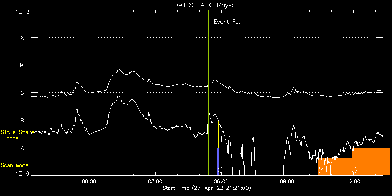 EIS Observation timeline overlay to GOES-Xray curve Code 1" 2" 40" 266" EIS Observations list for this event: STUDY ACRONYM ID DATE OBSERVED DESCRIPTION NOAA# TARGET 0 PRY_slot_contextLITE | 86016 | 2023/04/28 05:50:19 | Pointing Monitoring | 3286 | Active Region TIMELINE ID DATE OBSERVED FITS FILE XCEN (+W/-E) YCEN (+N/-S) DUR ----------------------------------------------------------------------------------------------------------------- 86016 | 2023/04/28 05:50:19.000 | eis_l0_20230428_055019.fits.gz | 0.76 | -195.00 | 2m56s 1 XRT_synop_AIA | 86017 | 2023/04/28 05:53:34 | Pointing Monitoring | | Quiet Sun TIMELINE ID DATE OBSERVED FITS FILE XCEN (+W/-E) YCEN (+N/-S) DUR ----------------------------------------------------------------------------------------------------------------- 86017 | 2023/04/28 05:53:34.000 | eis_l0_20230428_055334.fits.gz | 0.51 | -207.08 | 10s 2 Large_CH_Map_v2 | 86028 | 2023/04/28 10:24:19 | Test new studies with longer exposure | | Quiet Sun TIMELINE ID DATE OBSERVED FITS FILE XCEN (+W/-E) YCEN (+N/-S) DUR ----------------------------------------------------------------------------------------------------------------- 86028 | 2023/04/28 10:24:19.000 | eis_l0_20230428_102419.fits.gz | -41.91 | 573.57 | 1h31m53s 3 HOP81_new_study_v2 | 86029 | 2023/04/28 11:56:44 | Test new studies with longer exposure | | Coronal Hole TIMELINE ID DATE OBSERVED FITS FILE XCEN (+W/-E) YCEN (+N/-S) DUR ----------------------------------------------------------------------------------------------------------------- 86029 | 2023/04/28 11:56:44.000 | eis_l0_20230428_115644.fits.gz | -33.40 | 637.42 | 1h43m29s : Check study information : Download file : View thumbnails For this event, also check for: