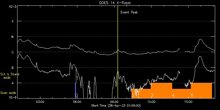 EIS Observation timeline overlay to GOES-Xray curve Code 1" 2" 40" 266" EIS Observations list for this event: STUDY ACRONYM ID DATE OBSERVED DESCRIPTION NOAA# TARGET 0 PRY_slot_contextLITE | 86016 | 2023/04/28 05:50:19 | Pointing Monitoring | 3286 | Active Region TIMELINE ID DATE OBSERVED FITS FILE XCEN (+W/-E) YCEN (+N/-S) DUR ----------------------------------------------------------------------------------------------------------------- 86016 | 2023/04/28 05:50:19.000 | eis_l0_20230428_055019.fits.gz | 0.76 | -195.00 | 2m56s 1 XRT_synop_AIA | 86017 | 2023/04/28 05:53:34 | Pointing Monitoring | | Quiet Sun TIMELINE ID DATE OBSERVED FITS FILE XCEN (+W/-E) YCEN (+N/-S) DUR ----------------------------------------------------------------------------------------------------------------- 86017 | 2023/04/28 05:53:34.000 | eis_l0_20230428_055334.fits.gz | 0.51 | -207.08 | 10s 2 Large_CH_Map_v2 | 86028 | 2023/04/28 10:24:19 | Test new studies with longer exposure | | Quiet Sun TIMELINE ID DATE OBSERVED FITS FILE XCEN (+W/-E) YCEN (+N/-S) DUR ----------------------------------------------------------------------------------------------------------------- 86028 | 2023/04/28 10:24:19.000 | eis_l0_20230428_102419.fits.gz | -41.91 | 573.57 | 1h31m53s 3 HOP81_new_study_v2 | 86029 | 2023/04/28 11:56:44 | Test new studies with longer exposure | | Coronal Hole TIMELINE ID DATE OBSERVED FITS FILE XCEN (+W/-E) YCEN (+N/-S) DUR ----------------------------------------------------------------------------------------------------------------- 86029 | 2023/04/28 11:56:44.000 | eis_l0_20230428_115644.fits.gz | -33.40 | 637.42 | 1h43m29s 4 dhb_atlas_180m_30" | 86030 | 2023/04/28 13:40:45 | Test new studies with longer exposure | | Quiet Sun TIMELINE ID DATE OBSERVED FITS FILE XCEN (+W/-E) YCEN (+N/-S) DUR ----------------------------------------------------------------------------------------------------------------- 86030 | 2023/04/28 13:40:45.000 | eis_l0_20230428_134045.fits.gz | -24.30 | 749.42 | 1h30m49s 5 CH_funnels_FIPv3 | 86031 | 2023/04/28 15:12:05 | Test new studies with longer exposure | | Coronal Hole TIMELINE ID DATE OBSERVED FITS FILE XCEN (+W/-E) YCEN (+N/-S) DUR ----------------------------------------------------------------------------------------------------------------- 86031 | 2023/04/28 15:12:05.000 | eis_l0_20230428_151205.fits.gz | -16.19 | 573.27 | 1h41m4s : Check study information : Download file : View thumbnails For this event, also check for: