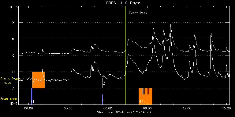 EIS Observation timeline overlay to GOES-Xray curve Code 1" 2" 40" 266" EIS Observations list for this event: STUDY ACRONYM ID DATE OBSERVED DESCRIPTION NOAA# TARGET 0 PRY_slot_context_v4 | 86113 | 2023/05/03 00:11:20 | Evolution of abundances in AR core loo | 3293 | Active Region TIMELINE ID DATE OBSERVED FITS FILE XCEN (+W/-E) YCEN (+N/-S) DUR ----------------------------------------------------------------------------------------------------------------- 86113 | 2023/05/03 00:11:20.000 | eis_l0_20230503_001120.fits.gz | -737.07 | 78.60 | 4m12s 1 HPW021VEL001x512v2 | 86114 | 2023/05/03 00:15:57 | Evolution of abundances in AR core loo | | Active Region TIMELINE ID DATE OBSERVED FITS FILE XCEN (+W/-E) YCEN (+N/-S) DUR ----------------------------------------------------------------------------------------------------------------- 86114 | 2023/05/03 00:15:57.000 | eis_l0_20230503_001557.fits.gz | -734.93 | 66.60 | 55m51s 2 PRY_slot_contextLITE | 86099 | 2023/05/03 05:33:20 | Pointing Monitoring | | Active Region TIMELINE ID DATE OBSERVED FITS FILE XCEN (+W/-E) YCEN (+N/-S) DUR ----------------------------------------------------------------------------------------------------------------- 86099 | 2023/05/03 05:33:20.000 | eis_l0_20230503_053320.fits.gz | 0.76 | -195.08 | 2m56s 3 XRT_synop_AIA | 86100 | 2023/05/03 05:36:35 | Pointing Monitoring | | Quiet Sun TIMELINE ID DATE OBSERVED FITS FILE XCEN (+W/-E) YCEN (+N/-S) DUR ----------------------------------------------------------------------------------------------------------------- 86100 | 2023/05/03 05:36:35.000 | eis_l0_20230503_053635.fits.gz | 0.43 | -206.92 | 10s 4 HH_AR+FLR_RAS_N03 | 86093 | 2023/05/03 08:21:20 | HOP 401 - dynamics of flux cancellatio | 3296 | Active Region TIMELINE ID DATE OBSERVED FITS FILE XCEN (+W/-E) YCEN (+N/-S) DUR ----------------------------------------------------------------------------------------------------------------- 86093 | 2023/05/03 08:21:20.000 | eis_l0_20230503_082120.fits.gz | -688.39 | 206.23 | 13m19s 5 HH_Flare_60x152f | 86094 | 2023/05/03 08:35:10 | HOP 401 - dynamics of flux cancellatio | 3296 | Flare TIMELINE ID DATE OBSERVED FITS FILE XCEN (+W/-E) YCEN (+N/-S) DUR ----------------------------------------------------------------------------------------------------------------- 86094 | 2023/05/03 08:35:10.000 | eis_l0_20230503_083510.fits.gz | -690.17 | 250.15 | 2m48s 86094 | 2023/05/03 08:38:01.000 | eis_l0_20230503_083801.fits.gz | -689.86 | 250.23 | 2m47s 86094 | 2023/05/03 08:40:51.000 | eis_l0_20230503_084051.fits.gz | -689.63 | 250.23 | 2m47s 86094 | 2023/05/03 08:43:41.000 | eis_l0_20230503_084341.fits.gz | -689.40 | 250.23 | 2m48s 86094 | 2023/05/03 08:46:32.000 | eis_l0_20230503_084632.fits.gz | -689.01 | 250.23 | 2m47s 86094 | 2023/05/03 08:49:22.000 | eis_l0_20230503_084922.fits.gz | -688.78 | 250.23 | 2m48s 86094 | 2023/05/03 08:52:13.000 | eis_l0_20230503_085213.fits.gz | -688.47 | 250.31 | 2m47s 86094 | 2023/05/03 08:55:03.000 | eis_l0_20230503_085503.fits.gz | -688.16 | 250.31 | 2m47s 86094 | 2023/05/03 08:57:53.000 | eis_l0_20230503_085753.fits.gz | -687.93 | 250.46 | 2m48s 86094 | 2023/05/03 09:00:44.000 | eis_l0_20230503_090044.fits.gz | -687.54 | 250.38 | 2m47s 86094 | 2023/05/03 09:03:34.000 | eis_l0_20230503_090334.fits.gz | -687.23 | 250.38 | 2m47s 86094 | 2023/05/03 09:06:24.000 | eis_l0_20230503_090624.fits.gz | -687.00 | 250.38 | 2m48s 86094 | 2023/05/03 09:09:15.000 | eis_l0_20230503_090915.fits.gz | -686.69 | 250.46 | 2m47s 86094 | 2023/05/03 09:12:05.000 | eis_l0_20230503_091205.fits.gz | -686.39 | 250.31 | 2m47s 86094 | 2023/05/03 09:14:55.000 | eis_l0_20230503_091455.fits.gz | -686.08 | 250.31 | 2m48s 86094 | 2023/05/03 09:17:45.000 | eis_l0_20230503_091745.fits.gz | -685.77 | 250.46 | 2m48s : Check study information : Download file : View thumbnails For this event, also check for: