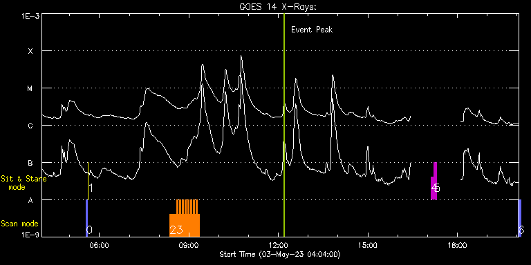 EIS Observation timeline overlay to GOES-Xray curve Code 1" 2" 40" 266" EIS Observations list for this event: STUDY ACRONYM ID DATE OBSERVED DESCRIPTION NOAA# TARGET 0 PRY_slot_contextLITE | 86099 | 2023/05/03 05:33:20 | Pointing Monitoring | | Active Region TIMELINE ID DATE OBSERVED FITS FILE XCEN (+W/-E) YCEN (+N/-S) DUR ----------------------------------------------------------------------------------------------------------------- 86099 | 2023/05/03 05:33:20.000 | eis_l0_20230503_053320.fits.gz | 0.76 | -195.08 | 2m56s 1 XRT_synop_AIA | 86100 | 2023/05/03 05:36:35 | Pointing Monitoring | | Quiet Sun TIMELINE ID DATE OBSERVED FITS FILE XCEN (+W/-E) YCEN (+N/-S) DUR ----------------------------------------------------------------------------------------------------------------- 86100 | 2023/05/03 05:36:35.000 | eis_l0_20230503_053635.fits.gz | 0.43 | -206.92 | 10s 2 HH_AR+FLR_RAS_N03 | 86093 | 2023/05/03 08:21:20 | HOP 401 - dynamics of flux cancellatio | 3296 | Active Region TIMELINE ID DATE OBSERVED FITS FILE XCEN (+W/-E) YCEN (+N/-S) DUR ----------------------------------------------------------------------------------------------------------------- 86093 | 2023/05/03 08:21:20.000 | eis_l0_20230503_082120.fits.gz | -688.39 | 206.23 | 13m19s 3 HH_Flare_60x152f | 86094 | 2023/05/03 08:35:10 | HOP 401 - dynamics of flux cancellatio | 3296 | Flare TIMELINE ID DATE OBSERVED FITS FILE XCEN (+W/-E) YCEN (+N/-S) DUR ----------------------------------------------------------------------------------------------------------------- 86094 | 2023/05/03 08:35:10.000 | eis_l0_20230503_083510.fits.gz | -690.17 | 250.15 | 2m48s 86094 | 2023/05/03 08:38:01.000 | eis_l0_20230503_083801.fits.gz | -689.86 | 250.23 | 2m47s 86094 | 2023/05/03 08:40:51.000 | eis_l0_20230503_084051.fits.gz | -689.63 | 250.23 | 2m47s 86094 | 2023/05/03 08:43:41.000 | eis_l0_20230503_084341.fits.gz | -689.40 | 250.23 | 2m48s 86094 | 2023/05/03 08:46:32.000 | eis_l0_20230503_084632.fits.gz | -689.01 | 250.23 | 2m47s 86094 | 2023/05/03 08:49:22.000 | eis_l0_20230503_084922.fits.gz | -688.78 | 250.23 | 2m48s 86094 | 2023/05/03 08:52:13.000 | eis_l0_20230503_085213.fits.gz | -688.47 | 250.31 | 2m47s 86094 | 2023/05/03 08:55:03.000 | eis_l0_20230503_085503.fits.gz | -688.16 | 250.31 | 2m47s 86094 | 2023/05/03 08:57:53.000 | eis_l0_20230503_085753.fits.gz | -687.93 | 250.46 | 2m48s 86094 | 2023/05/03 09:00:44.000 | eis_l0_20230503_090044.fits.gz | -687.54 | 250.38 | 2m47s 86094 | 2023/05/03 09:03:34.000 | eis_l0_20230503_090334.fits.gz | -687.23 | 250.38 | 2m47s 86094 | 2023/05/03 09:06:24.000 | eis_l0_20230503_090624.fits.gz | -687.00 | 250.38 | 2m48s 86094 | 2023/05/03 09:09:15.000 | eis_l0_20230503_090915.fits.gz | -686.69 | 250.46 | 2m47s 86094 | 2023/05/03 09:12:05.000 | eis_l0_20230503_091205.fits.gz | -686.39 | 250.31 | 2m47s 86094 | 2023/05/03 09:14:55.000 | eis_l0_20230503_091455.fits.gz | -686.08 | 250.31 | 2m48s 86094 | 2023/05/03 09:17:45.000 | eis_l0_20230503_091745.fits.gz | -685.77 | 250.46 | 2m48s 4 regcal081 | 86103 | 2023/05/03 17:07:41 | Dark exposures, CCD bottom rows (150s | | Engineering TIMELINE ID DATE OBSERVED FITS FILE XCEN (+W/-E) YCEN (+N/-S) DUR ----------------------------------------------------------------------------------------------------------------- 86103 | 2023/05/03 17:07:41.000 | eis_l0_20230503_170741.fits.gz | 15.09 | -817.00 | 5m2s 5 regcal082 | 86104 | 2023/05/03 17:13:10 | Dark exposures, top CCD rows (150s exp | | Engineering TIMELINE ID DATE OBSERVED FITS FILE XCEN (+W/-E) YCEN (+N/-S) DUR ----------------------------------------------------------------------------------------------------------------- 86104 | 2023/05/03 17:13:10.000 | eis_l0_20230503_171310.fits.gz | 15.01 | 205.08 | 5m2s 6 full_sun_slot_scan_2 | 86066 | 2023/05/03 20:02:19 | Full Sun slot scan for support of EVE | | Quiet Sun TIMELINE ID DATE OBSERVED FITS FILE XCEN (+W/-E) YCEN (+N/-S) DUR ----------------------------------------------------------------------------------------------------------------- 86066 | 2023/05/03 20:02:19.000 | eis_l0_20230503_200219.fits.gz | 936.85 | 164.92 | 5m28s : Check study information : Download file : View thumbnails For this event, also check for: