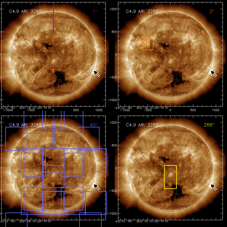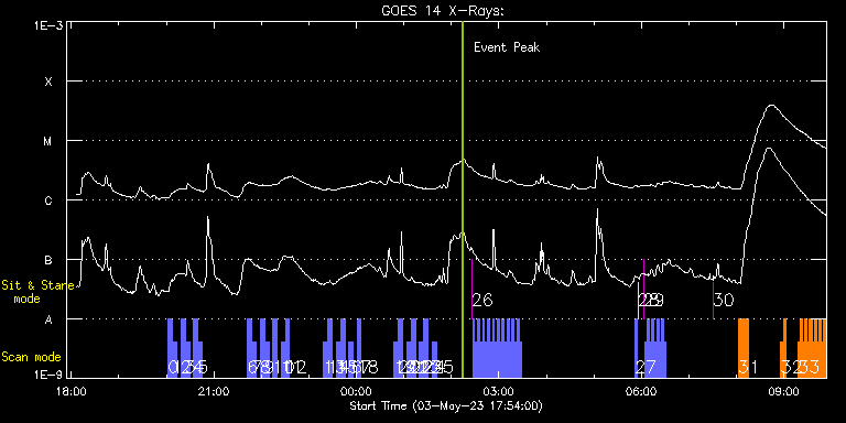 EIS Observation timeline overlay to GOES-Xray curve Code 1" 2" 40" 266" EIS Observations list for this event: STUDY ACRONYM ID DATE OBSERVED DESCRIPTION NOAA# TARGET 0 full_sun_slot_scan_2 | 86066 | 2023/05/03 20:02:19 | Full Sun slot scan for support of EVE | | Quiet Sun TIMELINE ID DATE OBSERVED FITS FILE XCEN (+W/-E) YCEN (+N/-S) DUR ----------------------------------------------------------------------------------------------------------------- 86066 | 2023/05/03 20:02:19.000 | eis_l0_20230503_200219.fits.gz | 936.85 | 164.92 | 5m28s 1 full_sun_slot_scan_2 | 86067 | 2023/05/03 20:07:52 | Full Sun slot scan for support of EVE | | Quiet Sun TIMELINE ID DATE OBSERVED FITS FILE XCEN (+W/-E) YCEN (+N/-S) DUR ----------------------------------------------------------------------------------------------------------------- 86067 | 2023/05/03 20:07:52.000 | eis_l0_20230503_200752.fits.gz | 936.69 | -778.85 | 5m27s 2 full_sun_slot_scan_2 | 86068 | 2023/05/03 20:18:13 | Full Sun slot scan for support of EVE | 3289 | Quiet Sun TIMELINE ID DATE OBSERVED FITS FILE XCEN (+W/-E) YCEN (+N/-S) DUR ----------------------------------------------------------------------------------------------------------------- 86068 | 2023/05/03 20:18:13.000 | eis_l0_20230503_201813.fits.gz | 468.65 | 165.00 | 5m27s 3 full_sun_slot_scan_2 | 86069 | 2023/05/03 20:23:45 | Full Sun slot scan for support of EVE | | Quiet Sun TIMELINE ID DATE OBSERVED FITS FILE XCEN (+W/-E) YCEN (+N/-S) DUR ----------------------------------------------------------------------------------------------------------------- 86069 | 2023/05/03 20:23:45.000 | eis_l0_20230503_202345.fits.gz | 468.65 | -779.00 | 5m27s 4 full_sun_slot_scan_2 | 86070 | 2023/05/03 20:34:13 | Full Sun slot scan for support of EVE | | Quiet Sun TIMELINE ID DATE OBSERVED FITS FILE XCEN (+W/-E) YCEN (+N/-S) DUR ----------------------------------------------------------------------------------------------------------------- 86070 | 2023/05/03 20:34:13.000 | eis_l0_20230503_203413.fits.gz | 0.61 | 165.08 | 5m27s 5 full_sun_slot_scan_2 | 86071 | 2023/05/03 20:39:45 | Full Sun slot scan for support of EVE | | Quiet Sun TIMELINE ID DATE OBSERVED FITS FILE XCEN (+W/-E) YCEN (+N/-S) DUR ----------------------------------------------------------------------------------------------------------------- 86071 | 2023/05/03 20:39:45.000 | eis_l0_20230503_203945.fits.gz | 0.68 | -778.92 | 5m26s 6 full_sun_slot_scan_2 | 86072 | 2023/05/03 21:42:43 | Full Sun slot scan for support of EVE | 3293 | Quiet Sun TIMELINE ID DATE OBSERVED FITS FILE XCEN (+W/-E) YCEN (+N/-S) DUR ----------------------------------------------------------------------------------------------------------------- 86072 | 2023/05/03 21:42:43.000 | eis_l0_20230503_214243.fits.gz | -467.28 | 165.00 | 5m27s 7 full_sun_slot_scan_2 | 86073 | 2023/05/03 21:48:15 | Full Sun slot scan for support of EVE | | Quiet Sun TIMELINE ID DATE OBSERVED FITS FILE XCEN (+W/-E) YCEN (+N/-S) DUR ----------------------------------------------------------------------------------------------------------------- 86073 | 2023/05/03 21:48:15.000 | eis_l0_20230503_214815.fits.gz | -467.20 | -779.00 | 5m27s 8 full_sun_slot_scan_2 | 86074 | 2023/05/03 21:58:43 | Full Sun slot scan for support of EVE | | Quiet Sun TIMELINE ID DATE OBSERVED FITS FILE XCEN (+W/-E) YCEN (+N/-S) DUR ----------------------------------------------------------------------------------------------------------------- 86074 | 2023/05/03 21:58:43.000 | eis_l0_20230503_215843.fits.gz | -9868.71 | -9797.70 | 5m27s 9 full_sun_slot_scan_2 | 86075 | 2023/05/03 22:04:15 | Full Sun slot scan for support of EVE | | Quiet Sun TIMELINE ID DATE OBSERVED FITS FILE XCEN (+W/-E) YCEN (+N/-S) DUR ----------------------------------------------------------------------------------------------------------------- 86075 | 2023/05/03 22:04:15.000 | eis_l0_20230503_220415.fits.gz | -9868.71 | -10741.70 | 5m27s 10 full_sun_slot_scan_2 | 86076 | 2023/05/03 22:14:43 | Full Sun slot scan for support of EVE | | Quiet Sun TIMELINE ID DATE OBSERVED FITS FILE XCEN (+W/-E) YCEN (+N/-S) DUR ----------------------------------------------------------------------------------------------------------------- 86076 | 2023/05/03 22:14:43.000 | eis_l0_20230503_221443.fits.gz | 773.01 | 635.05 | 5m27s 11 full_sun_slot_scan_2 | 86081 | 2023/05/03 22:24:43 | Full Sun slot scan for support of EVE | | Quiet Sun TIMELINE ID DATE OBSERVED FITS FILE XCEN (+W/-E) YCEN (+N/-S) DUR ----------------------------------------------------------------------------------------------------------------- 86081 | 2023/05/03 22:24:43.000 | eis_l0_20230503_222443.fits.gz | 411.80 | 1012.25 | 5m27s 12 full_sun_slot_scan_2 | 86082 | 2023/05/03 22:30:15 | Full Sun slot scan for support of EVE | 3295 | Quiet Sun TIMELINE ID DATE OBSERVED FITS FILE XCEN (+W/-E) YCEN (+N/-S) DUR ----------------------------------------------------------------------------------------------------------------- 86082 | 2023/05/03 22:30:15.000 | eis_l0_20230503_223015.fits.gz | 411.80 | 68.10 | 5m26s 13 full_sun_slot_scan_2 | 86083 | 2023/05/03 23:18:43 | Full Sun slot scan for support of EVE | | Quiet Sun TIMELINE ID DATE OBSERVED FITS FILE XCEN (+W/-E) YCEN (+N/-S) DUR ----------------------------------------------------------------------------------------------------------------- 86083 | 2023/05/03 23:18:43.000 | eis_l0_20230503_231843.fits.gz | 0.68 | 1106.19 | 5m27s 14 full_sun_slot_scan_2 | 86084 | 2023/05/03 23:24:15 | Full Sun slot scan for support of EVE | | Quiet Sun TIMELINE ID DATE OBSERVED FITS FILE XCEN (+W/-E) YCEN (+N/-S) DUR ----------------------------------------------------------------------------------------------------------------- 86084 | 2023/05/03 23:24:15.000 | eis_l0_20230503_232415.fits.gz | 0.76 | 162.03 | 5m27s 15 full_sun_slot_scan_2 | 86085 | 2023/05/03 23:34:43 | Full Sun slot scan for support of EVE | | Quiet Sun TIMELINE ID DATE OBSERVED FI
