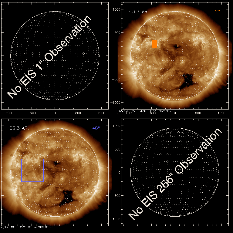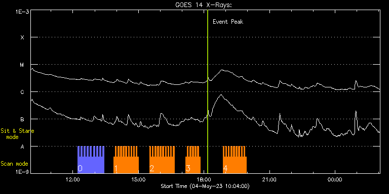 EIS Observation timeline overlay to GOES-Xray curve Code 1" 2" 40" 266" EIS Observations list for this event: STUDY ACRONYM ID DATE OBSERVED DESCRIPTION NOAA# TARGET 0 PRY_slot_context_v4 | 86129 | 2023/05/04 12:13:20 | Test of pry_slot_context_v4 | 3293 | Active Region TIMELINE ID DATE OBSERVED FITS FILE XCEN (+W/-E) YCEN (+N/-S) DUR ----------------------------------------------------------------------------------------------------------------- 86129 | 2023/05/04 12:13:20.000 | eis_l0_20230504_121320.fits.gz | -481.40 | 35.03 | 4m11s 86129 | 2023/05/04 12:17:35.000 | eis_l0_20230504_121735.fits.gz | -480.86 | 34.96 | 4m12s 86129 | 2023/05/04 12:21:51.000 | eis_l0_20230504_122151.fits.gz | -480.32 | 34.88 | 4m12s 86129 | 2023/05/04 12:26:07.000 | eis_l0_20230504_122607.fits.gz | -479.86 | 34.96 | 4m11s 86129 | 2023/05/04 12:30:22.000 | eis_l0_20230504_123022.fits.gz | -479.24 | 34.96 | 4m12s 86129 | 2023/05/04 12:34:38.000 | eis_l0_20230504_123438.fits.gz | -478.62 | 34.88 | 4m12s 86129 | 2023/05/04 12:38:54.000 | eis_l0_20230504_123854.fits.gz | -478.16 | 34.96 | 4m11s 86129 | 2023/05/04 12:43:10.000 | eis_l0_20230504_124310.fits.gz | -477.62 | 35.03 | 4m11s 86129 | 2023/05/04 12:47:25.000 | eis_l0_20230504_124725.fits.gz | -477.00 | 34.96 | 4m12s 86129 | 2023/05/04 12:51:41.000 | eis_l0_20230504_125141.fits.gz | -476.46 | 34.96 | 4m12s 86129 | 2023/05/04 12:55:57.000 | eis_l0_20230504_125557.fits.gz | -475.92 | 35.03 | 4m11s 86129 | 2023/05/04 13:00:12.000 | eis_l0_20230504_130012.fits.gz | -475.38 | 35.03 | 4m12s 86129 | 2023/05/04 13:04:28.000 | eis_l0_20230504_130428.fits.gz | -474.76 | 35.03 | 4m12s 86129 | 2023/05/04 13:08:44.000 | eis_l0_20230504_130844.fits.gz | -474.22 | 35.03 | 4m11s 86129 | 2023/05/04 13:12:59.000 | eis_l0_20230504_131259.fits.gz | -473.68 | 35.03 | 4m12s 86129 | 2023/05/04 13:17:15.000 | eis_l0_20230504_131715.fits.gz | -473.06 | 35.11 | 4m12s 86129 | 2023/05/04 13:21:31.000 | eis_l0_20230504_132131.fits.gz | -472.52 | 35.11 | 4m11s 1 HH_Flare_raster_v6 | 86130 | 2023/05/04 13:52:34 | Major flare watch | | Flare TIMELINE ID DATE OBSERVED FITS FILE XCEN (+W/-E) YCEN (+N/-S) DUR ----------------------------------------------------------------------------------------------------------------- 86130 | 2023/05/04 13:52:34.000 | eis_l0_20230504_135234.fits.gz | -455.68 | 255.42 | 3m31s 86130 | 2023/05/04 13:56:08.000 | eis_l0_20230504_135608.fits.gz | -455.14 | 255.27 | 3m32s 86130 | 2023/05/04 13:59:43.000 | eis_l0_20230504_135943.fits.gz | -454.76 | 255.27 | 3m31s 86130 | 2023/05/04 14:03:17.000 | eis_l0_20230504_140317.fits.gz | -454.29 | 255.34 | 3m30s 86130 | 2023/05/04 14:06:50.000 | eis_l0_20230504_140650.fits.gz | -453.83 | 255.34 | 3m31s 86130 | 2023/05/04 14:10:24.000 | eis_l0_20230504_141024.fits.gz | -453.29 | 255.27 | 3m32s 86130 | 2023/05/04 14:13:59.000 | eis_l0_20230504_141359.fits.gz | -452.90 | 255.27 | 3m31s 86130 | 2023/05/04 14:17:33.000 | eis_l0_20230504_141733.fits.gz | -452.44 | 255.34 | 3m31s 86130 | 2023/05/04 14:21:07.000 | eis_l0_20230504_142107.fits.gz | -451.90 | 255.34 | 3m32s 86130 | 2023/05/04 14:24:42.000 | eis_l0_20230504_142442.fits.gz | -451.43 | 255.34 | 3m31s 86130 | 2023/05/04 14:28:16.000 | eis_l0_20230504_142816.fits.gz | -450.97 | 255.34 | 3m31s 86130 | 2023/05/04 14:31:50.000 | eis_l0_20230504_143150.fits.gz | -450.51 | 255.34 | 3m32s 86130 | 2023/05/04 14:35:25.000 | eis_l0_20230504_143525.fits.gz | -450.04 | 255.42 | 3m31s 86130 | 2023/05/04 14:38:59.000 | eis_l0_20230504_143859.fits.gz | -449.50 | 255.42 | 3m31s 86130 | 2023/05/04 14:42:32.000 | eis_l0_20230504_144232.fits.gz | -449.12 | 255.50 | 3m31s 86130 | 2023/05/04 14:46:06.000 | eis_l0_20230504_144606.fits.gz | -448.58 | 255.42 | 3m31s 86130 | 2023/05/04 14:49:40.000 | eis_l0_20230504_144940.fits.gz | -448.11 | 255.42 | 3m32s 86130 | 2023/05/04 14:53:15.000 | eis_l0_20230504_145315.fits.gz | -447.65 | 255.42 | 3m32s 86130 | 2023/05/04 14:56:49.000 | eis_l0_20230504_145649.fits.gz | -447.18 | 255.58 | 3m32s 2 HH_Flare_raster_v6 | 86131 | 2023/05/04 15:30:40 | Major flare watch | | Flare TIMELINE ID DATE OBSERVED FITS FILE XCEN (+W/-E) YCEN (+N/-S) DUR ----------------------------------------------------------------------------------------------------------------- 86131 | 2023/05/04 15:30:40.000 | eis_l0_20230504_153040.fits.gz | -442.63 | 255.73 | 3m32s 86131 | 2023/05/04 15:34:15.000 | eis_l0_20230504_153415.fits.gz | -442.16 | 255.65 | 3m32s 86131 | 2023/05/04 15:37:50.000 | eis_l0_20230504_153750.fits.gz | -441.70 | 255.65 | 3m31s 86131 | 2023/05/04 15:41:24.000 | eis_l0_20230504_154124.fits.gz | -441.24 | 255.65 | 3m32s 86131 | 2023/05/04 15:44:58.000 | eis_l0_20230504_154458.fits.gz | -440.77 | 255.73 | 3m32s 86131 | 2023/05/04 15:48:32.000 | eis_l0_20230504_154832.fits.gz | -440.23 | 255.65 | 3m31s 86131 | 2023/05/04 15:52:06.000 | eis_l0_20230504_155206.fits.gz | -439.85 | 255.58 | 3m32s 86131 | 2023/05/04 15:55:41.000 | eis_l0_20230504_155541.fits.gz | -439.38 | 255.73 | 3m31s 86131 | 2023/05/04 15:59:15.000 | eis_l0_20230504_155915.fits.gz | -438.84 | 255.65 | 3m32s 86131 | 2023/05/04 16:02:49.000 | eis_l0_20230504_160249.fits.gz | -438.38 | 255.73 | 3m32s 86131 | 2023/05/04 16:06:24.000 | eis_l0_20230504_160624.fits.gz | -437.92 | 255.73 | 3m31s 86131 | 2023/05/04 16:09:58.000 | eis_l0_20230504_160958.fits.gz | -437.45 | 255.65 | 3m31s 86131 | 2023/05/04 16:13:32.000 | eis_l0_20230504_161332.fits.gz | -436.99 | 255.73 | 3m31s 86131 | 2023/05/04 16:17:06.000 | eis_l0_20230504_161706.fits.gz | -436.52 | 255.81 | 3m32s 86131 | 2023/05/04 16:20:41.000 | eis_l0_20230504_162041.fits.gz | -436.06 | 255.81 | 3m31s 86131 | 2023/05/04 16:24:15.000 | eis_l0_20230504_162415.fits.gz | -435.52 | 255.81 | 3m31s 86131 | 2023/05/04 16:27:49.000 | eis_l0_20230504_162749.fits.gz | -435.06 | 255.81 | 3m31s 86131 | 2023/05/04 16:31:23.000 | eis_l0_20230504_163123.fits.gz | -434.52 | 255.81 | 3m32s 86131 | 2023/05/04 16:34:58.000 | eis_l0_20230504_163458.fits.gz | -434.05 |