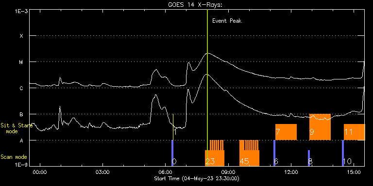 EIS Observation timeline overlay to GOES-Xray curve Code 1" 2" 40" 266" EIS Observations list for this event: STUDY ACRONYM ID DATE OBSERVED DESCRIPTION NOAA# TARGET 0 PRY_slot_contextLITE | 86125 | 2023/05/05 06:18:19 | Pointing Monitoring | | Active Region TIMELINE ID DATE OBSERVED FITS FILE XCEN (+W/-E) YCEN (+N/-S) DUR ----------------------------------------------------------------------------------------------------------------- 86125 | 2023/05/05 06:18:19.000 | eis_l0_20230505_061819.fits.gz | 0.76 | -194.92 | 2m57s 1 XRT_synop_AIA | 86126 | 2023/05/05 06:21:34 | Pointing Monitoring | | Quiet Sun TIMELINE ID DATE OBSERVED FITS FILE XCEN (+W/-E) YCEN (+N/-S) DUR ----------------------------------------------------------------------------------------------------------------- 86126 | 2023/05/05 06:21:34.000 | eis_l0_20230505_062134.fits.gz | 0.59 | -207.08 | 10s 2 HH_AR+FLR_RAS_N03 | 86116 | 2023/05/05 07:54:19 | HOP 401 - dynamics of flux cancellatio | 3296 | Active Region TIMELINE ID DATE OBSERVED FITS FILE XCEN (+W/-E) YCEN (+N/-S) DUR ----------------------------------------------------------------------------------------------------------------- 86116 | 2023/05/05 07:54:19.000 | eis_l0_20230505_075419.fits.gz | -306.40 | 218.51 | 13m18s 3 HH_Flare_60x152f | 86117 | 2023/05/05 08:07:42 | HOP 401 - dynamics of flux cancellatio | 3296 | Flare TIMELINE ID DATE OBSERVED FITS FILE XCEN (+W/-E) YCEN (+N/-S) DUR ----------------------------------------------------------------------------------------------------------------- 86117 | 2023/05/05 08:07:42.000 | eis_l0_20230505_080742.fits.gz | -307.79 | 262.43 | 2m48s 86117 | 2023/05/05 08:10:33.000 | eis_l0_20230505_081033.fits.gz | -307.33 | 262.36 | 2m48s 86117 | 2023/05/05 08:13:24.000 | eis_l0_20230505_081324.fits.gz | -306.95 | 262.43 | 2m48s 86117 | 2023/05/05 08:16:15.000 | eis_l0_20230505_081615.fits.gz | -306.64 | 262.43 | 2m47s 86117 | 2023/05/05 08:19:05.000 | eis_l0_20230505_081905.fits.gz | -306.25 | 262.36 | 2m48s 86117 | 2023/05/05 08:21:56.000 | eis_l0_20230505_082156.fits.gz | -305.79 | 262.43 | 2m48s 86117 | 2023/05/05 08:24:47.000 | eis_l0_20230505_082447.fits.gz | -305.40 | 262.51 | 2m48s 86117 | 2023/05/05 08:27:38.000 | eis_l0_20230505_082738.fits.gz | -305.01 | 262.43 | 2m48s 86117 | 2023/05/05 08:30:28.000 | eis_l0_20230505_083028.fits.gz | -304.63 | 262.43 | 2m48s 86117 | 2023/05/05 08:33:19.000 | eis_l0_20230505_083319.fits.gz | -304.24 | 262.51 | 2m48s 86117 | 2023/05/05 08:36:10.000 | eis_l0_20230505_083610.fits.gz | -303.78 | 262.43 | 2m48s 86117 | 2023/05/05 08:39:00.000 | eis_l0_20230505_083900.fits.gz | -303.39 | 262.51 | 2m48s 86117 | 2023/05/05 08:41:51.000 | eis_l0_20230505_084151.fits.gz | -302.93 | 262.43 | 2m48s 86117 | 2023/05/05 08:44:42.000 | eis_l0_20230505_084442.fits.gz | -302.46 | 262.36 | 2m48s 4 HH_AR+FLR_RAS_N03 | 86118 | 2023/05/05 09:32:13 | HOP 401 - dynamics of flux cancellatio | 3296 | Active Region TIMELINE ID DATE OBSERVED FITS FILE XCEN (+W/-E) YCEN (+N/-S) DUR ----------------------------------------------------------------------------------------------------------------- 86118 | 2023/05/05 09:32:13.000 | eis_l0_20230505_093213.fits.gz | -292.50 | 218.82 | 13m19s 5 HH_Flare_60x152f | 86119 | 2023/05/05 09:45:36 | HOP 401 - dynamics of flux cancellatio | 3296 | Flare TIMELINE ID DATE OBSERVED FITS FILE XCEN (+W/-E) YCEN (+N/-S) DUR ----------------------------------------------------------------------------------------------------------------- 86119 | 2023/05/05 09:45:36.000 | eis_l0_20230505_094536.fits.gz | -293.81 | 262.59 | 2m49s 86119 | 2023/05/05 09:48:28.000 | eis_l0_20230505_094828.fits.gz | -293.43 | 262.59 | 2m47s 86119 | 2023/05/05 09:51:18.000 | eis_l0_20230505_095118.fits.gz | -293.04 | 262.59 | 2m48s 86119 | 2023/05/05 09:54:09.000 | eis_l0_20230505_095409.fits.gz | -292.58 | 262.59 | 2m48s 86119 | 2023/05/05 09:57:00.000 | eis_l0_20230505_095700.fits.gz | -292.19 | 262.59 | 2m48s 86119 | 2023/05/05 09:59:51.000 | eis_l0_20230505_095951.fits.gz | -291.80 | 262.59 | 2m48s 86119 | 2023/05/05 10:02:41.000 | eis_l0_20230505_100241.fits.gz | -291.42 | 262.67 | 2m48s 86119 | 2023/05/05 10:05:32.000 | eis_l0_20230505_100532.fits.gz | -291.03 | 262.67 | 2m48s 86119 | 2023/05/05 10:08:23.000 | eis_l0_20230505_100823.fits.gz | -290.64 | 262.67 | 2m48s 86119 | 2023/05/05 10:11:14.000 | eis_l0_20230505_101114.fits.gz | -290.18 | 262.67 | 2m48s 86119 | 2023/05/05 10:14:04.000 | eis_l0_20230505_101404.fits.gz | -289.80 | 262.67 | 2m49s 86119 | 2023/05/05 10:16:56.000 | eis_l0_20230505_101656.fits.gz | -289.41 | 262.59 | 2m47s 86119 | 2023/05/05 10:19:46.000 | eis_l0_20230505_101946.fits.gz | -288.95 | 262.67 | 2m48s 86119 | 2023/05/05 10:22:37.000 | eis_l0_20230505_102237.fits.gz | -288.56 | 262.59 | 2m49s 86119 | 2023/05/05 10:25:28.000 | eis_l0_20230505_102528.fits.gz | -288.10 | 262.67 | 2m48s 6 PRY_slot_context_v4 | 86133 | 2023/05/05 11:10:20 | Major flare watch | 3293 | Active Region TIMELINE ID DATE OBSERVED FITS FILE XCEN (+W/-E) YCEN (+N/-S) DUR ----------------------------------------------------------------------------------------------------------------- 86133 | 2023/05/05 11:10:20.000 | eis_l0_20230505_111020.fits.gz | -278.88 | 88.90 | 4m11s 7 Flare_SNS_v2 | 86134 | 2023/05/05 11:14:56 | Major flare watch | | Flare TIMELINE ID DATE OBSERVED FITS FILE XCEN (+W/-E) YCEN (+N/-S) DUR ----------------------------------------------------------------------------------------------------------------- 86134 | 2023/05/05 11:14:56.000 | eis_l0_20230505_111456.fits.gz | -278.74 | 256.74 | 1h0m21s 8 PRY_slot_context_v4 | 86141 | 2023/05/05 12:48:19 | Major flare watch | 3293 | Active Region TIMELINE ID DATE OBSERVED FITS FILE XCEN (+W/-E) YCEN (+N/-S) DUR ----------------------------------------------------------------------------------------------------------------- 86141 | 2023/05/05 12:48:19.000 | eis_l0_20230505_124819.fits.gz | -264.82 | 89.13 | 4m11s 9 Flare_SNS_v2 | 86142 | 202